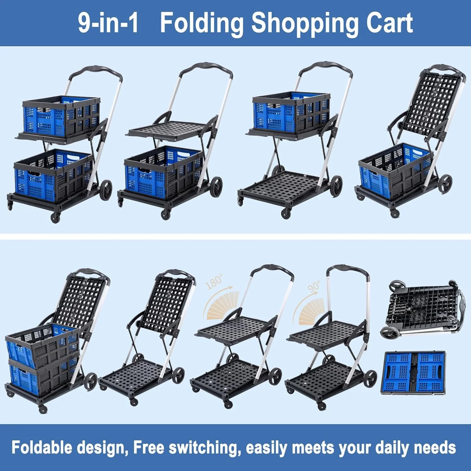 - EASY TO FOLD : Our folding shopping cart allows you to easily unfold and fold the shopping cart by simply pressing the handle button; When not in use, it can be fully folded and placed in any small corner, such as a car trunk or warehouse, to save space