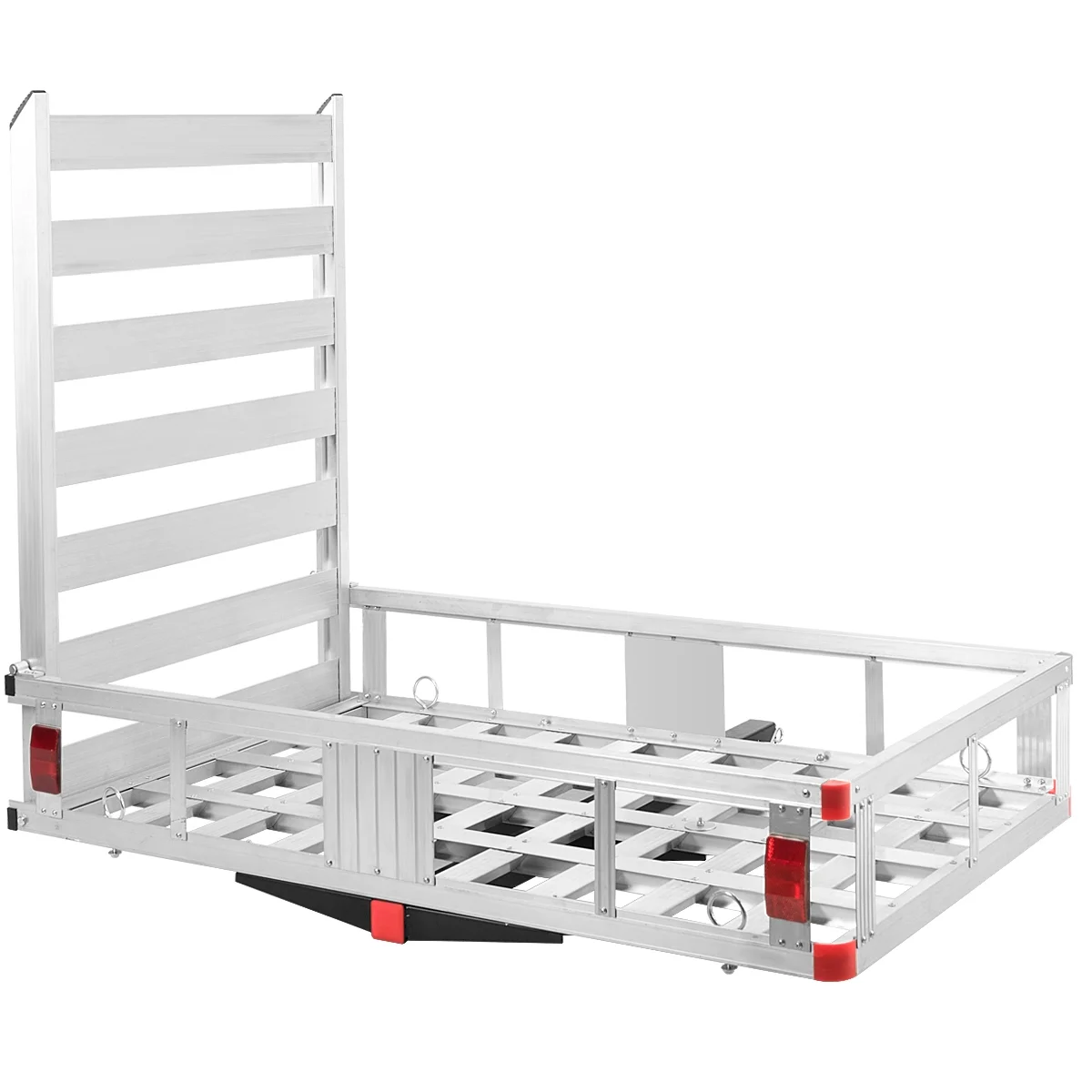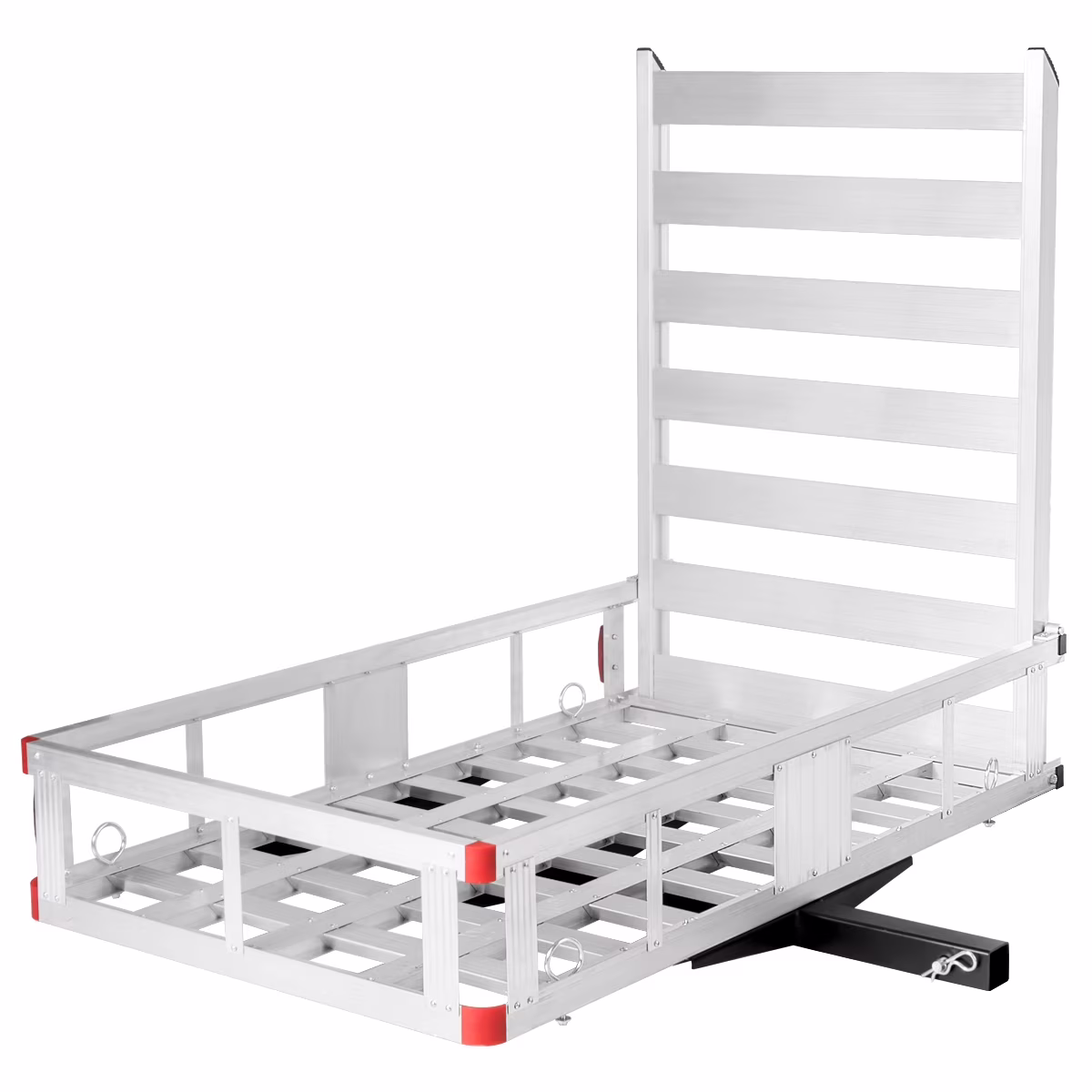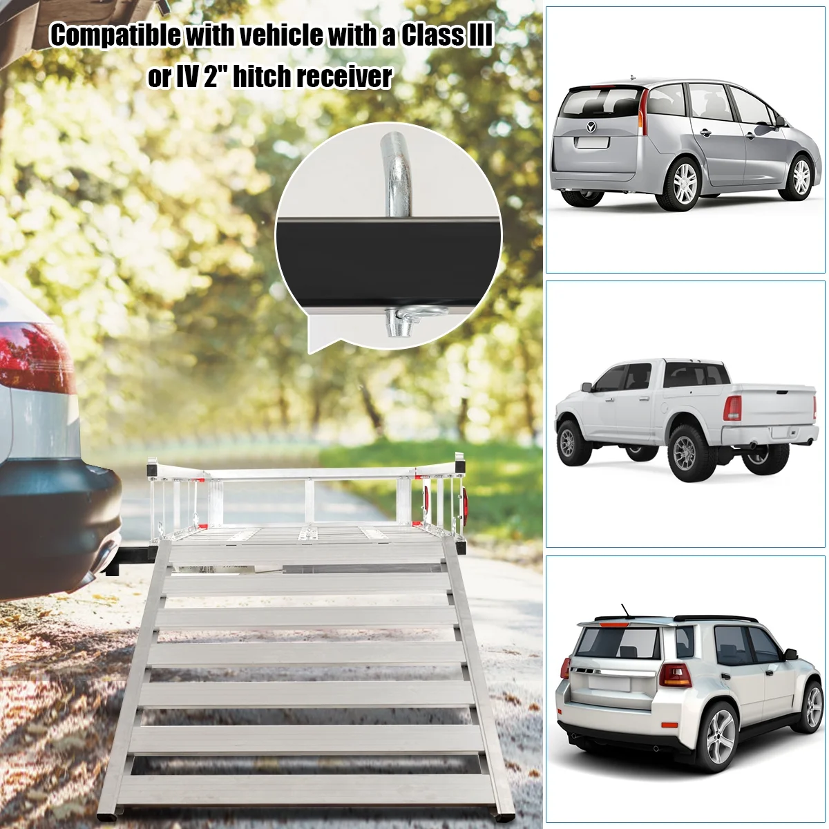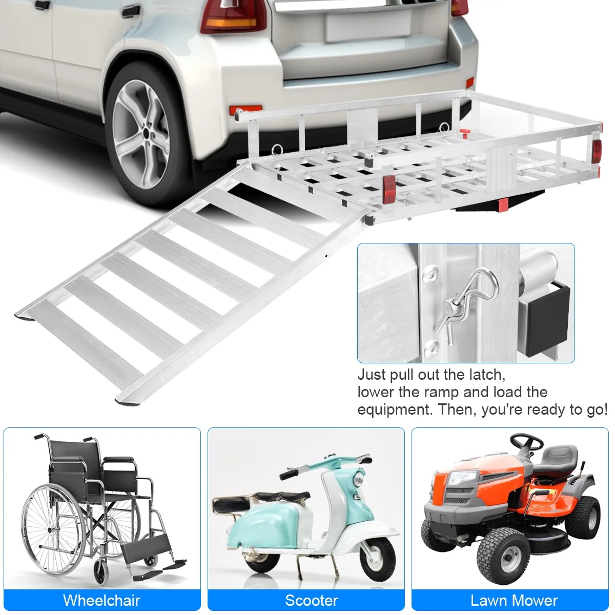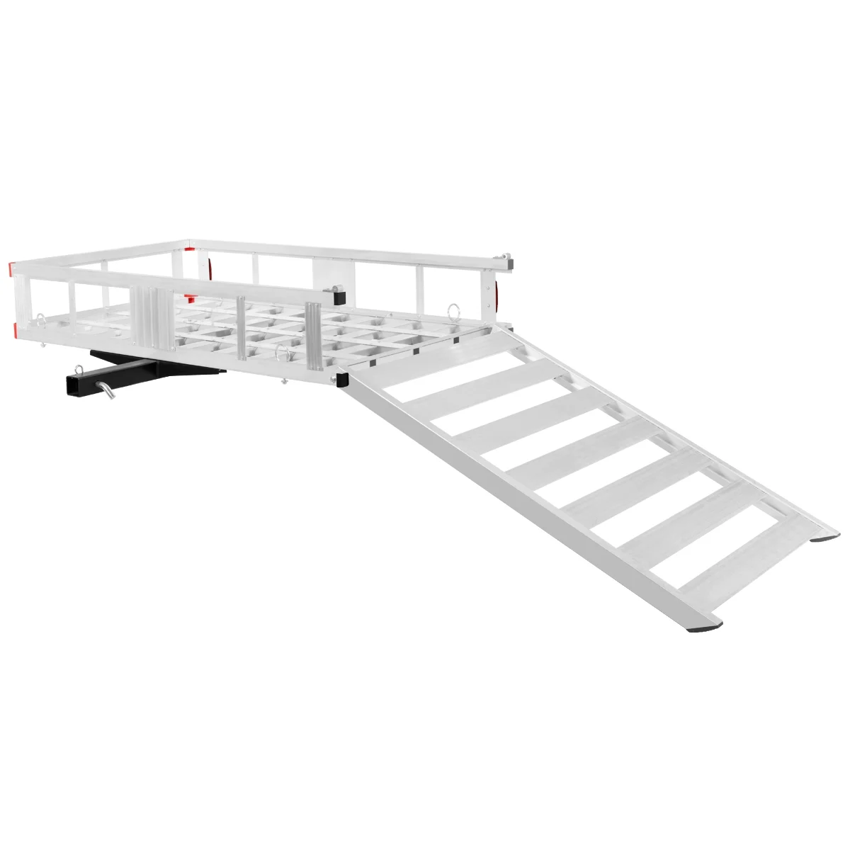 Our hitch-mounted mobility carrier is compatible with most vehicle with a Class III or IV 2'' hitch receiver, and it is easy to assemble. All you have to do is pull out the latch, lower the ramp and load the equipment. Then, you're ready to go! Constructed with heavy duty aluminum structure, it is corrosion resistant and has maximum bearing capacity of 500 lbs. Except for that, it has many safety guarantees, including tie-down points, reflectors and 9'' safety rail.