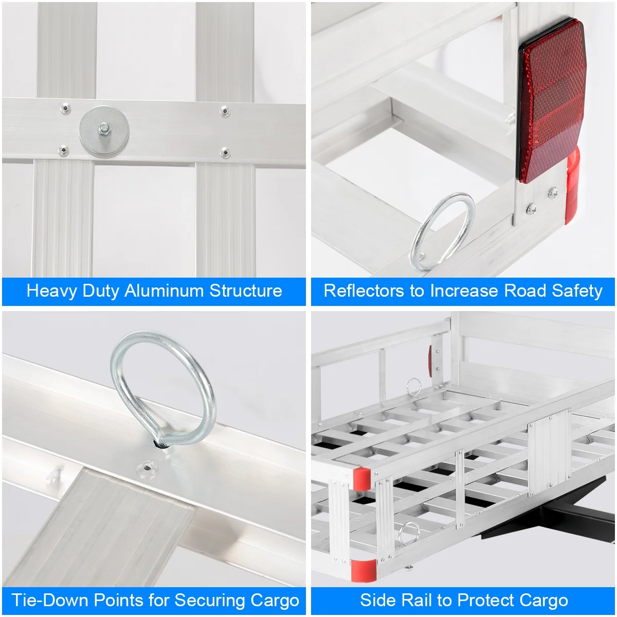 - High Quality Aluminum Material: Constructed with heavy duty aluminum structure, the cargo carrier is rust and corrosion resistant. It has the maximum bearing capacity of 500 lbs, and it weighs 40 lbs.
