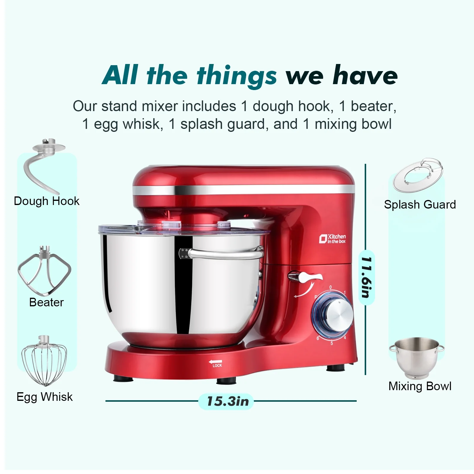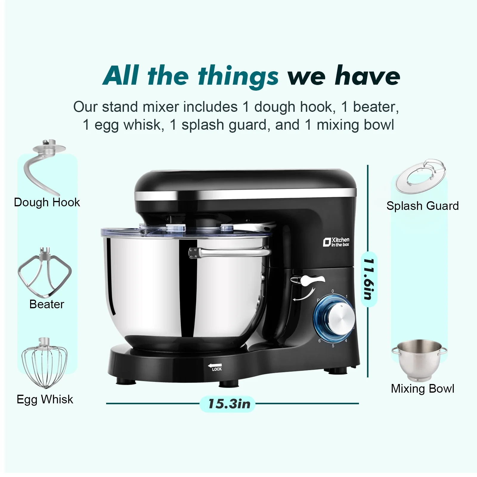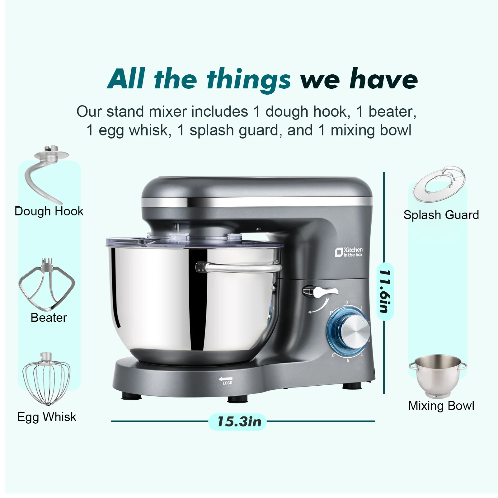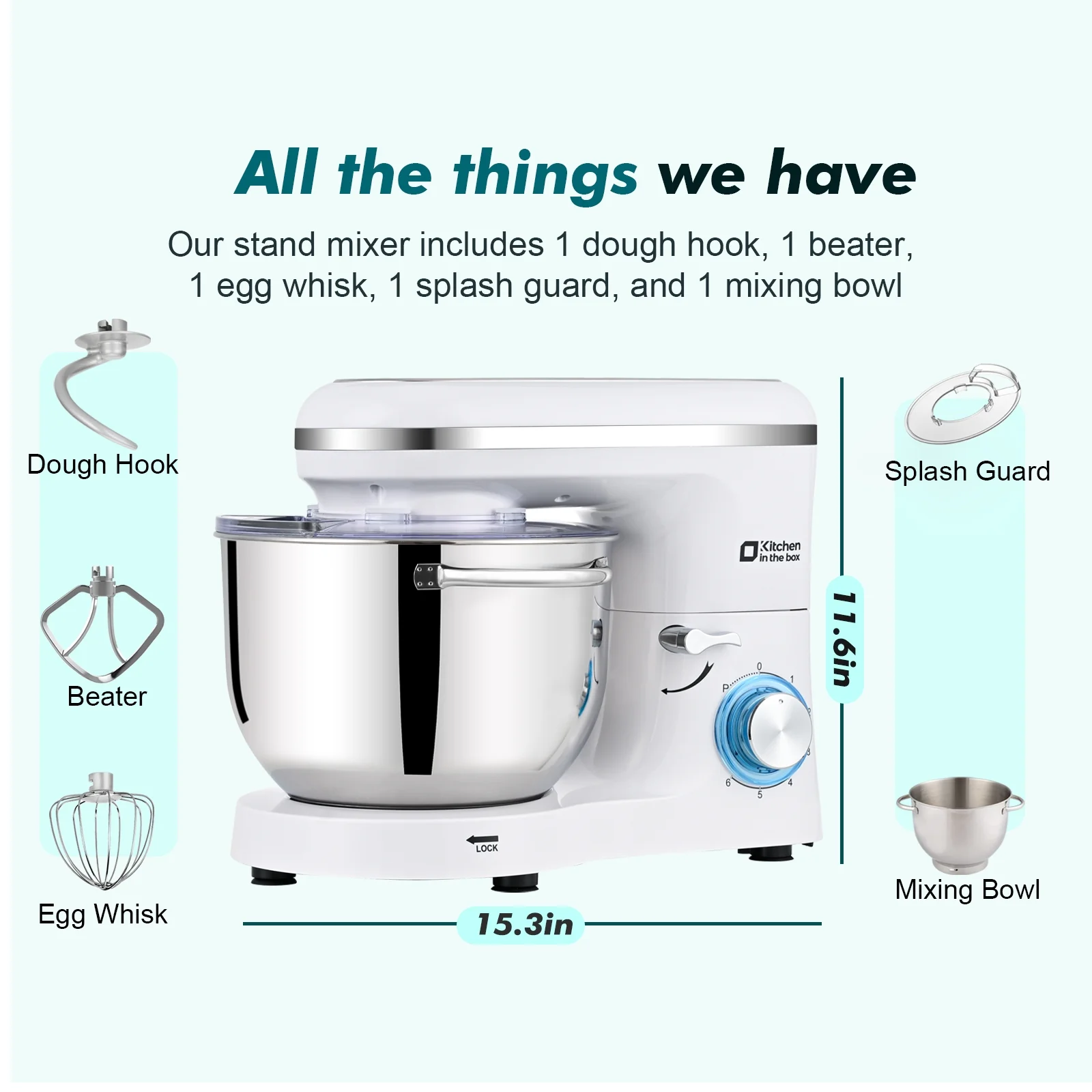The Kitchen in the box Stand Mixer is a powerful, space-saving solution for home chefs. This mixer comes with a 6.5QT stainless steel bowl, capable of handling large batches of food��from up to 4 loaves of bread to 100 cookies��making it perfect for family gatherings and special occasions. The 660W motor provides ample power for mixing, kneading, and whipping, while the 6-speed settings and pulse function offer precise control for any recipe. Its unique square design saves counter space, and all attachments (including a whisk, dough hook, and beater) are dishwasher-safe for easy cleanup. This mixer is ideal for effortless cooking and baking, handling a variety of tasks with ease. Not only does it perform well, but it also serves as a beautiful decoration for your kitchen. It's the perfect gift choice!��6.5QT Large Capacity Bowl�� Our stand mixer comes with a 6.5QT food-grade stainless steel bowl, perfect for handling large quantities of food, reducing the need for multiple batches. The mixer features dual handles and an integrated splash guard, making it easy to hold and clean. ��660W Powerful Motor�� Equipped with a 660W high-performance pure copper motor and a sturdy ABS shell, the mixer can process ingredients quickly and thoroughly. The built-in chip sensor automatically shuts off the mixer when overheating, ensuring safety and reliability. With 6 optimized speeds and a pulse function, the mixer is versatile enough for various recipes and uses. ��6+Pulse Speed and Tilt-Head Design�� This kitchen mixer offers 6-speed control, allowing for everything from slow stirring to fast mixing, ensuring precise results for any recipe. The pulse function reaches maximum speed in just a second, perfect for whipping egg whites. The tilt-head design allows easy installation or removal of the bowl and attachments. ��Multiple Attachments and Anti-Slip Design�� The KITB baking mixer comes with three mixing attachments: a whisk, dough hook, and beater. The anti-slip suction feet keep the mixer stable and secure, even during operation. The stainless steel bowl, whisk, dough hook, and beater are all dishwasher-safe, reducing post-baking kitchen cleanup. ��Ideal Gift and Professional Support�� The near-square body shape saves countertop space while still offering a 6.5QT large capacity, making it easy to store, especially in smaller kitchens, with a sleek, modern look. It makes the perfect Christmas gift for family and friends. If you encounter any issues, feel free to contact our support team, and we will be happy to assist you.