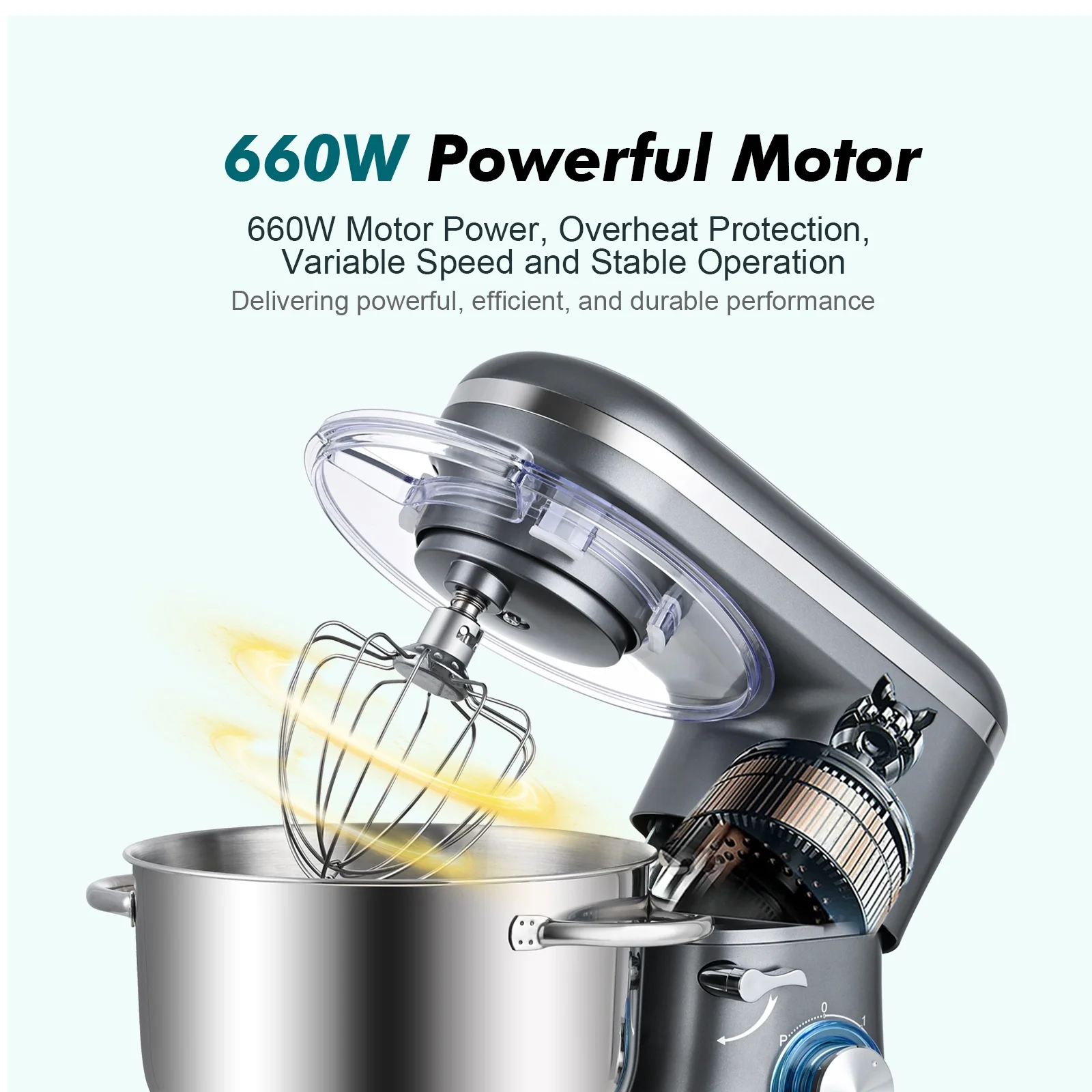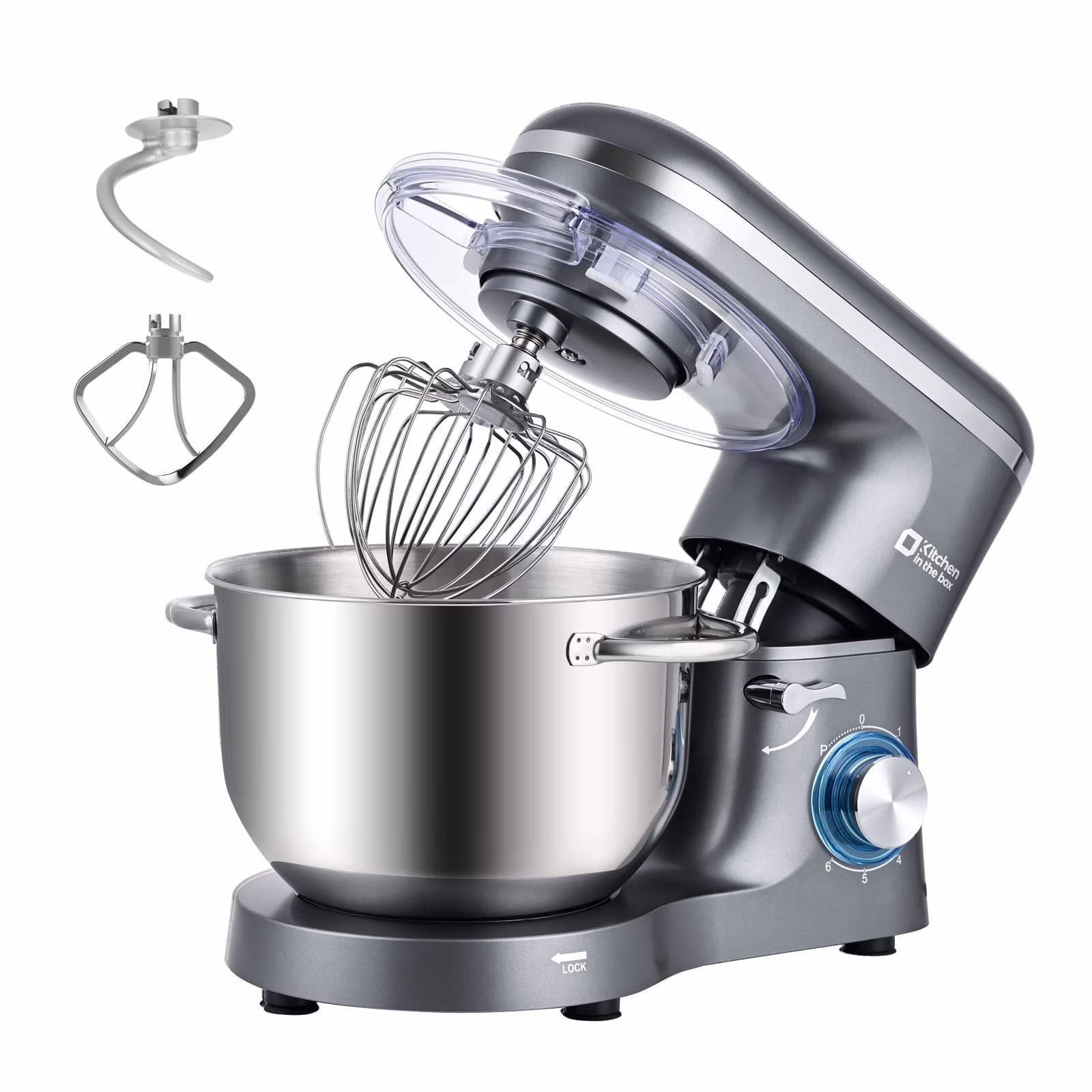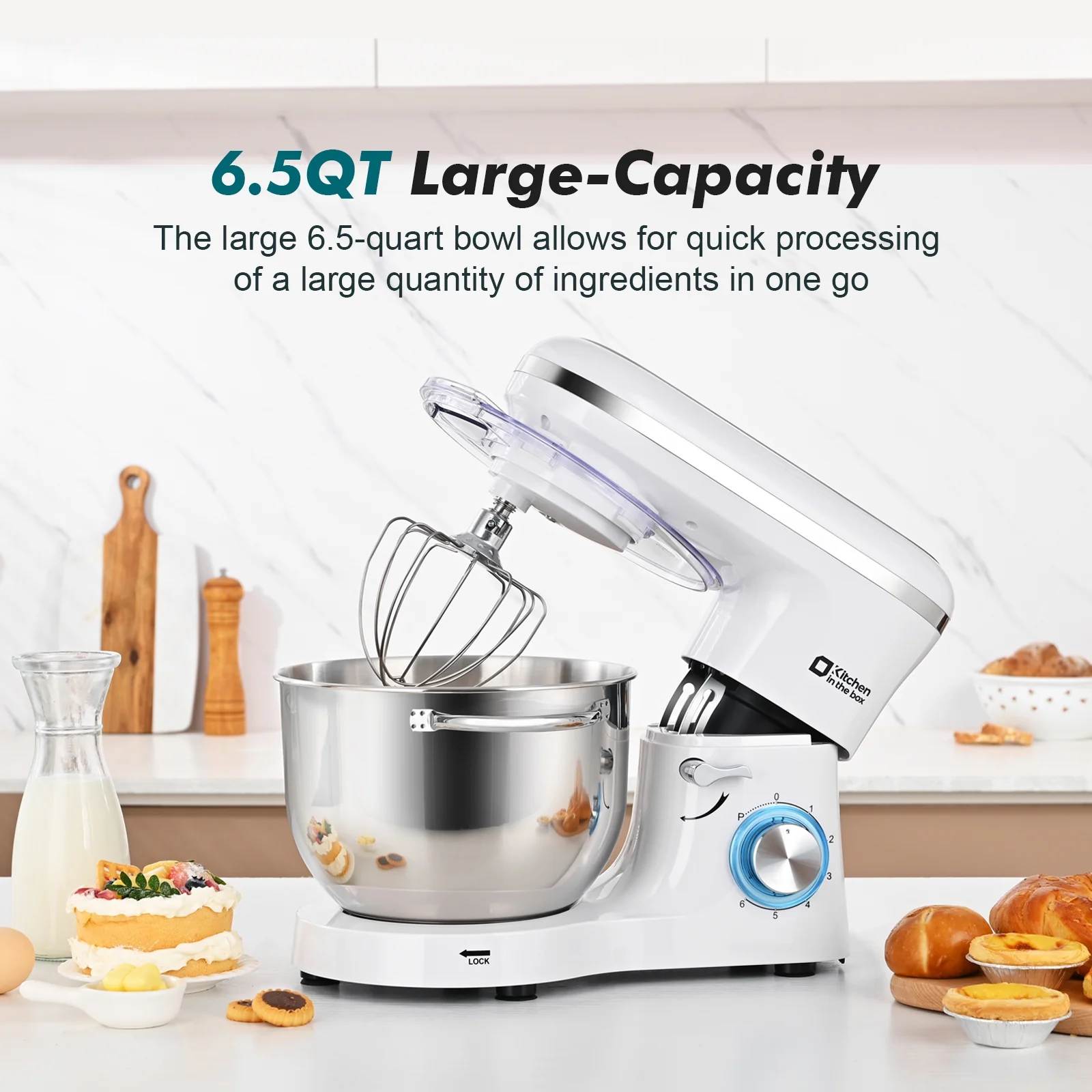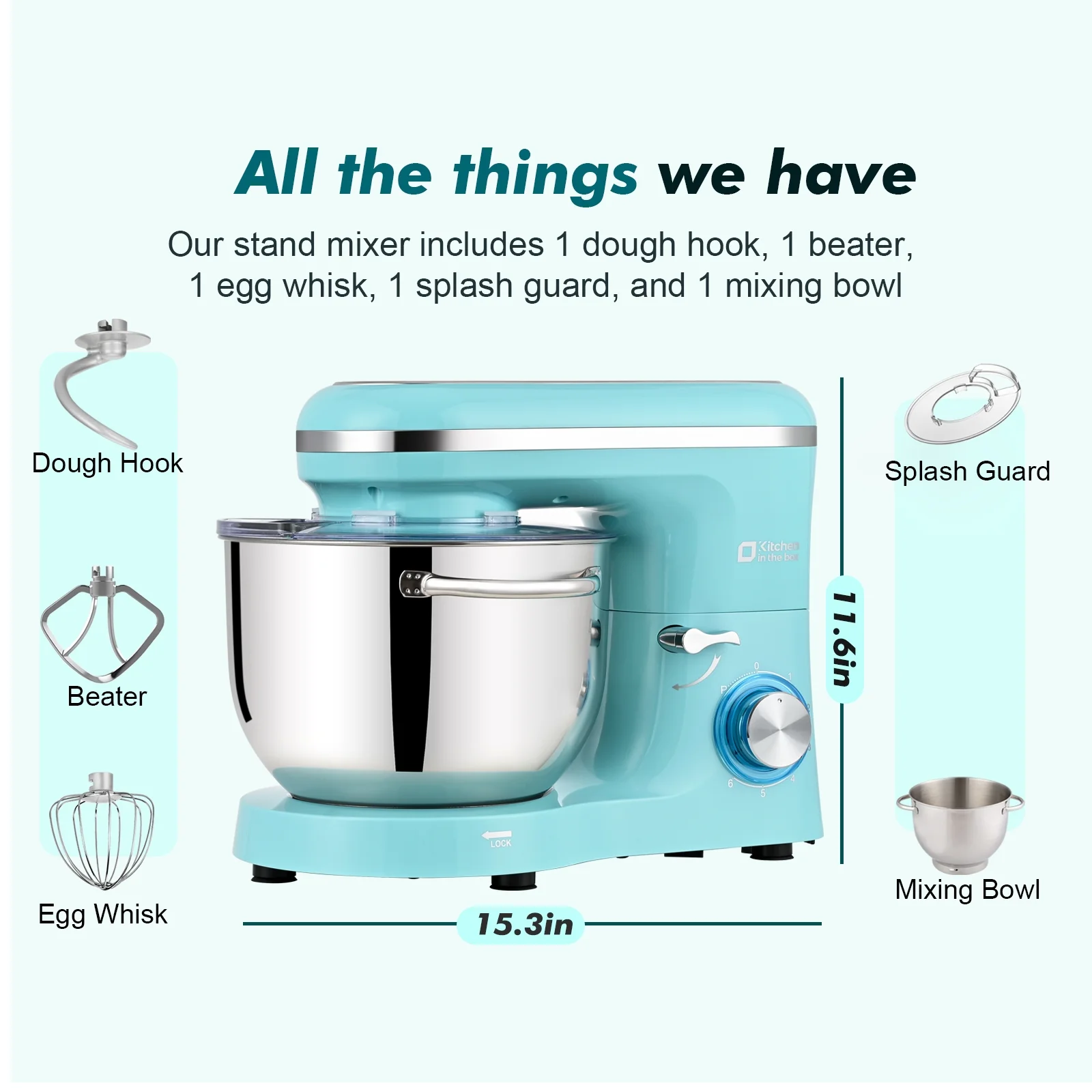 The Kitchen in the box Stand Mixer is a powerful, space-saving solution for home chefs. This mixer comes with a 6.5QT stainless steel bowl, capable of handling large batches of food��from up to 4 loaves of bread to 100 cookies��making it perfect for family gatherings and special occasions. The 660W motor provides ample power for mixing, kneading, and whipping, while the 6-speed settings and pulse function offer precise control for any recipe. Its unique square design saves counter space, and all attachments (including a whisk, dough hook, and beater) are dishwasher-safe for easy cleanup. This mixer is ideal for effortless cooking and baking, handling a variety of tasks with ease. Not only does it perform well, but it also serves as a beautiful decoration for your kitchen. It's the perfect gift choice!��6.5QT Large Capacity Bowl�� Our stand mixer comes with a 6.5QT food-grade stainless steel bowl, perfect for handling large quantities of food, reducing the need for multiple batches. The mixer features dual handles and an integrated splash guard, making it easy to hold and clean. ��660W Powerful Motor�� Equipped with a 660W high-performance pure copper motor and a sturdy ABS shell, the mixer can process ingredients quickly and thoroughly. The built-in chip sensor automatically shuts off the mixer when overheating, ensuring safety and reliability. With 6 optimized speeds and a pulse function, the mixer is versatile enough for various recipes and uses. ��6+Pulse Speed and Tilt-Head Design�� This kitchen mixer offers 6-speed control, allowing for everything from slow stirring to fast mixing, ensuring precise results for any recipe. The pulse function reaches maximum speed in just a second, perfect for whipping egg whites. The tilt-head design allows easy installation or removal of the bowl and attachments. ��Multiple Attachments and Anti-Slip Design�� The KITB baking mixer comes with three mixing attachments: a whisk, dough hook, and beater. The anti-slip suction feet keep the mixer stable and secure, even during operation. The stainless steel bowl, whisk, dough hook, and beater are all dishwasher-safe, reducing post-baking kitchen cleanup. ��Ideal Gift and Professional Support�� The near-square body shape saves countertop space while still offering a 6.5QT large capacity, making it easy to store, especially in smaller kitchens, with a sleek, modern look. It makes the perfect Christmas gift for family and friends. If you encounter any issues, feel free to contact our support team, and we will be happy to assist you.