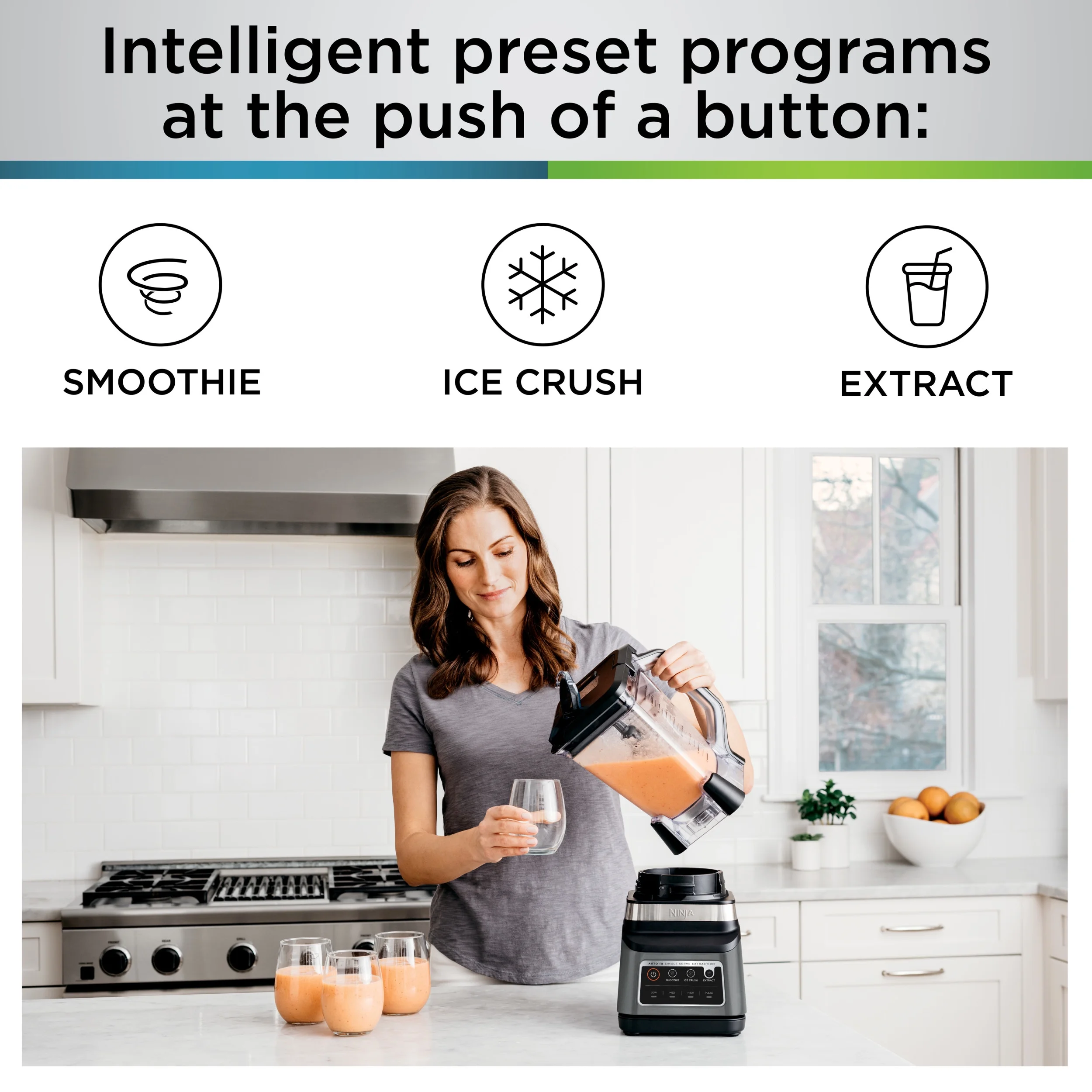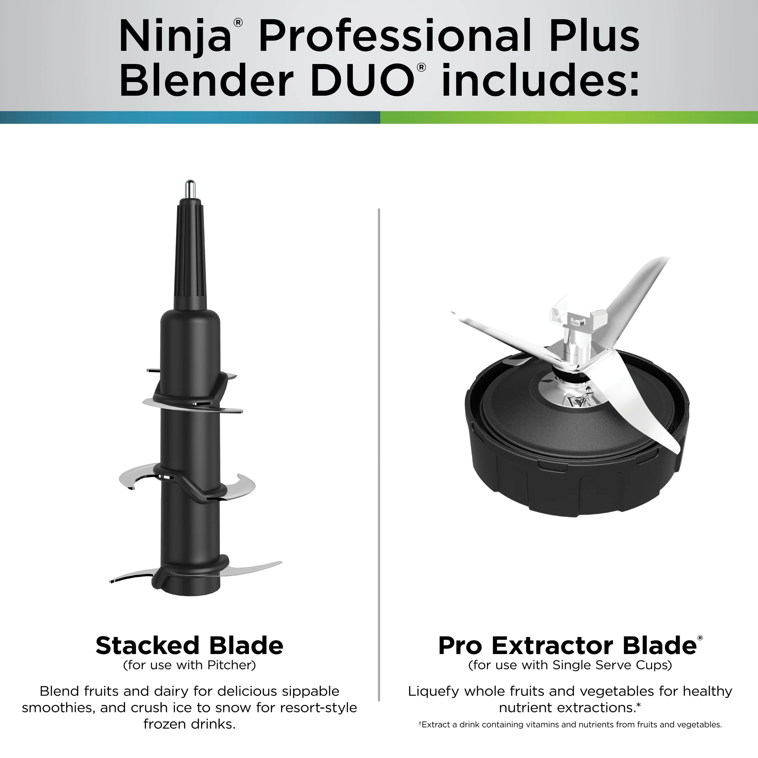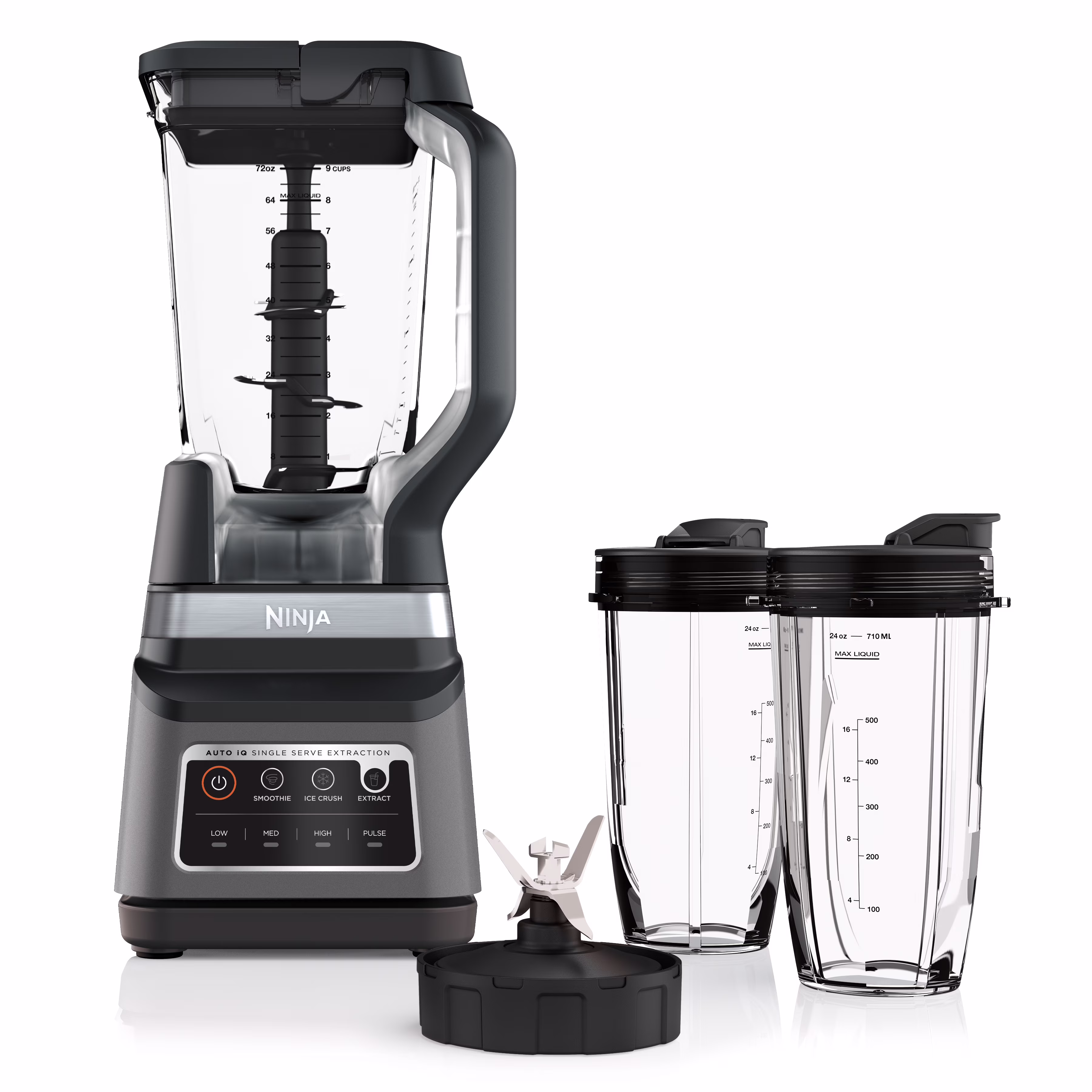 The Ninja Professional Plus Blender DUO with Auto-iQ features a new modern design and a more powerful motor than Ninja's original Professional Blender DUO. Ninja Total Crushing Blades and Pro Extractor Blades Assembly give you perfectly crushed ice for your smoothies, frozen drinks, and nutrient extractions. The 72-oz.Total Crushing Pitcher is great for making large batches for the whole family with 1400 peak watts of professional power. Plus, its single-serve cups with spout lids make it easy to take delicious, nutrient-rich smoothies on the go. Auto-iQ Technology provides preset programs that do the work for you, no guesswork required.