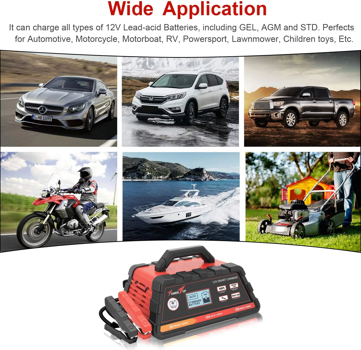 - Fast, Smart Battery Charger: Ideal for charging Automotive, Motorcycle, Marine, RV, PowerSport, Lawn & Garden, and more. Compatible with all types of 12V Leadacid Batteries, including GEL, AGM, and STD
