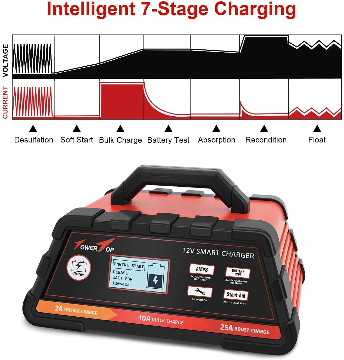 - 7Step Charging Program: Features Desulphation, Soft Start, Bulk Charge, Absorption, Battery Test, Recondition, and Floating to optimize battery power without overcharging or damage