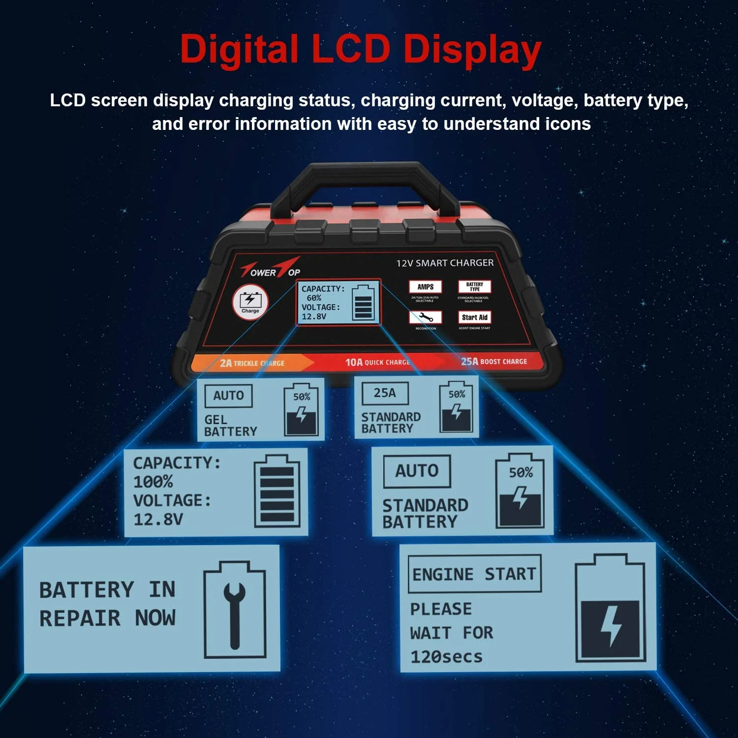 - Auto Detect Systems: Battery reconditioning feature extends battery life. LCD screen displays charging and battery status with easytounderstand icons. Automatically selects charge rate for optimal charging and maintenance
