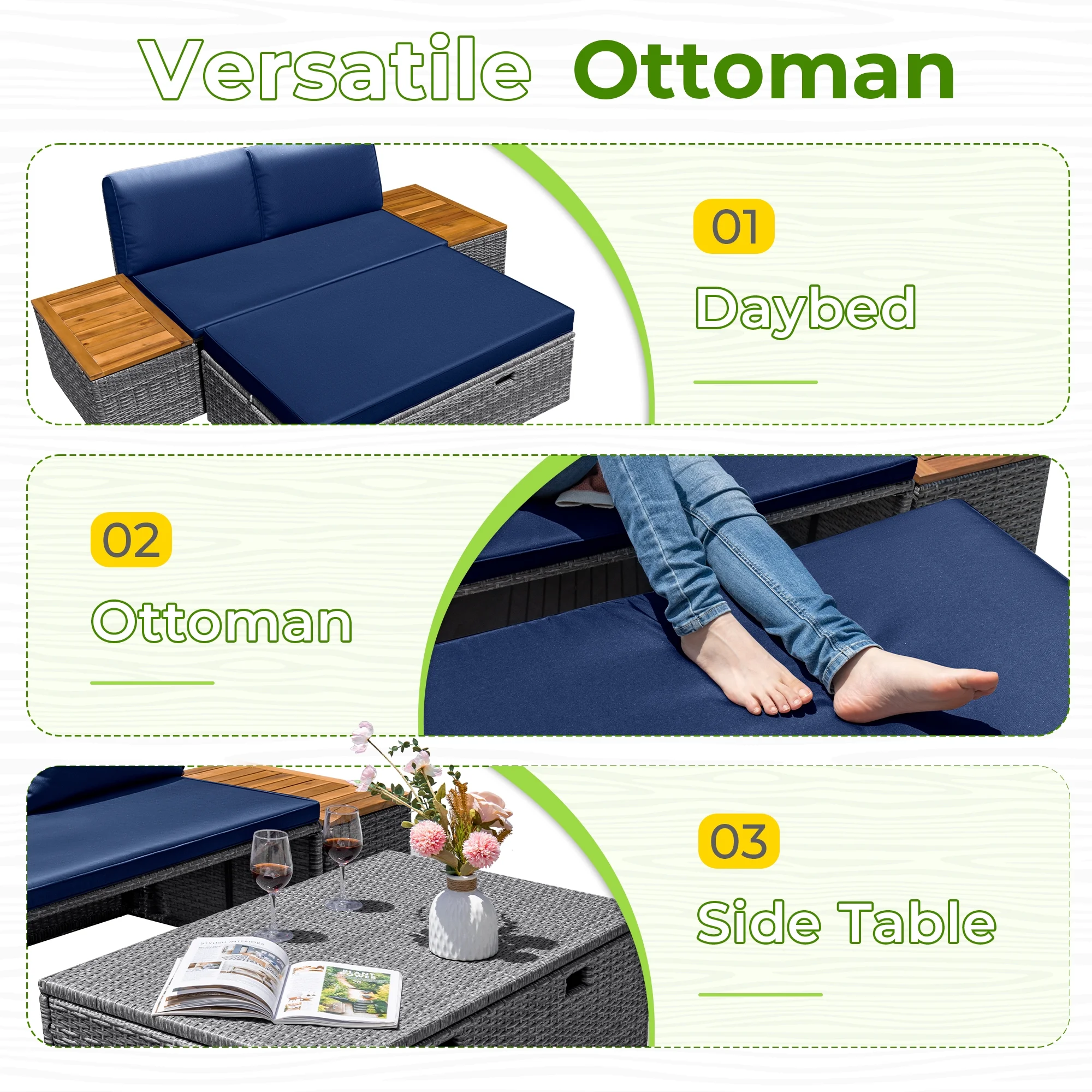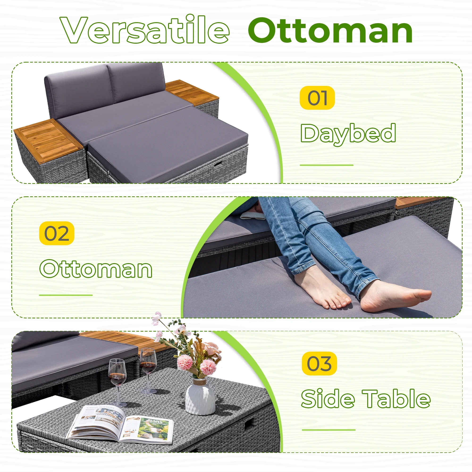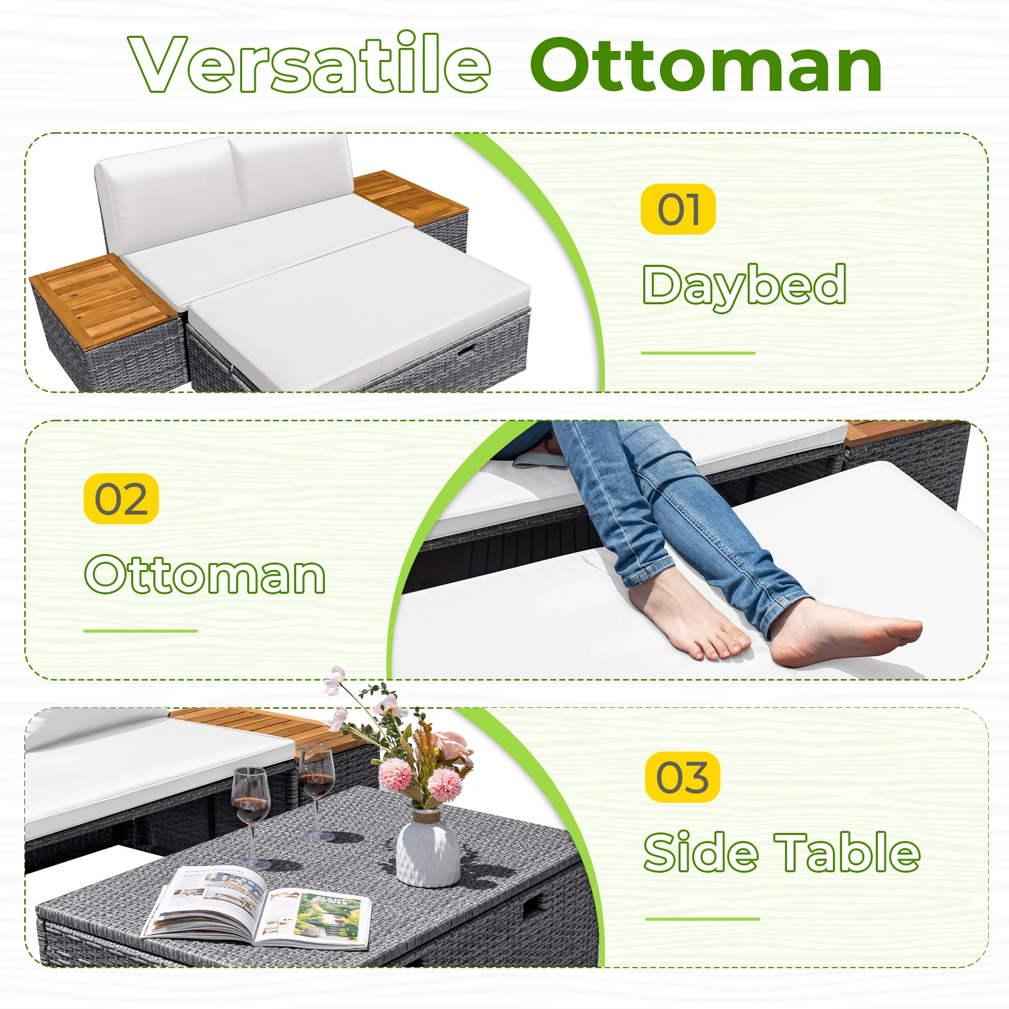 - Versatile ottoman serves multiple purposes: daybed, ottoman, and side table
