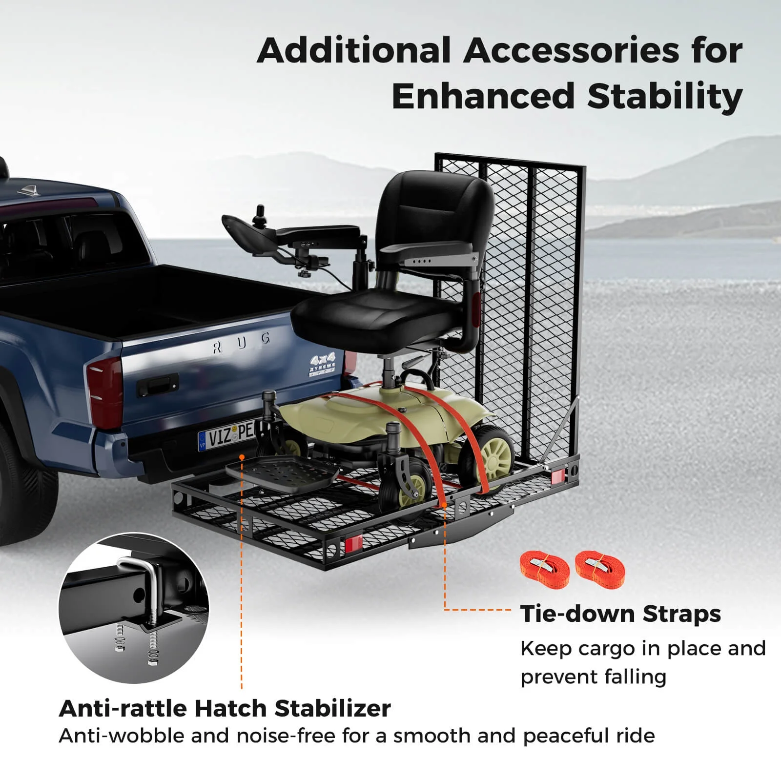 Convenient Mobility: The hitch mount cargo carrier provides a generously sized loading area of 48-3/4" x 27-3/4" (L x W) and supports up to 500 lbs. It is suitable for loading various equipment, such as wheelchairs, scooters, lawn mowers, cargoes, etc. Additional Accessories for Enhanced Stability: The hitch cargo rack is equipped with 2 tie-down straps, helping secure your equipment in place. And there is an anti-rattle hatch stabilizer, making it anti-wobble and noise-free for a smooth and peaceful ride. Foldable Ramp: Featuring a convenient 42�?long folding ramp, this carrier makes loading and unloading equipment a breeze. The ramp is equipped with lockable latches, providing ease of use while ensuring security. Versatile Vehicle Compatibility: The luggage carrier rack is compatible with a 2�?hitch receiver (hitch class III or IV). It is suitable for most vehicles, such as trucks, SUVs, vans, pickups, making it a versatile and practical choice. Reliable Construction: The mobility wheelchair carrier is constructed from a heavy-duty powder-coated metal frame, which is not easy to rust or deform, ensuring long-lasting durability. Besides, it features a raised guardrail and reflectors to enhance visibility to increase road safety.