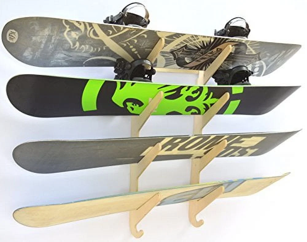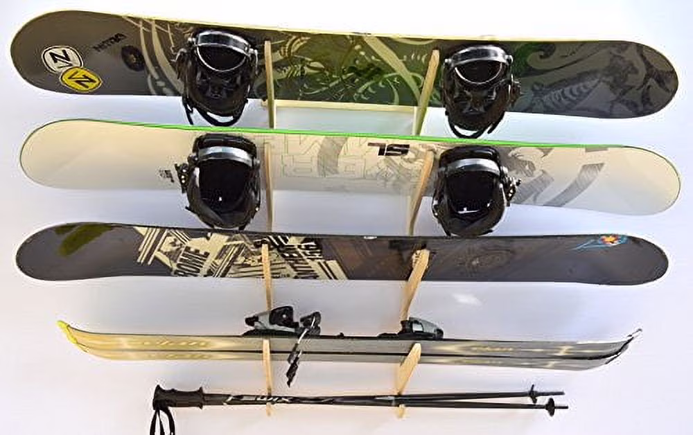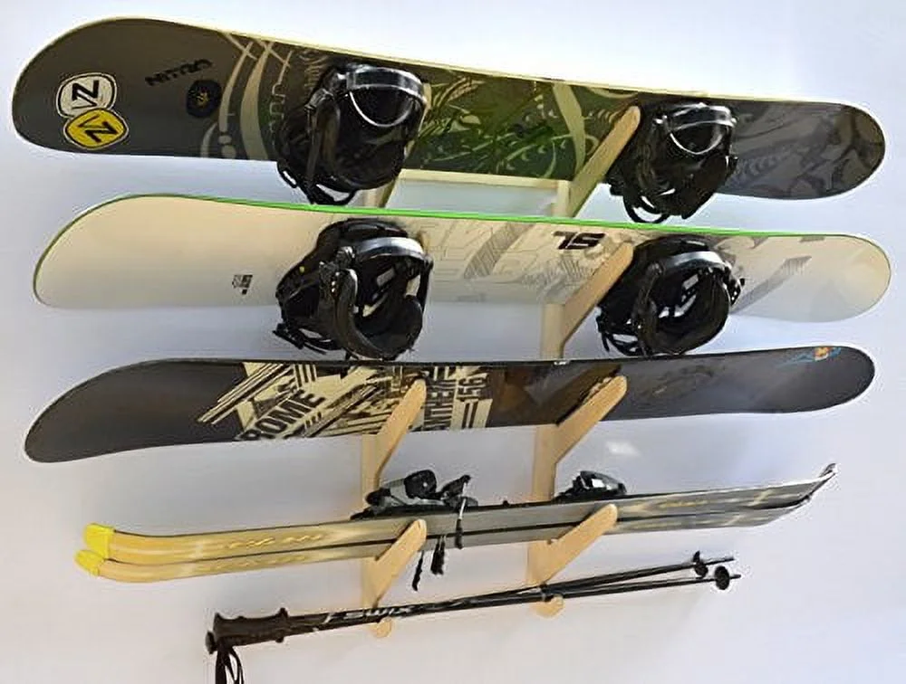 - Holds snowboards with or without bindings, skis, skateboards, and longboards