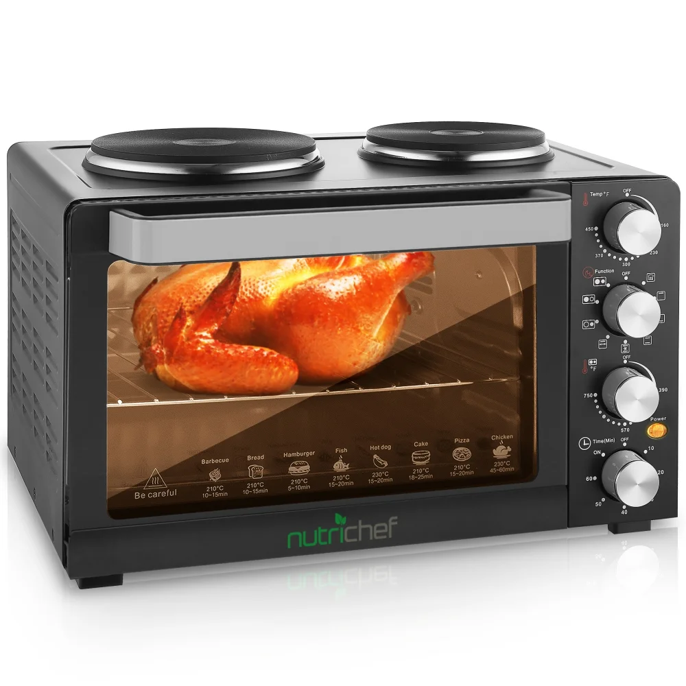 - DUAL HOT PLATES: NutriChefs PKRTO28 is a multifunctional kitchen oven that comes with dual hot plates in large and small. Other than that, it has other versatile cooking styles such as bake on baking tray, grill with griddle, toast, turbo, rotisserie, broil and roast