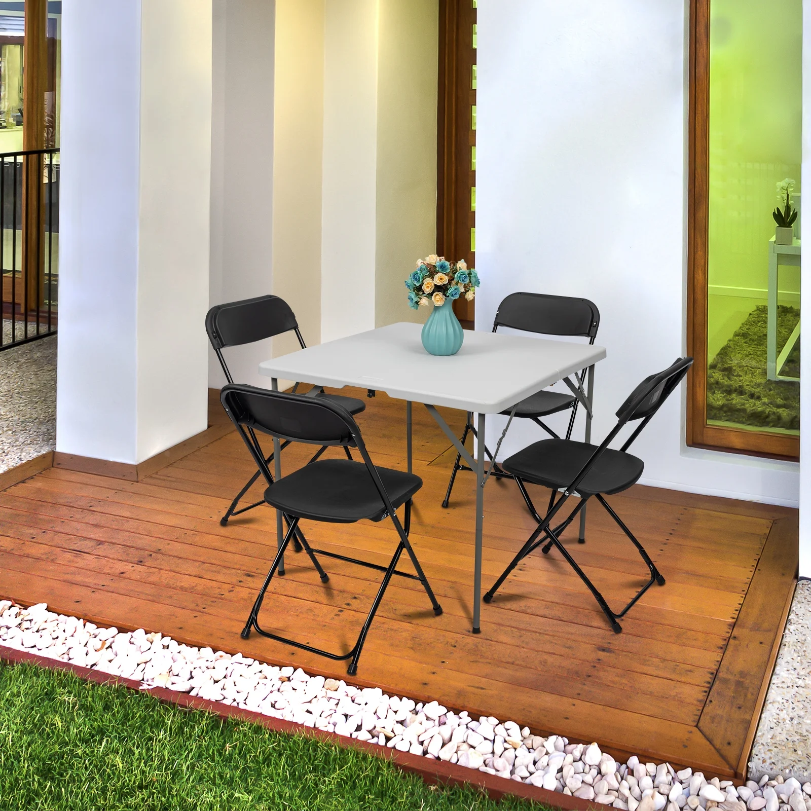 - The plastic table and folding chairs are easy to carry