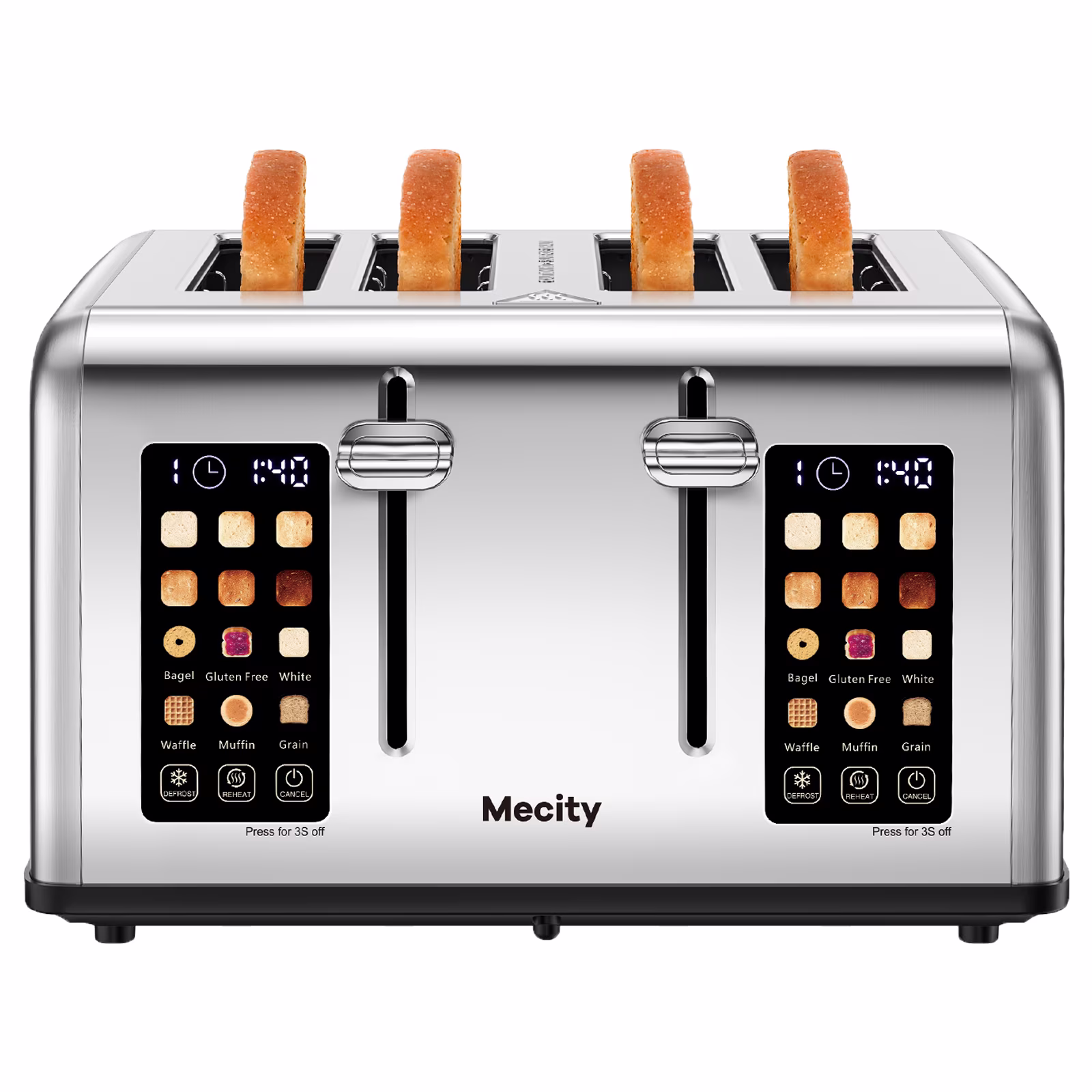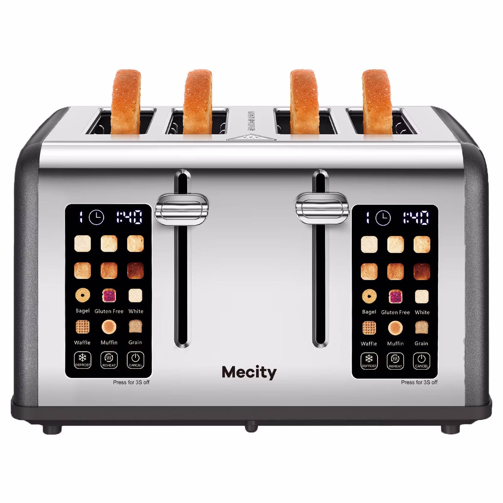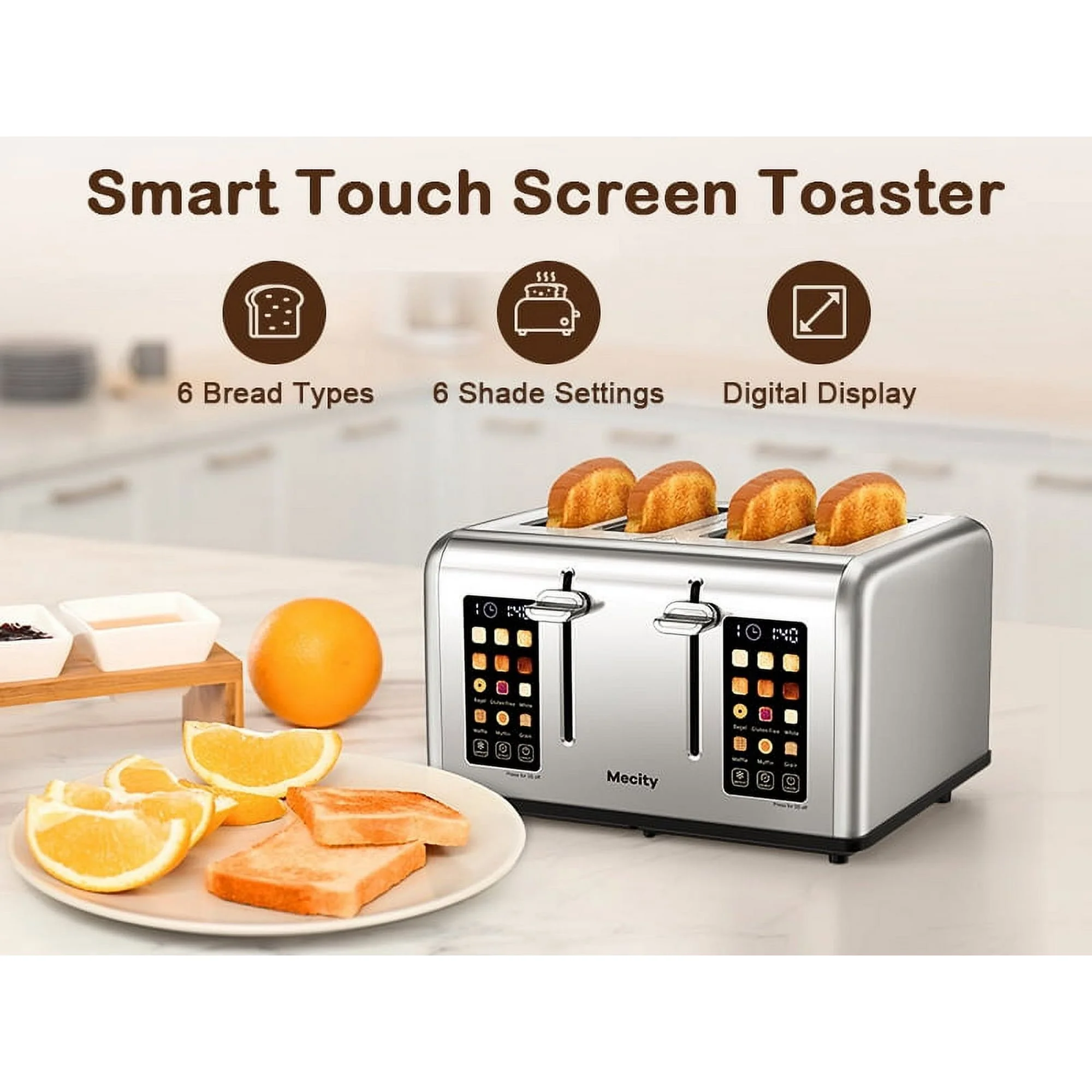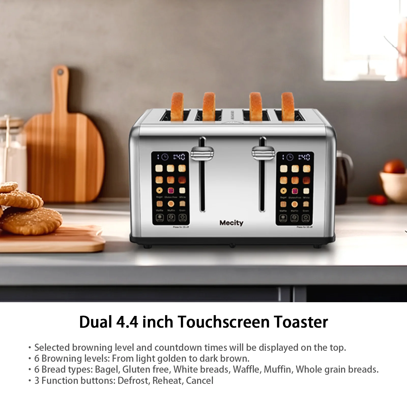 Mecity Touchscreen 4-Slice Toaster with Countdown Timer, Stainless Steel Bread Toaster, 6 Browning & 6 Shade Settings, 4 Wide Slots with Reheat, Cancel, and Defrost Functions, Removable Tray-Silver