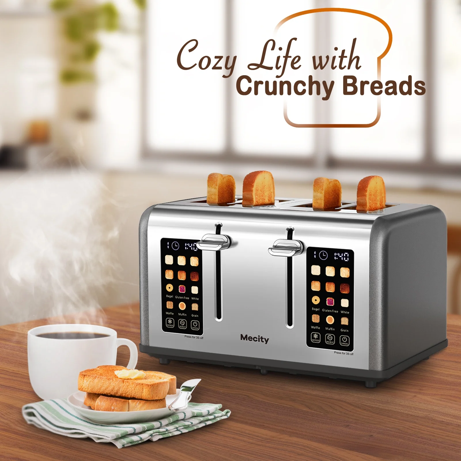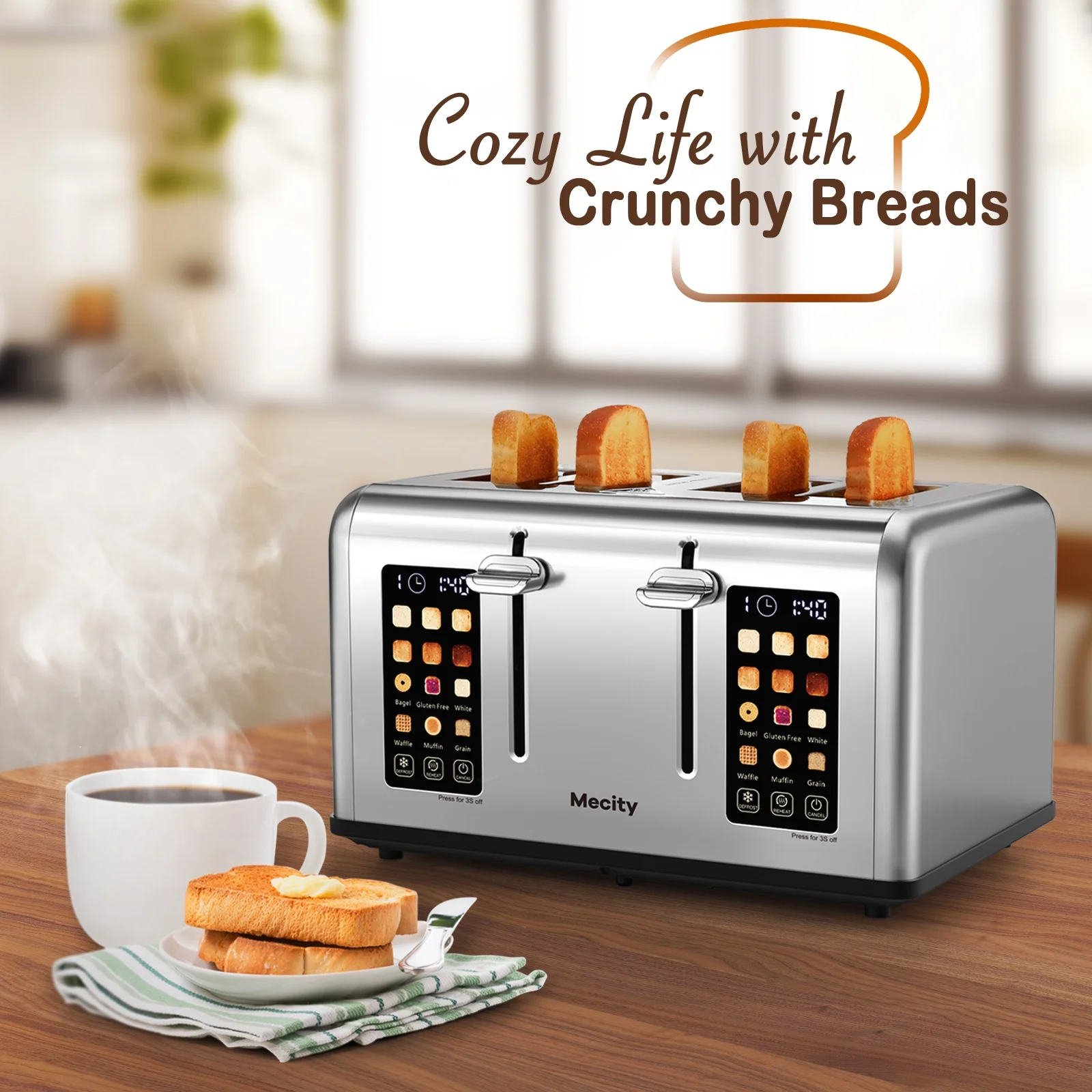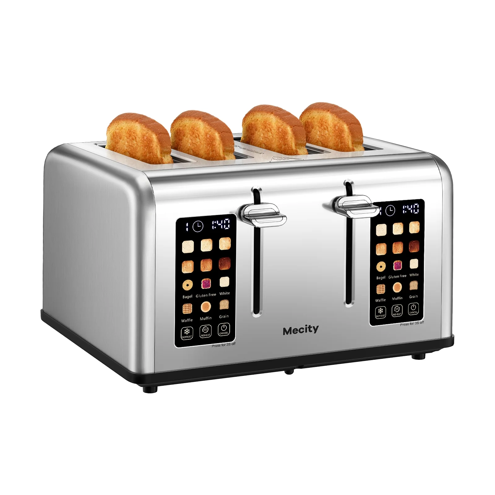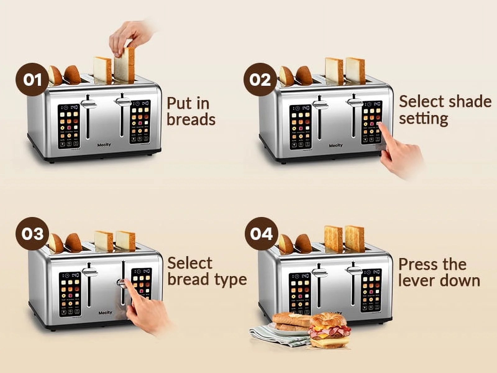 Mecity Touchscreen 4-Slice Toaster with Countdown Timer, Stainless Steel Bread Toaster, 6 Browning & 6 Shade Settings, 4 Wide Slots with Reheat, Cancel, and Defrost Functions, Removable Tray-Silver