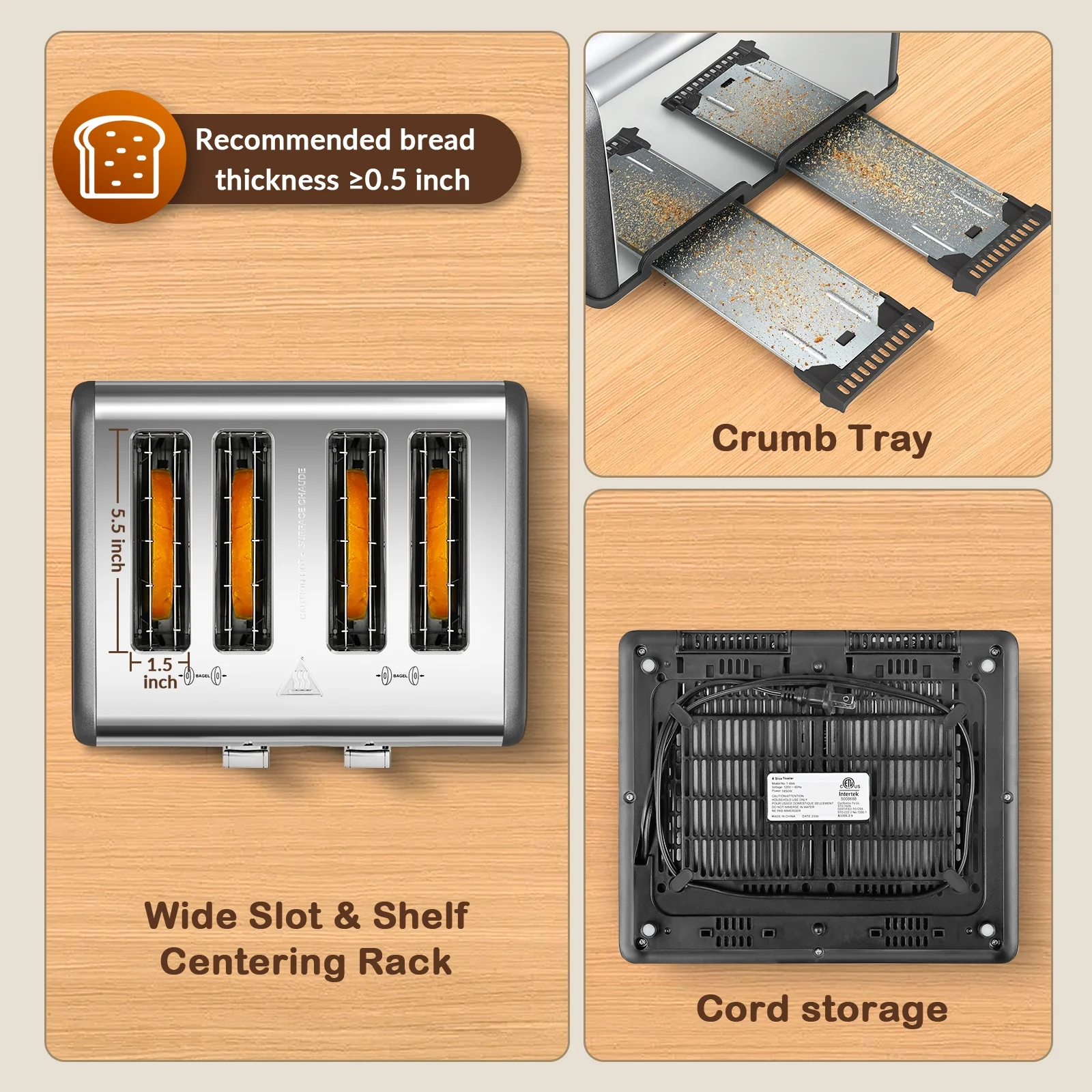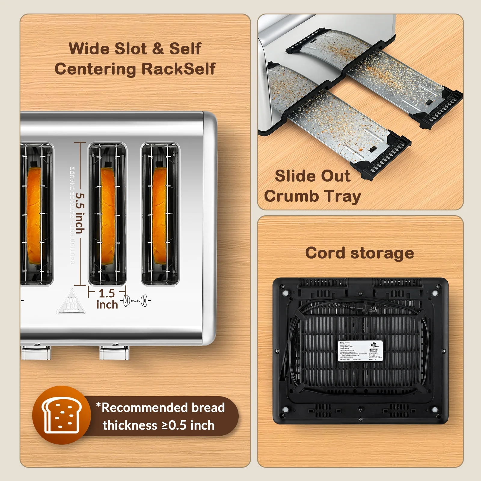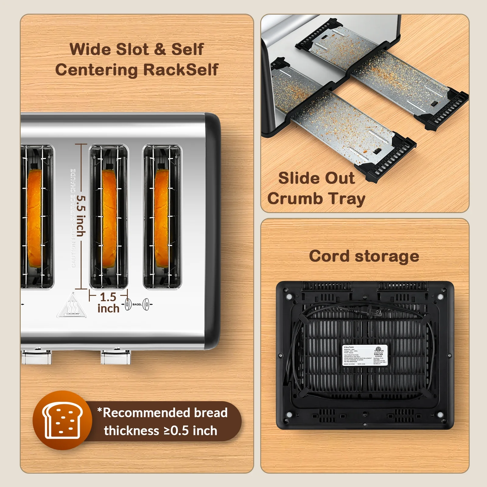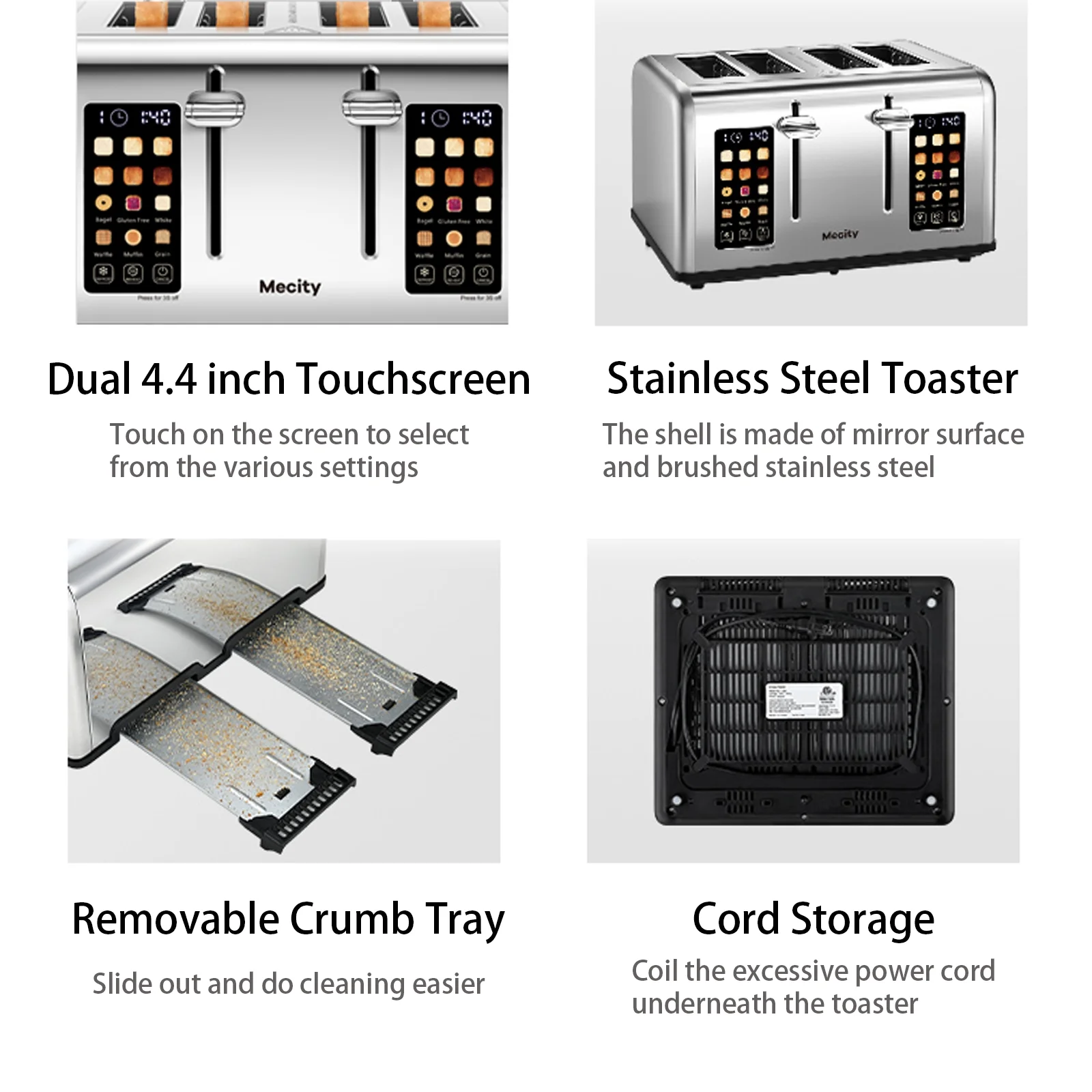 - ��Easy To Clean��: The toasting slots are made of non-stick, food-grade stainless steel, and there's a removable crumb tray at the bottom. With these features, cleaning the bread toaster requires minimal effort.