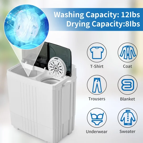 - Dual-Tub Efficiency: 12Lb wash tub + 8Lb spin tub operate simultaneously; separate 15-min/5-min timers allow customized cycles for different fabrics.