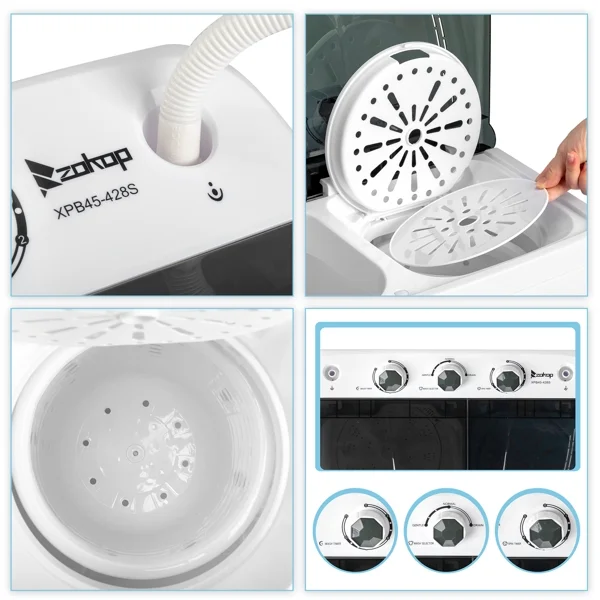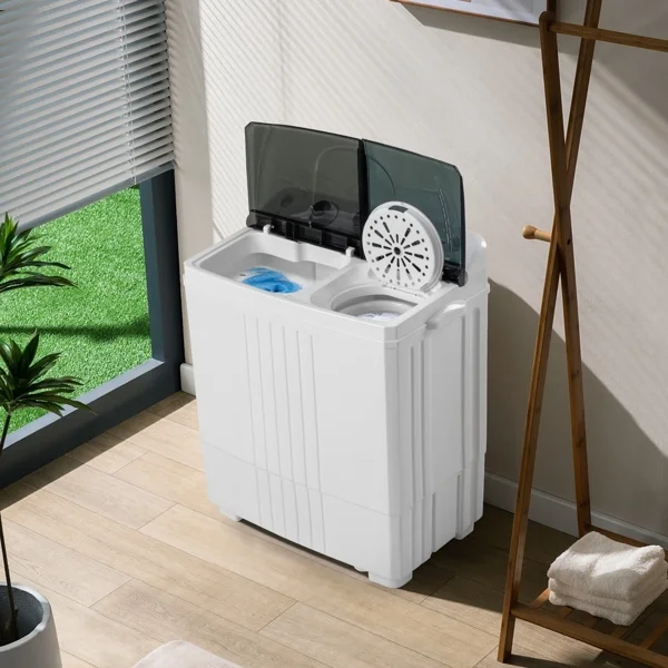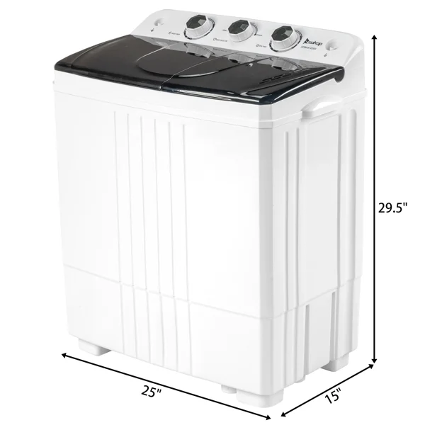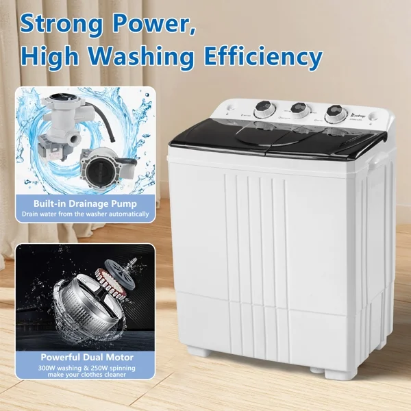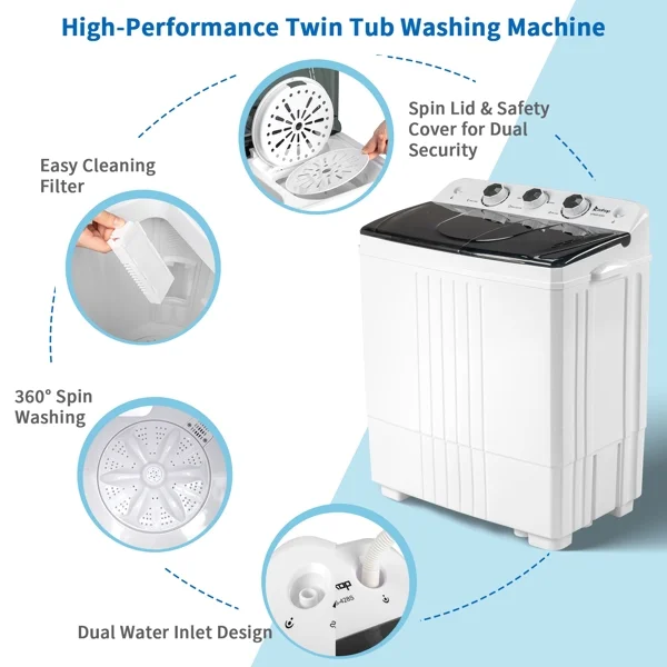 This semi-automatic twin tub washer features 12Lb washing and 8Lb spinning capacities with a built-in drain pump. The 1300RPM motor and compact design make it ideal for apartments, dorms, or RVs. Easy to operate and space-saving.