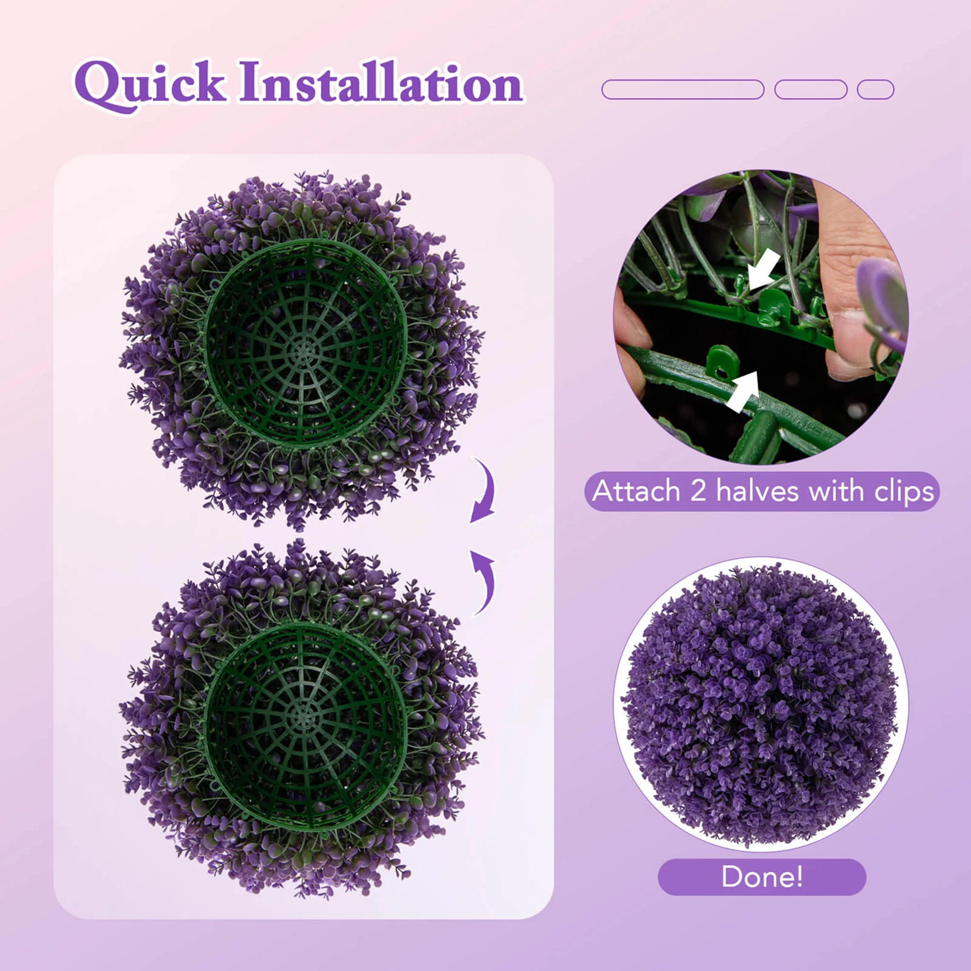 - Easy Assembly & Warm Tip: Each fake ball plant is constructed of 2 semicircles, which are connected by 8 clips, allowing for quick assembly. If the faux topiary ball deformed, please expose it to sunlight or use a hairdryer to restore their perfect shape effortlessly.