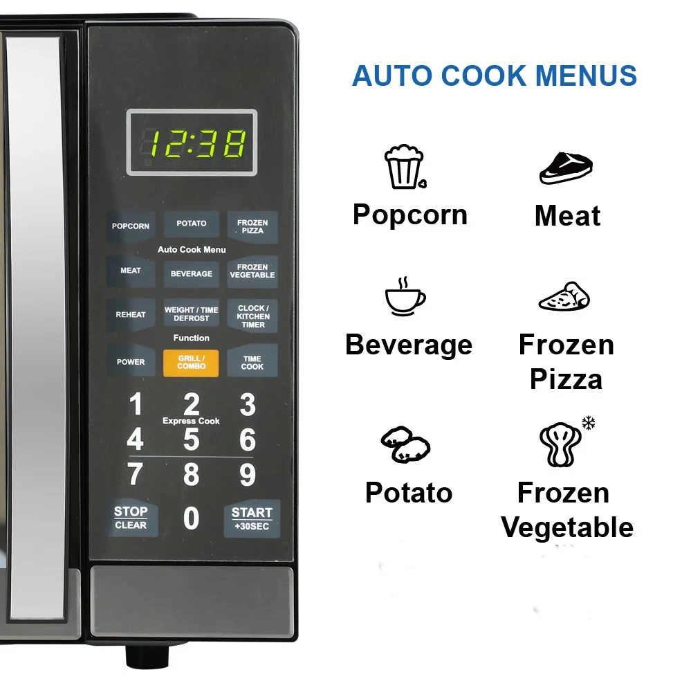 - 6 Pre-programmed Settings (Popcorn, Potato, Frozen Pizza, Meat, Frozen Vegetable, Beverage & Reheat)
