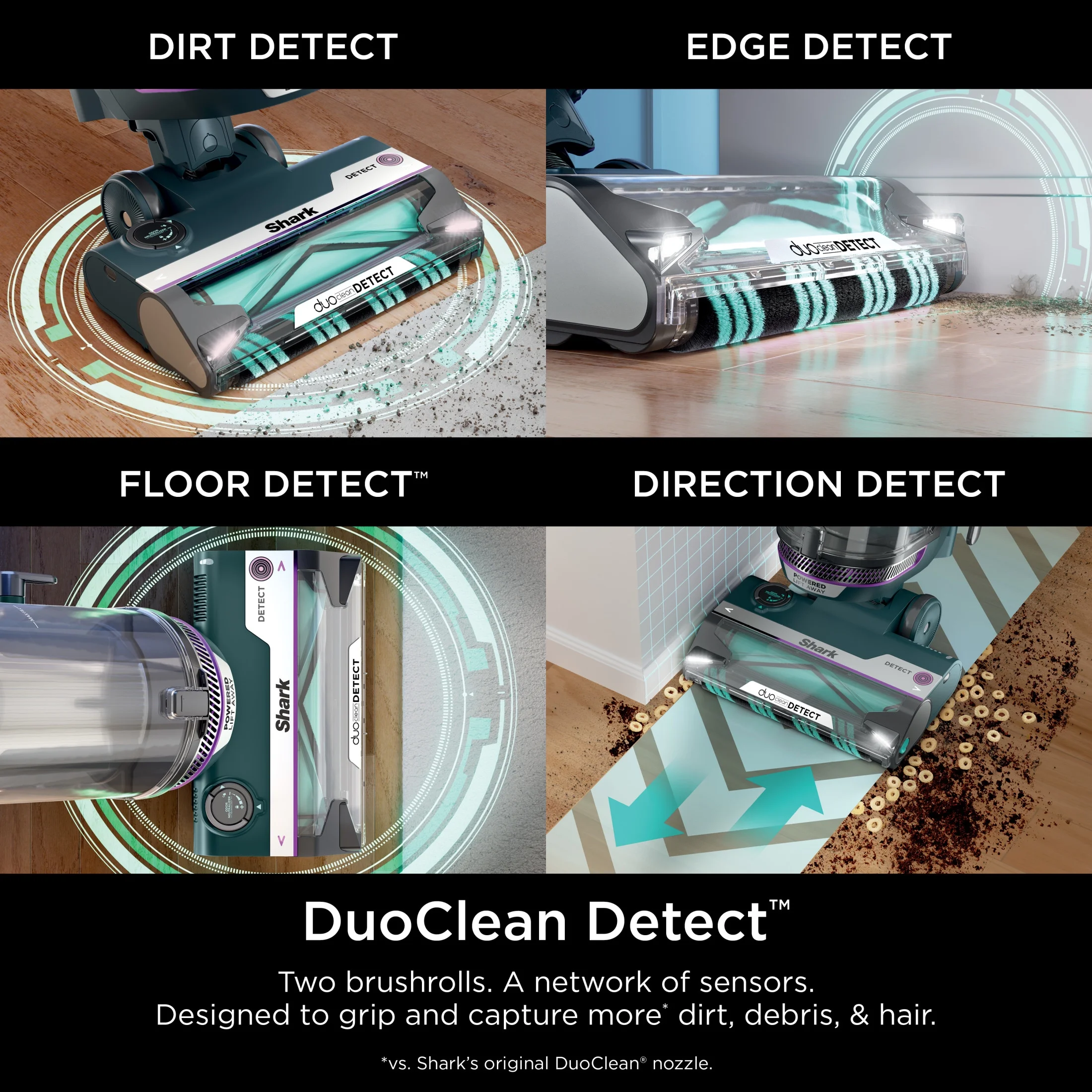 - DUOCLEAN DETECT: Two-brushroll system with four Intelli-Sense sensors automatically senses and reacts to hidden dirt, debris and hair and boosts suction and brushroll speed for optimal performance