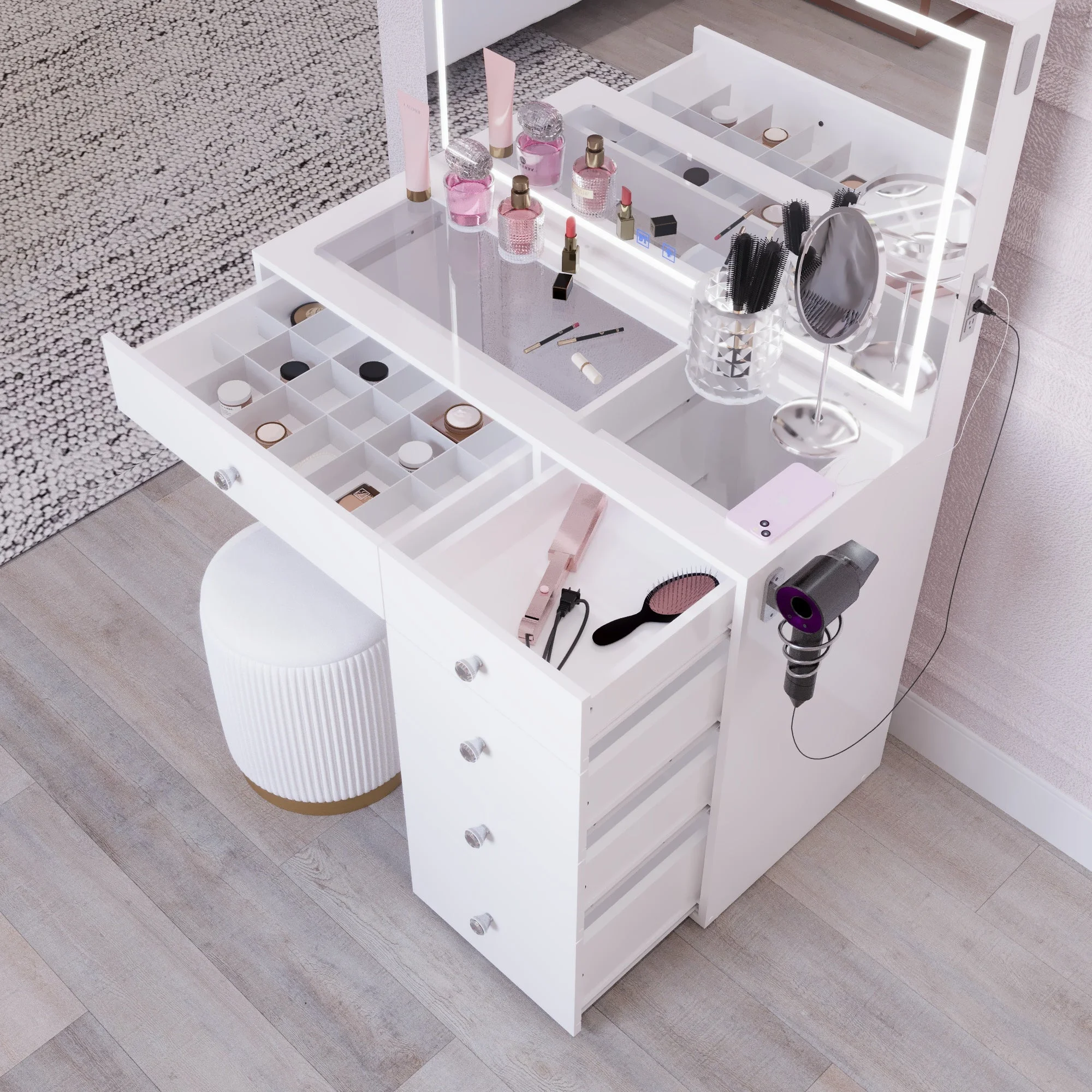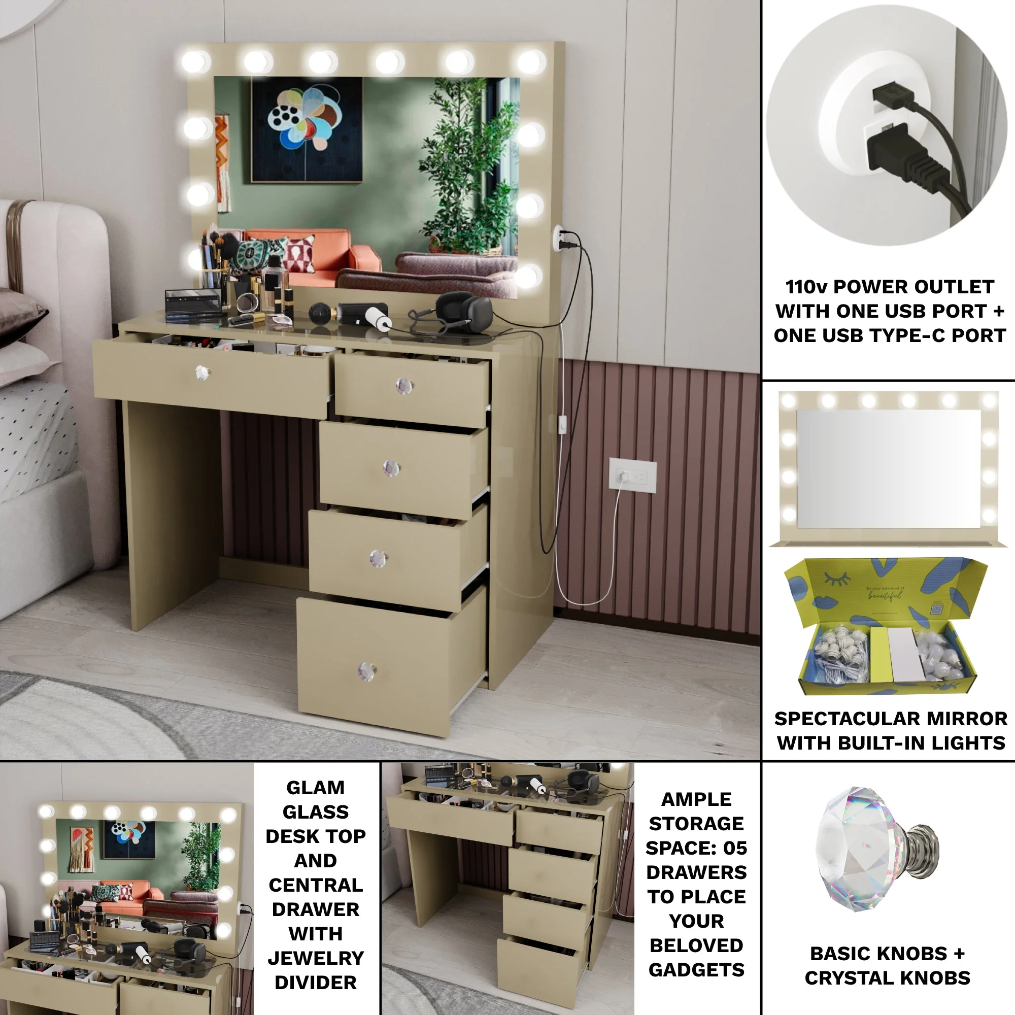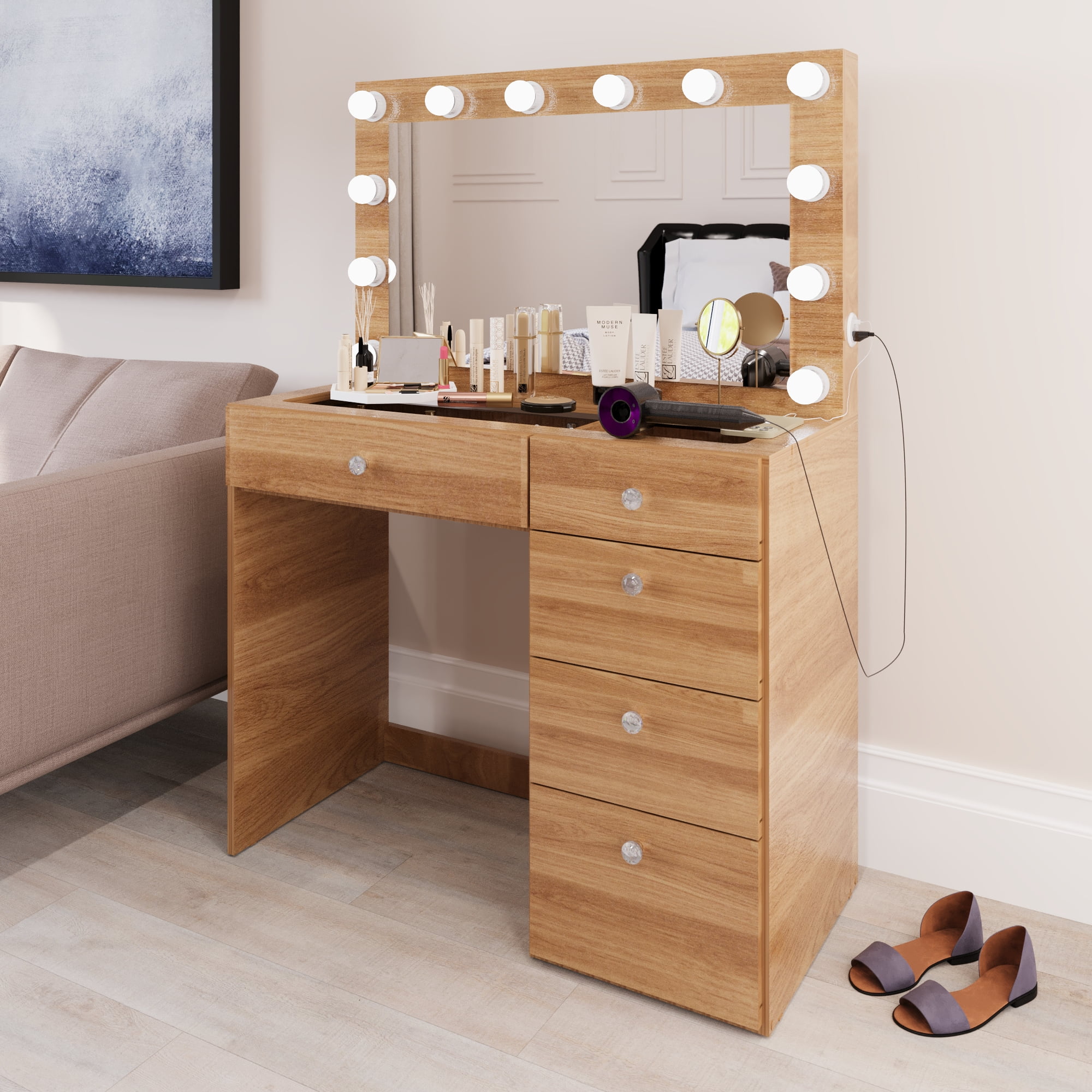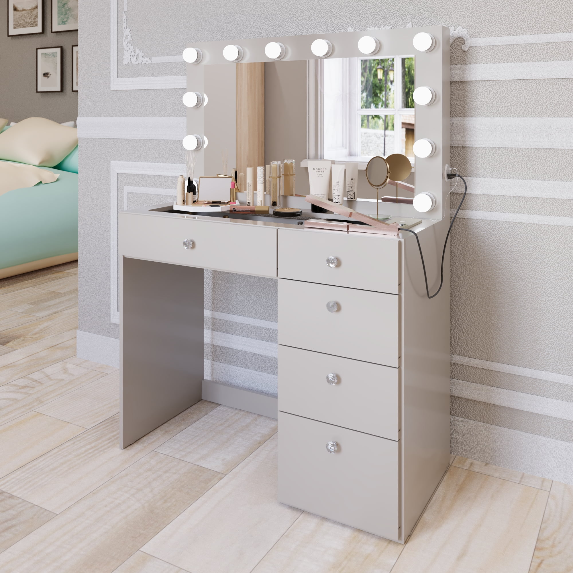 - 5 spacious drawers keep makeup, cosmetics, and tools organized