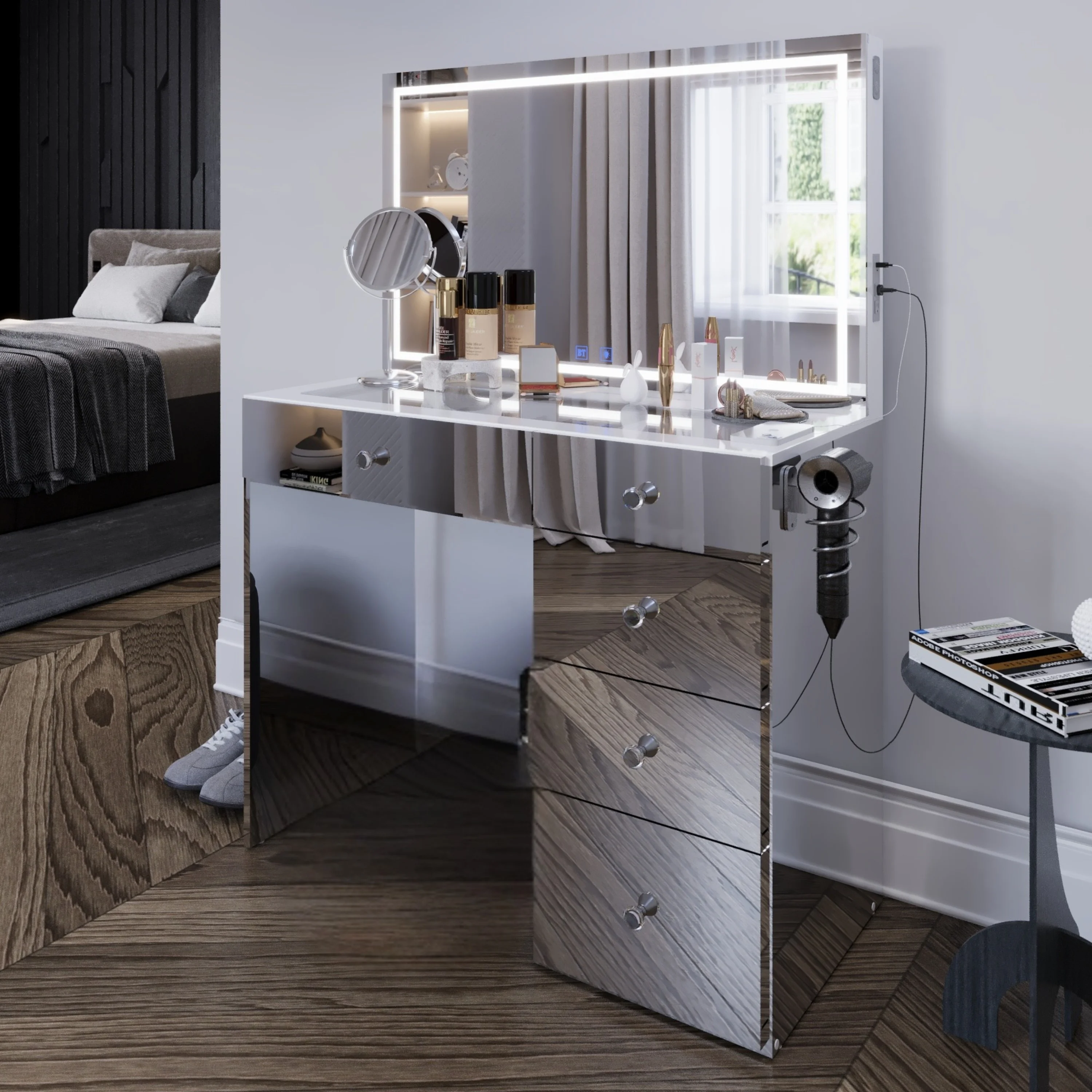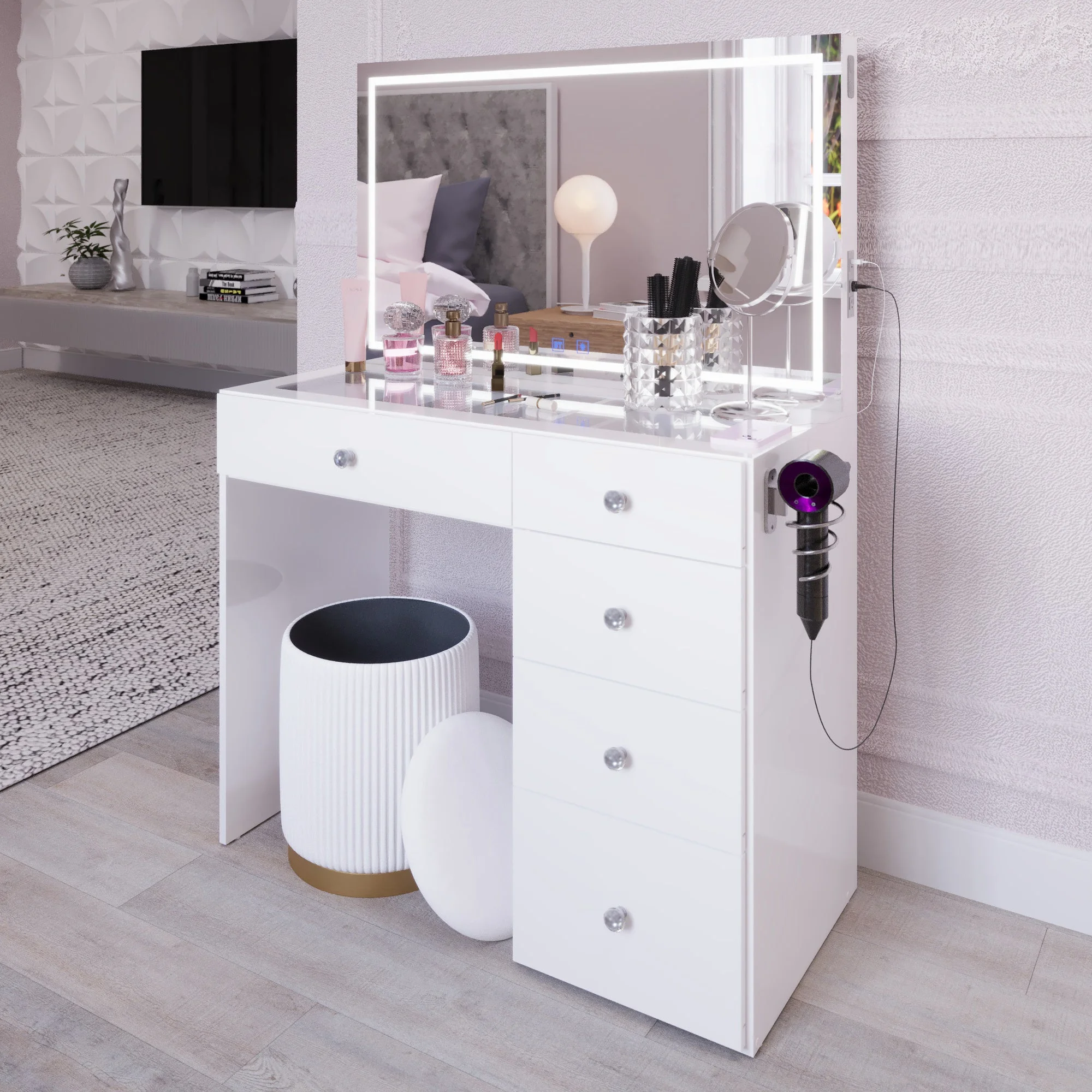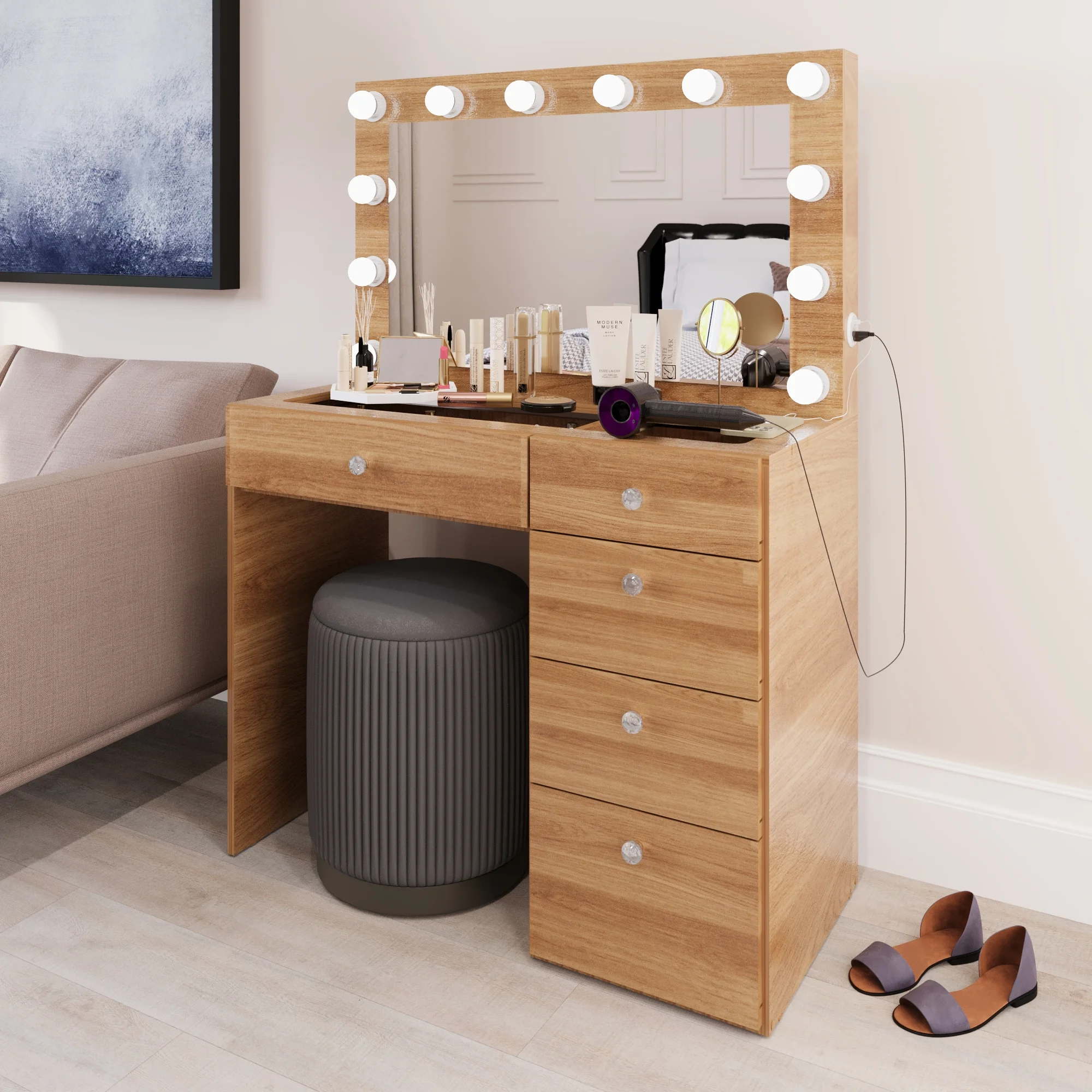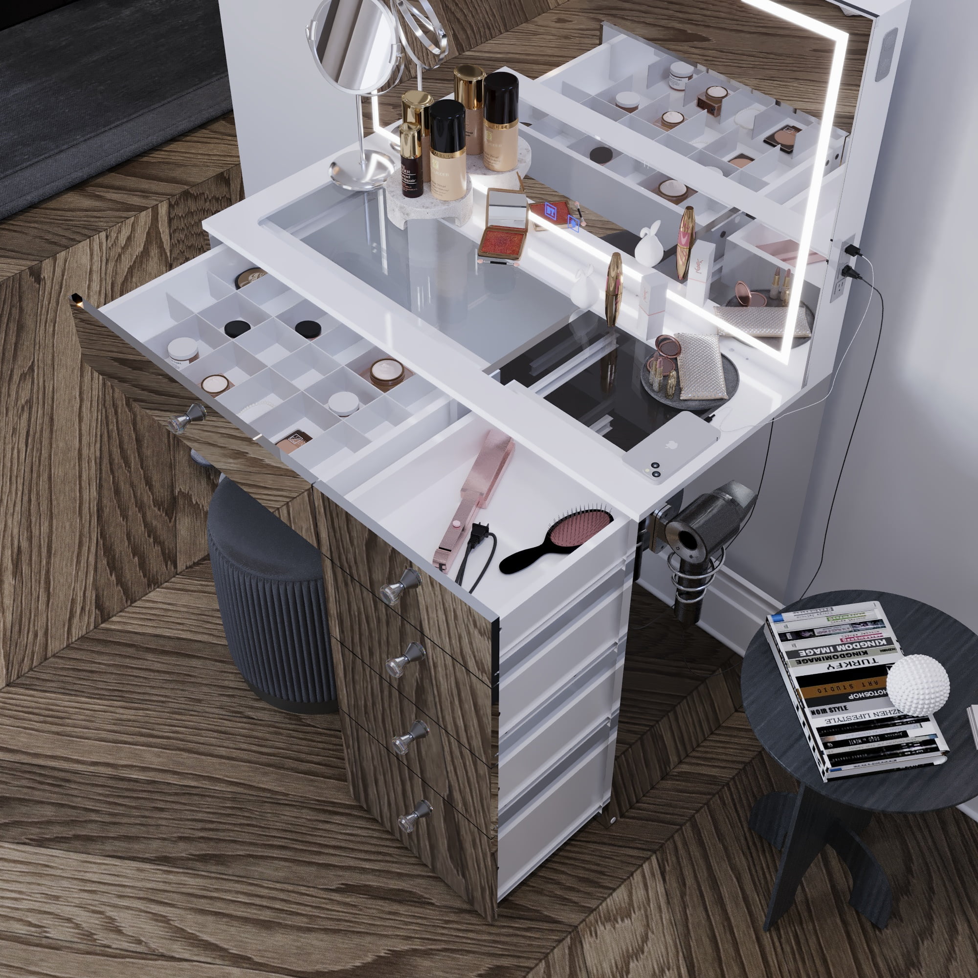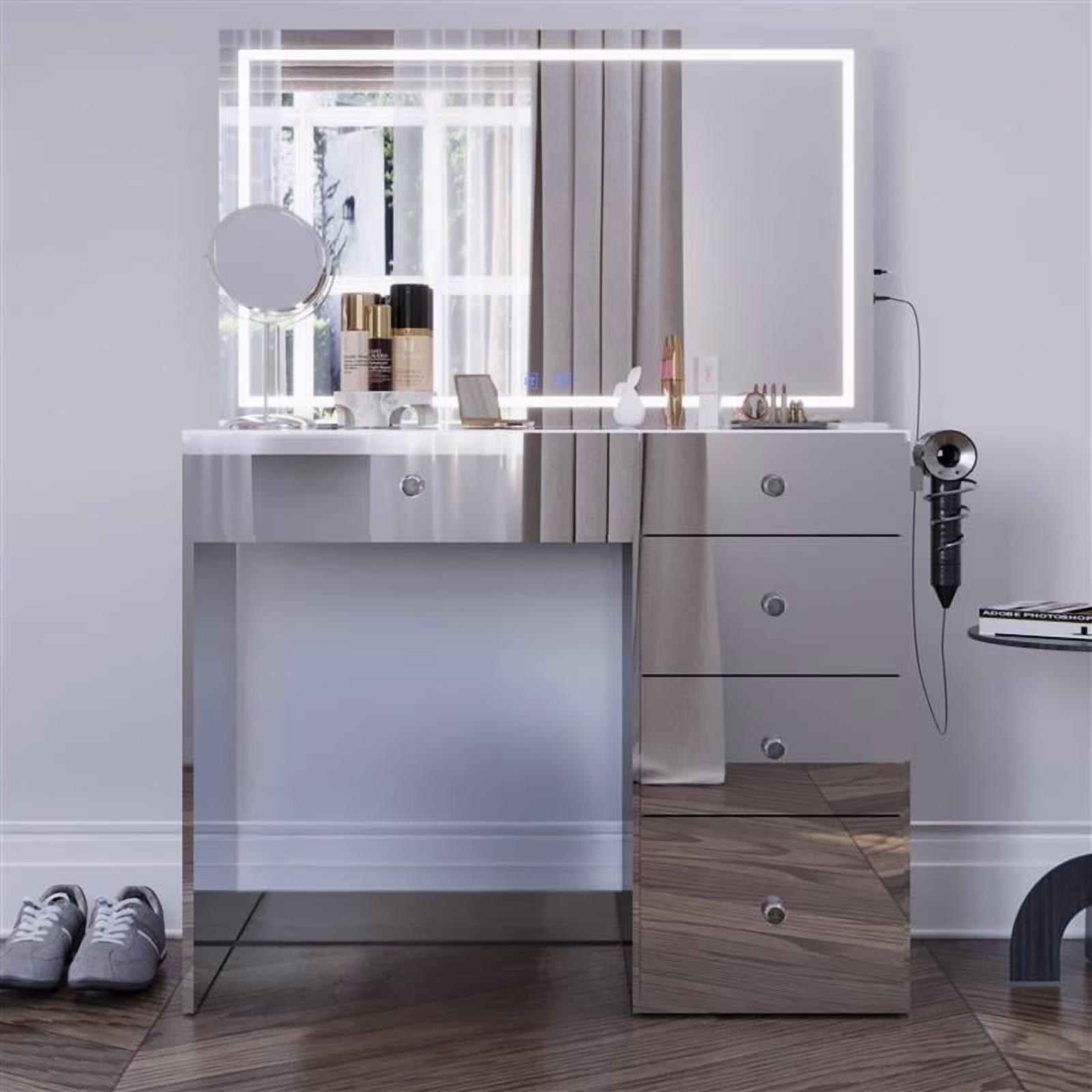 - 5 spacious drawers keep makeup, cosmetics, and tools organized