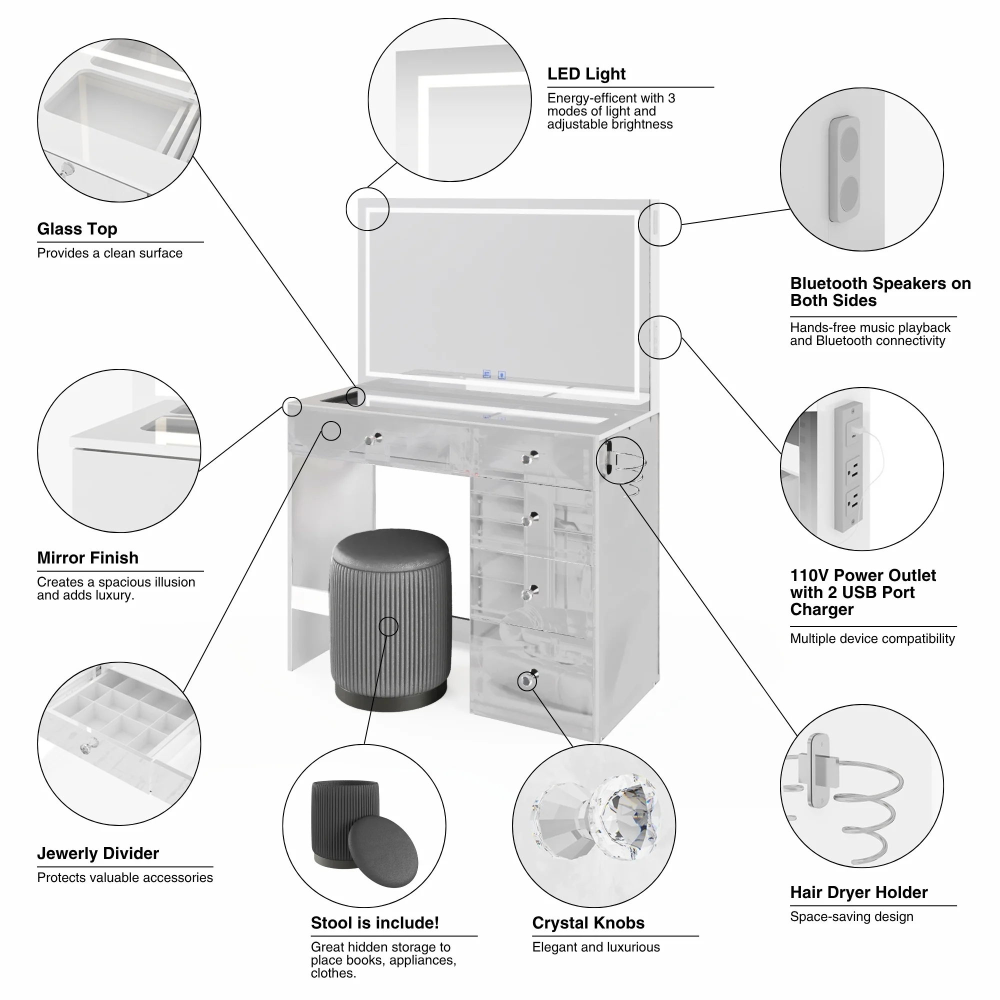 - Central drawer includes a jewelry organizer for accessories and small items