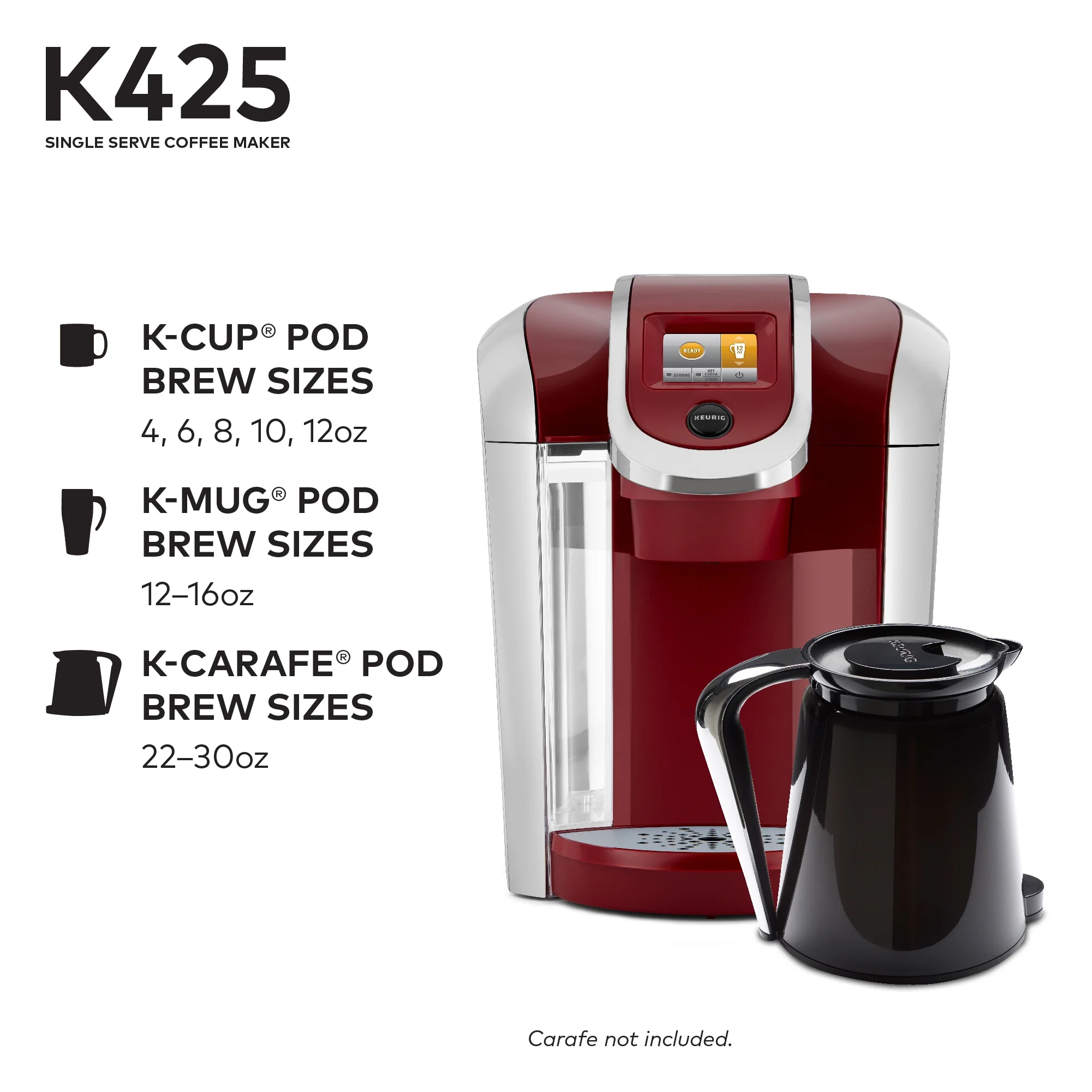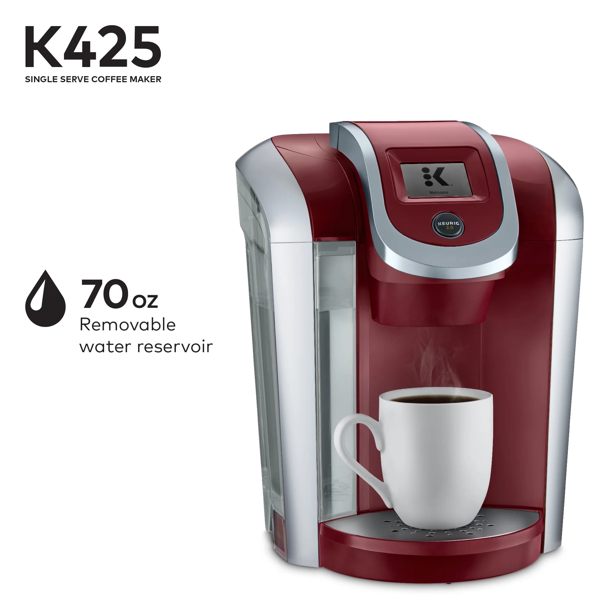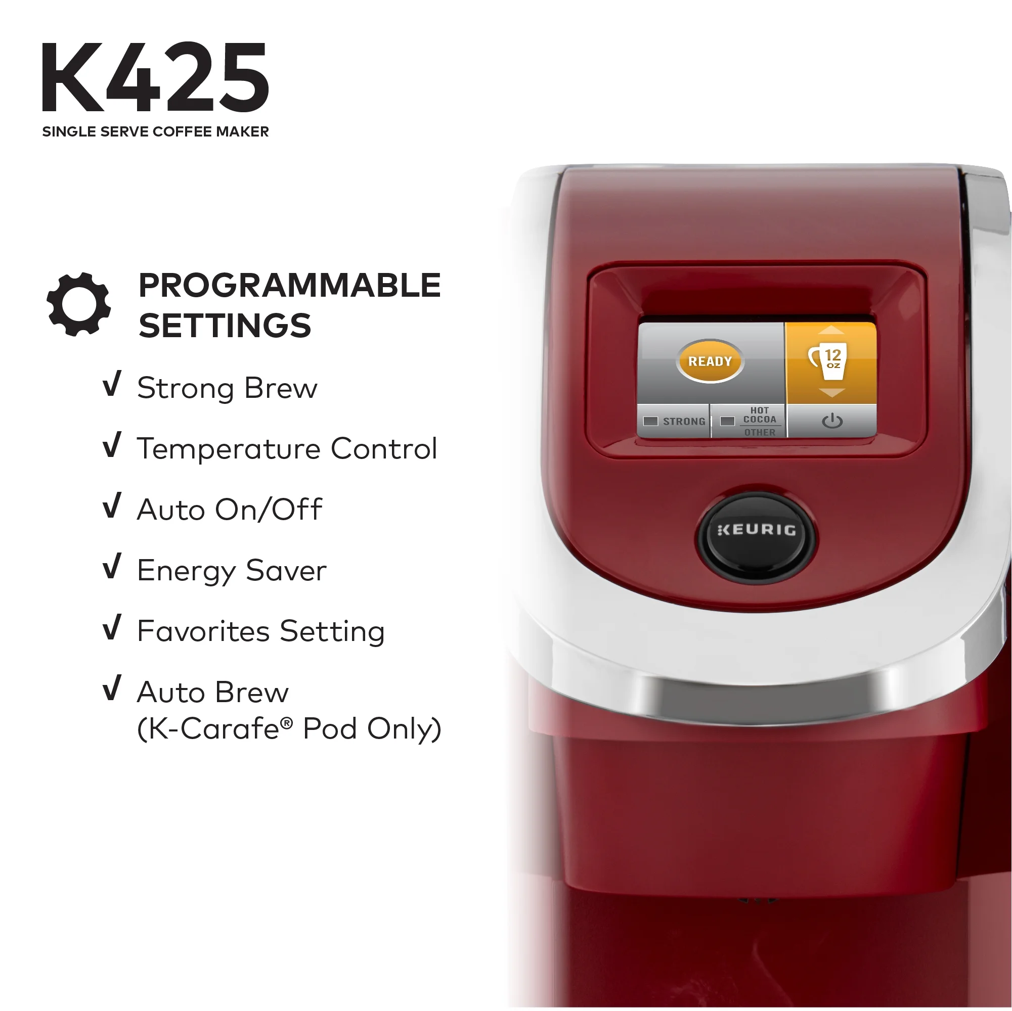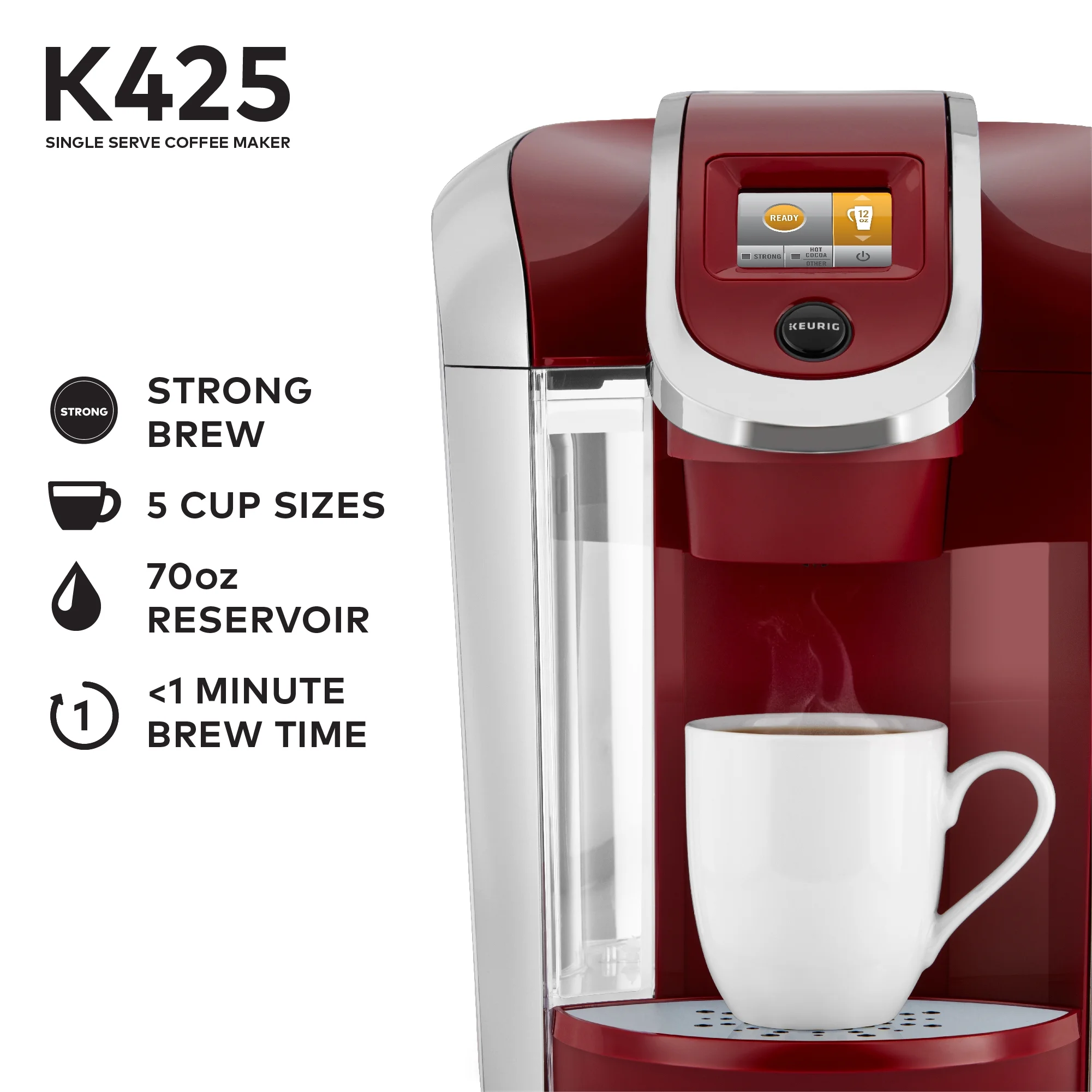 A Premium and Customizable Single Serve Keurig Coffee Maker, the Keurig K425 brews a rich, smooth, and delicious cup every time with the quality you expect from Keurig. With a strength control setting for a bolder brew, five temperature settings, and multiple K-Cup, K-Mug, and K-Carafe pod brew sizes, you can customize your settings to get your perfect cup. Plus, an easy-to-use large color touch screen with a digital clock makes your brewing experience stress free, and you can even program your brewer to turn on or off automatically at set times. Whether you like your coffee strong, mild, decaf, or flavored, you can brew all of your favorites with the Keurig K425 �C and with large 70oz water reservoir, you can brew 8+ cups before having to refill. Discover hundreds of K-Cup pod varieties from all of the brands you love, including Green Mountain Coffee, Starbucks, and Lipton, and enjoy coffee, tea, hot cocoa and more. Available in several colors to complement any d��cor, and also compatible with the Keurig Plus Series My K-Cup Reusable Coffee Filter, so you can brew your own ground coffee. Single Serve Coffee Makers are expertly engineered to deliver a consistently delicious beverage experience, giving you the same great taste, cup after cup. You can create and customize your perfect beverage, at the touch of a button, and prepare coffee, tea, cocoa and more just the way you like it. All Keurig brewers also dispense hot water, adding to their versatility.A premium, customizable coffee maker.LARGE 70oz WATER RESERVOIR: Allows you to brew 8+ cups more before having to refill, saving you time and simplifying your morning routine. The water reservoir is removable, making it easy to refill whenever you need to.K-CUP POD BREW SIZES: (4, 6, 8, 10, 12 oz.). Brews a Carafe (22, 26, or 30oz) using K-Carafe pods, to give you more coffee when you need it. (Carafe sold separately)STRENGTH CONTROL SETTING: Allows you to brew a bolder cup using any K-Cup pod brew size. Plus, five temperature settings allow you to enjoy your favorite beverage at your desired temperature.LARGE COLOR TOUCH SCREEN: With a digital clock makes it easy to brew a fresh, great tasting cup in under a minute. Plus, program your brewer to turn on or off automatically at set times, so that it is ready to go when you want it, and turns off to conserve energy.DISPENSE HOT WATER: Only by opening and closing the brewer handle (without a pod), and selecting your desired brew size. A removable drip tray at the base of the brewer catches drips and makes for easy clean-up.