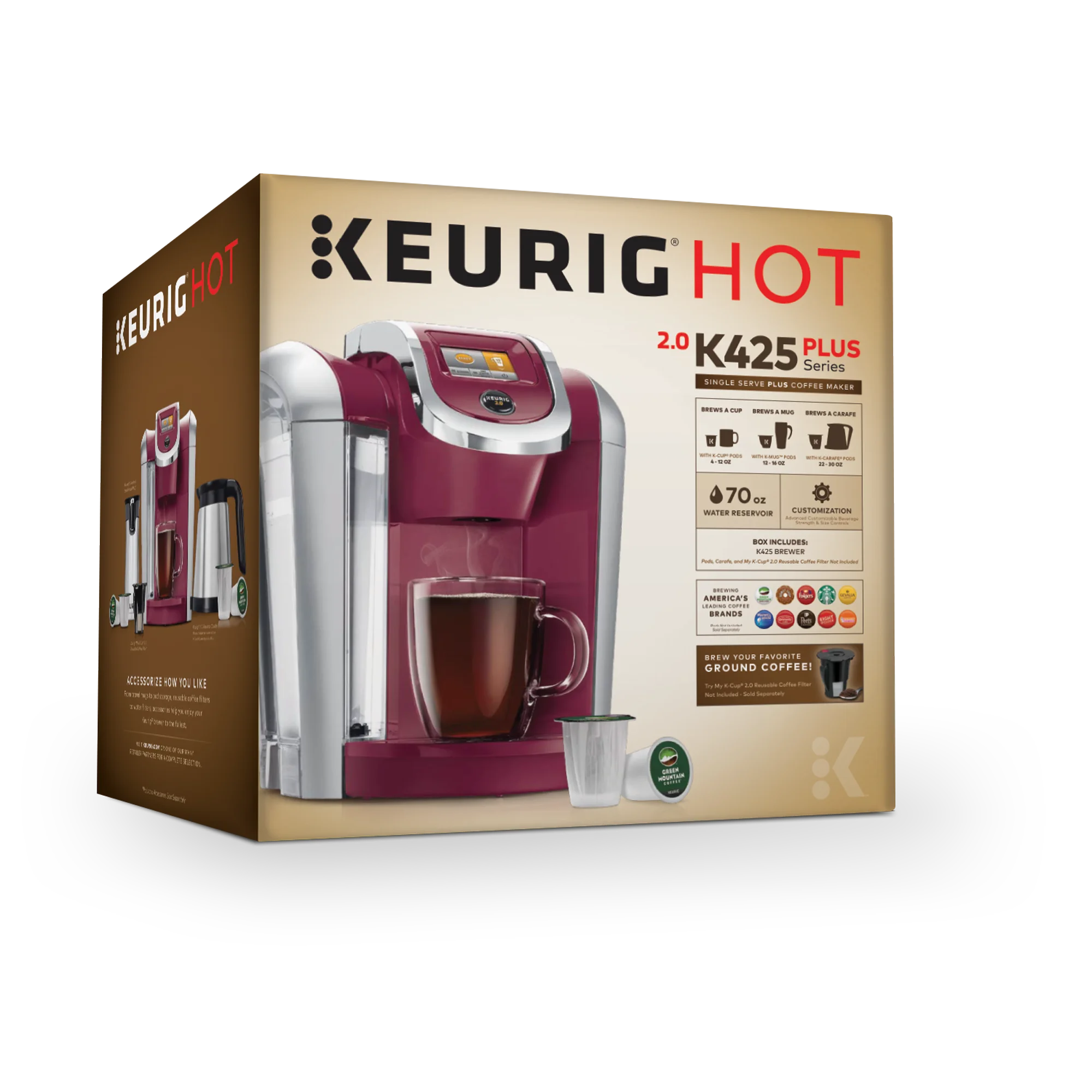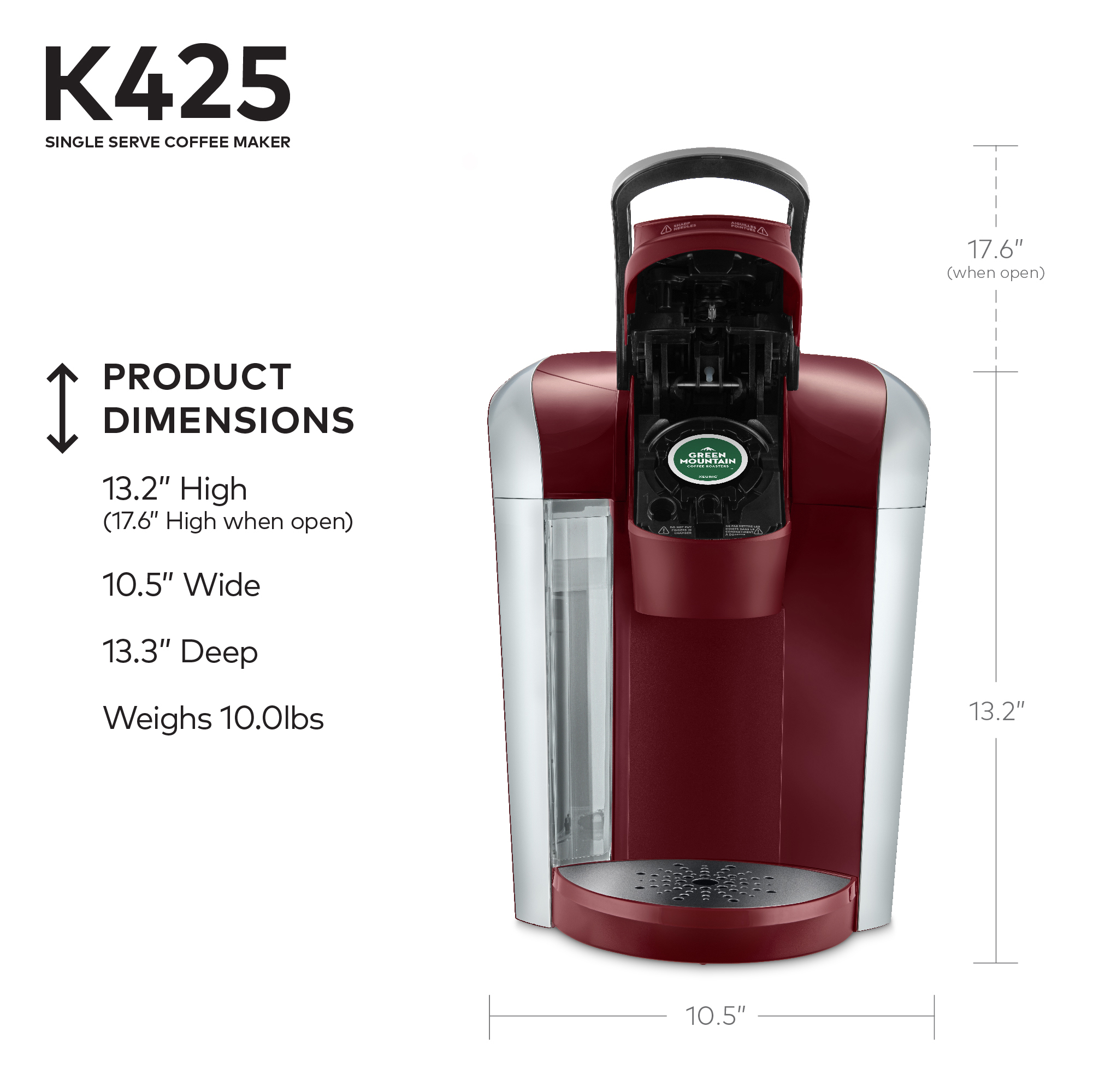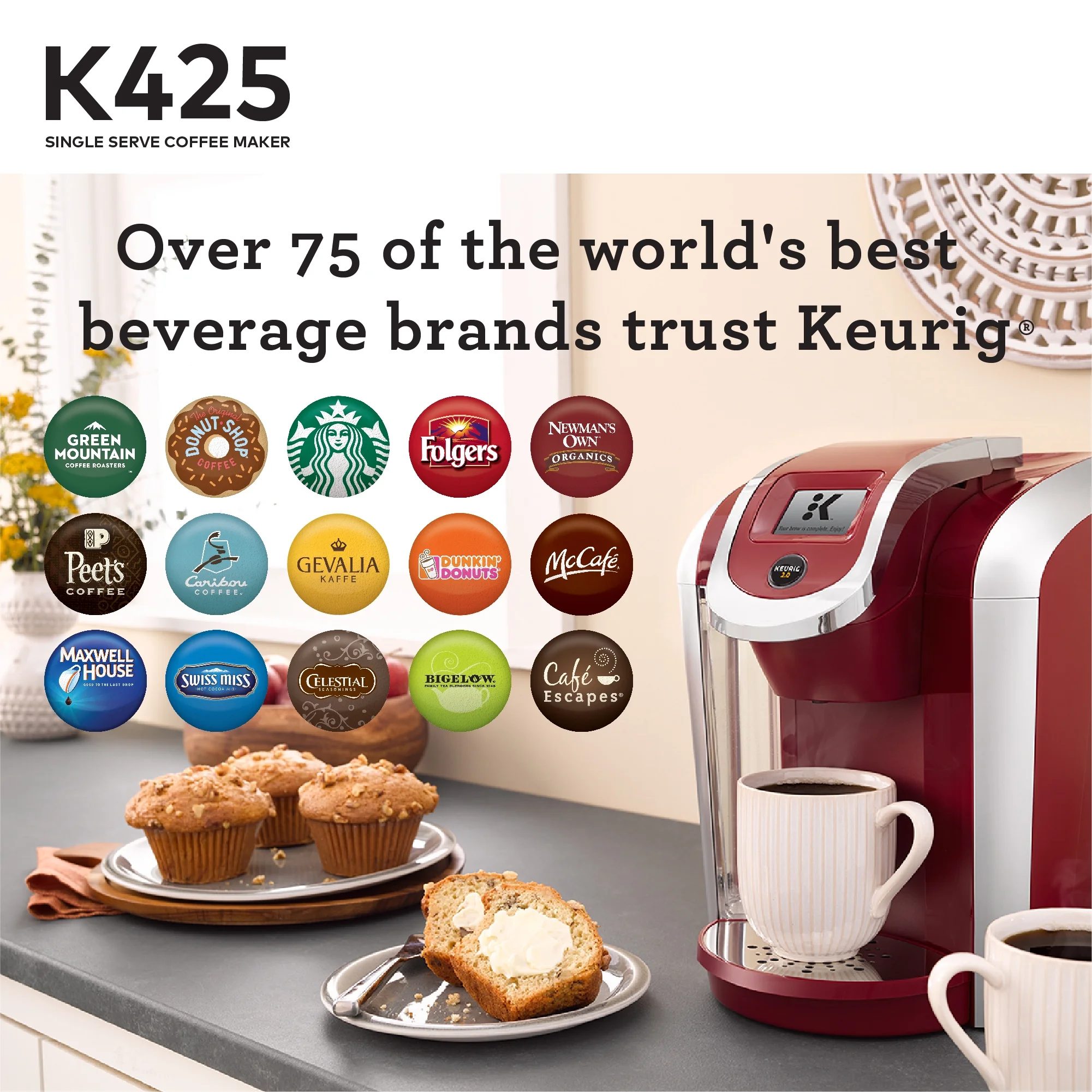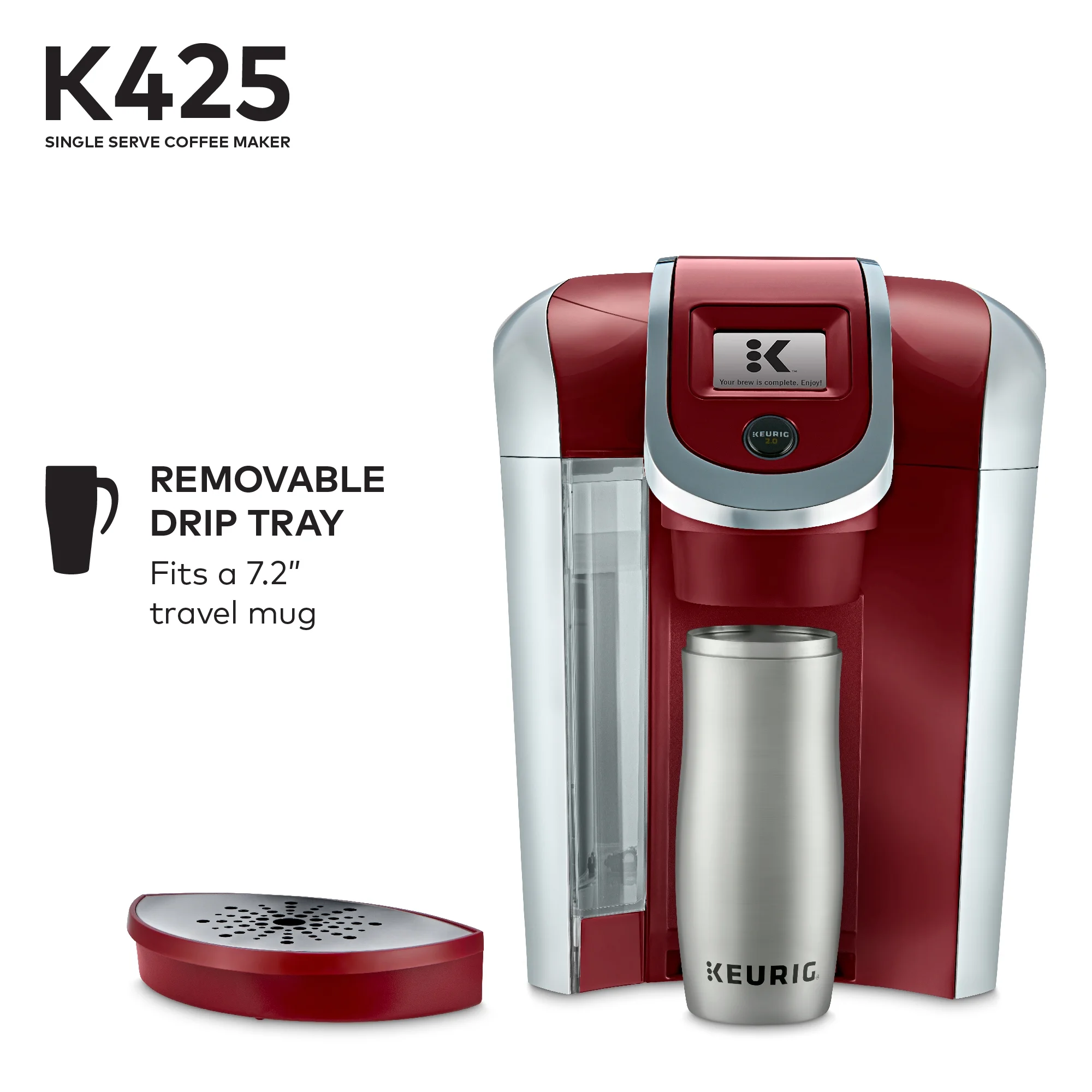 A Premium and Customizable Single Serve Keurig Coffee Maker, the Keurig K425 brews a rich, smooth, and delicious cup every time with the quality you expect from Keurig. With a strength control setting for a bolder brew, five temperature settings, and multiple K-Cup, K-Mug, and K-Carafe pod brew sizes, you can customize your settings to get your perfect cup. Plus, an easy-to-use large color touch screen with a digital clock makes your brewing experience stress free, and you can even program your brewer to turn on or off automatically at set times. Whether you like your coffee strong, mild, decaf, or flavored, you can brew all of your favorites with the Keurig K425 �C and with large 70oz water reservoir, you can brew 8+ cups before having to refill. Discover hundreds of K-Cup pod varieties from all of the brands you love, including Green Mountain Coffee, Starbucks, and Lipton, and enjoy coffee, tea, hot cocoa and more. Available in several colors to complement any d��cor, and also compatible with the Keurig Plus Series My K-Cup Reusable Coffee Filter, so you can brew your own ground coffee. Single Serve Coffee Makers are expertly engineered to deliver a consistently delicious beverage experience, giving you the same great taste, cup after cup. You can create and customize your perfect beverage, at the touch of a button, and prepare coffee, tea, cocoa and more just the way you like it. All Keurig brewers also dispense hot water, adding to their versatility.A premium, customizable coffee maker.LARGE 70oz WATER RESERVOIR: Allows you to brew 8+ cups more before having to refill, saving you time and simplifying your morning routine. The water reservoir is removable, making it easy to refill whenever you need to.K-CUP POD BREW SIZES: (4, 6, 8, 10, 12 oz.). Brews a Carafe (22, 26, or 30oz) using K-Carafe pods, to give you more coffee when you need it. (Carafe sold separately)STRENGTH CONTROL SETTING: Allows you to brew a bolder cup using any K-Cup pod brew size. Plus, five temperature settings allow you to enjoy your favorite beverage at your desired temperature.LARGE COLOR TOUCH SCREEN: With a digital clock makes it easy to brew a fresh, great tasting cup in under a minute. Plus, program your brewer to turn on or off automatically at set times, so that it is ready to go when you want it, and turns off to conserve energy.DISPENSE HOT WATER: Only by opening and closing the brewer handle (without a pod), and selecting your desired brew size. A removable drip tray at the base of the brewer catches drips and makes for easy clean-up.