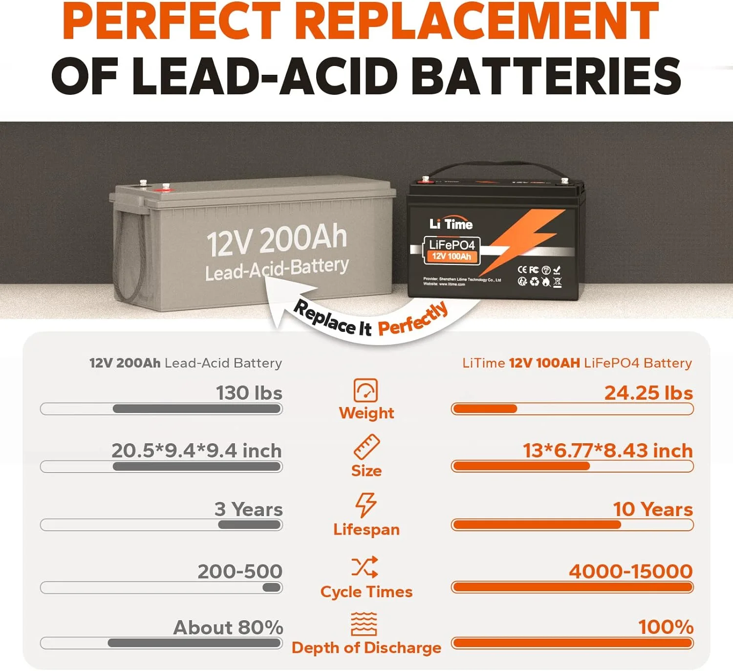 - Lightweight-Easy to Move: LiTime 12V 100Amp LiFePO4 Battery Weighting only 24.25 lbs for one module, it weighs only 1/3* the weight of lead-acid batteries. LiFePO4 battery is 50% lighter than a lead acid battery with the same capacity.