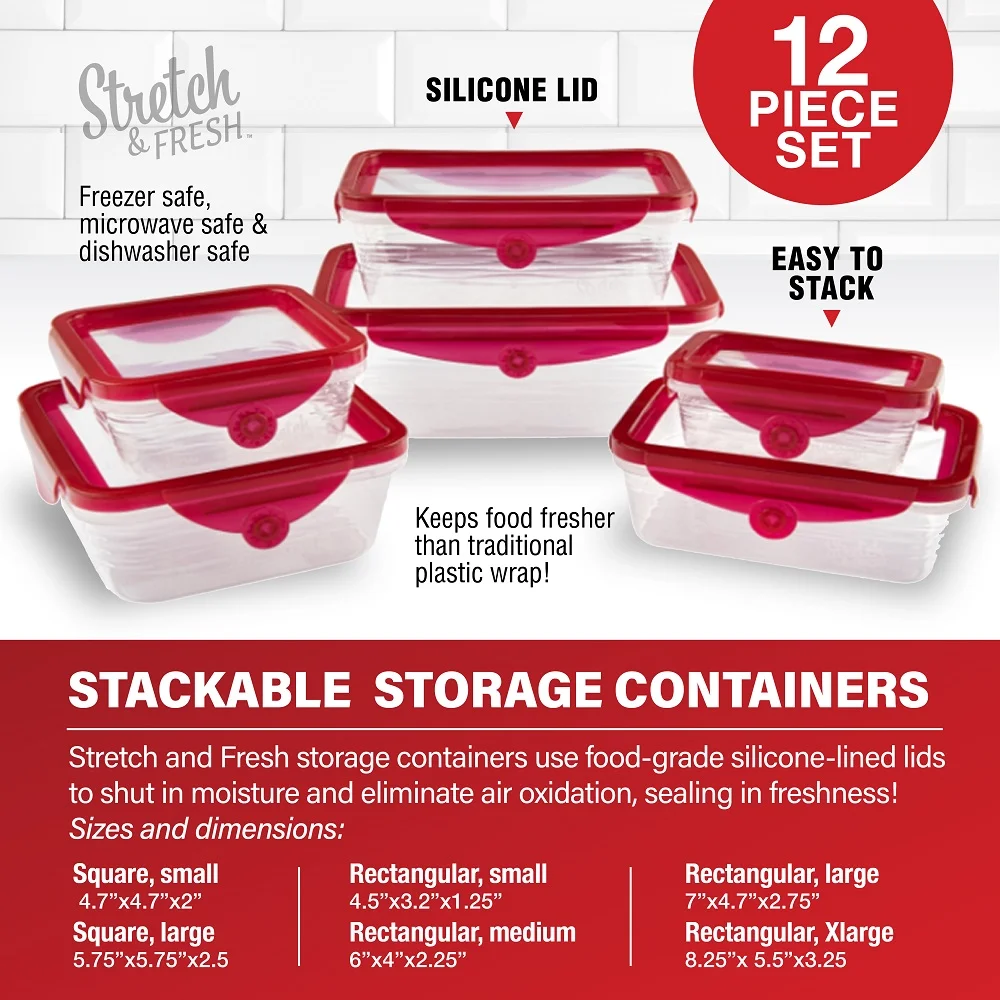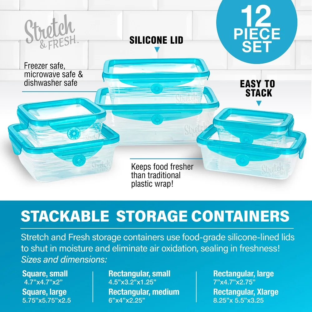 - STACKABLE EASY STORAGE CONTAINERS - Stretch and Fresh storage containers use food-grade silicone-lined lids to shut in moisture and eliminate air oxidation, sealing in freshness and allowing for food to last longer than the traditional plastic cling-wrap and other standard food storage containers. These containers are freezer safe, microwave safe, dishwasher safe and no BPA!