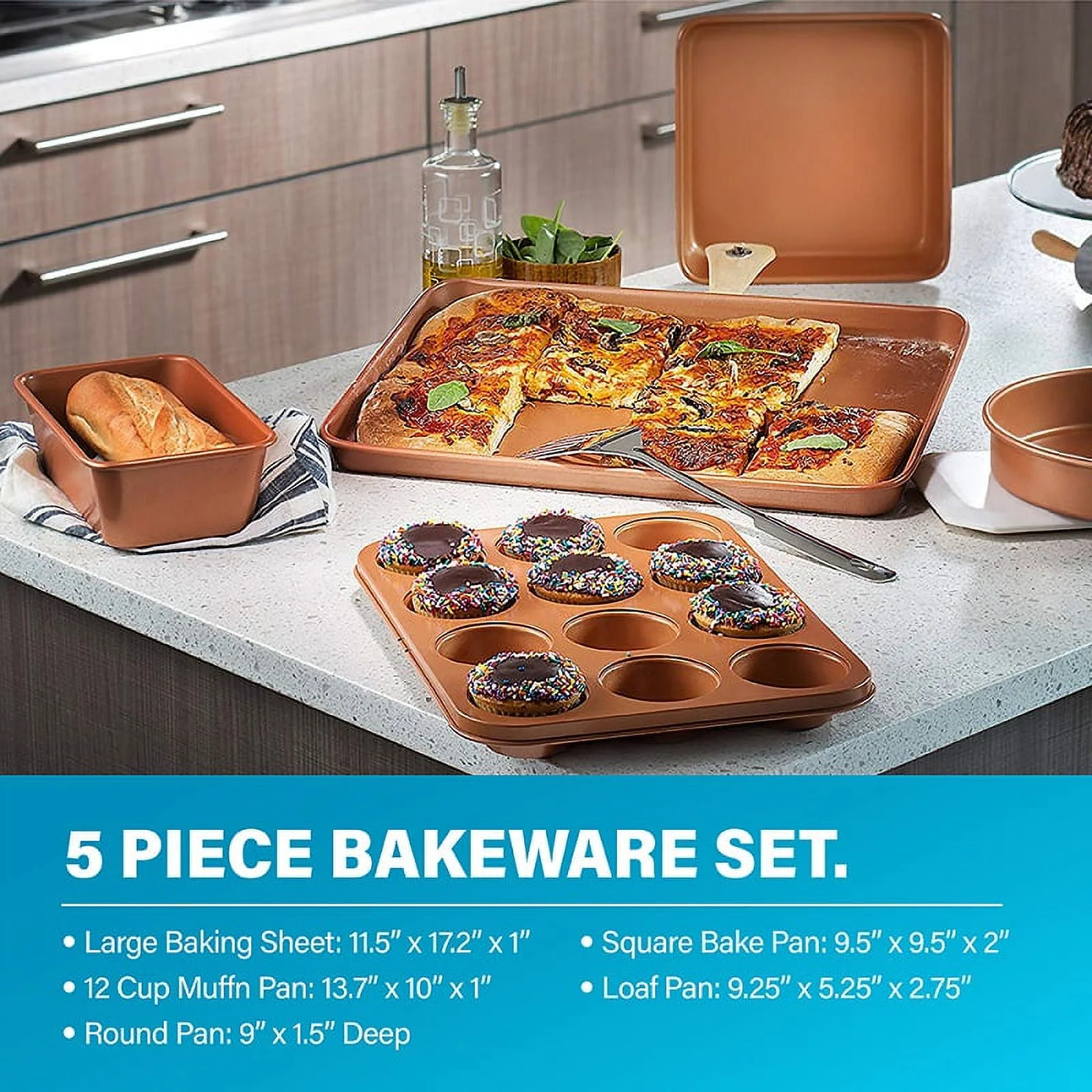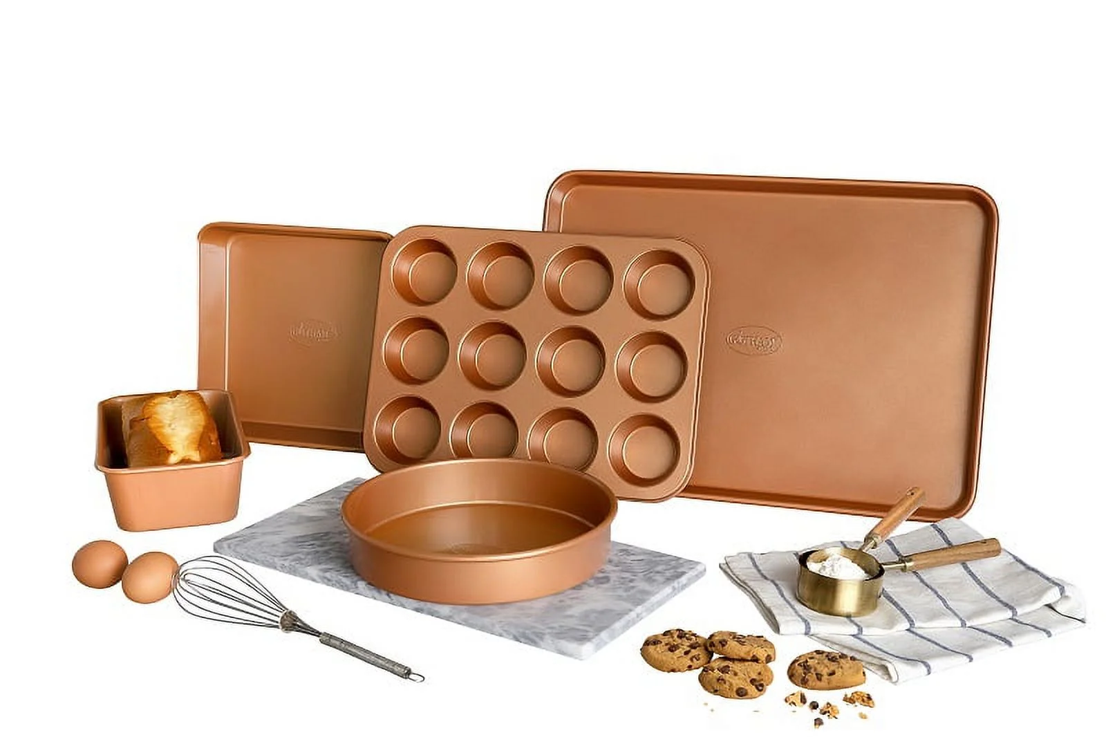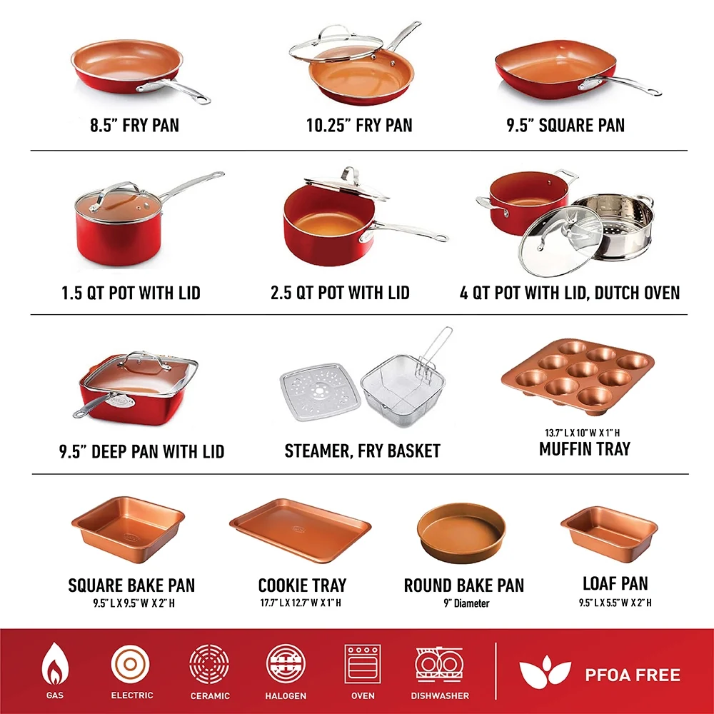 - COMPLETE KITCHEN IN A BOX �C includes everything you need to completely outfit your kitchen and take cooking and baking to the next level, includes a full cookware set with frying pans, skillets, saucepans, stock pots with tempered glass lids, a deep frying and casserole pan with a steamer tray, fry basket and lid plus a complete pro baking set with cookie sheet/jelly roll pan, loaf pan, muffin tin, square pan, stretch & fresh Tupperware and more!