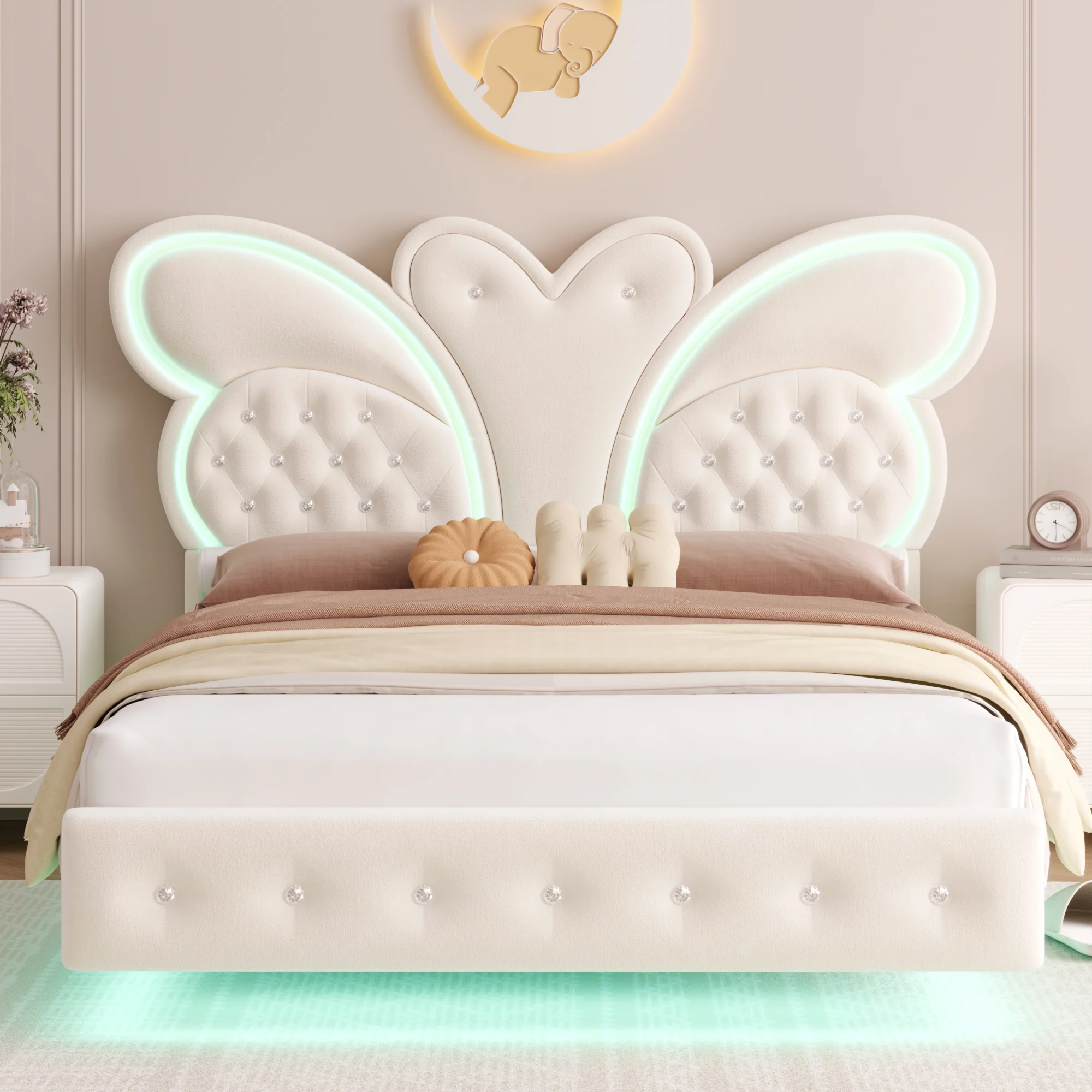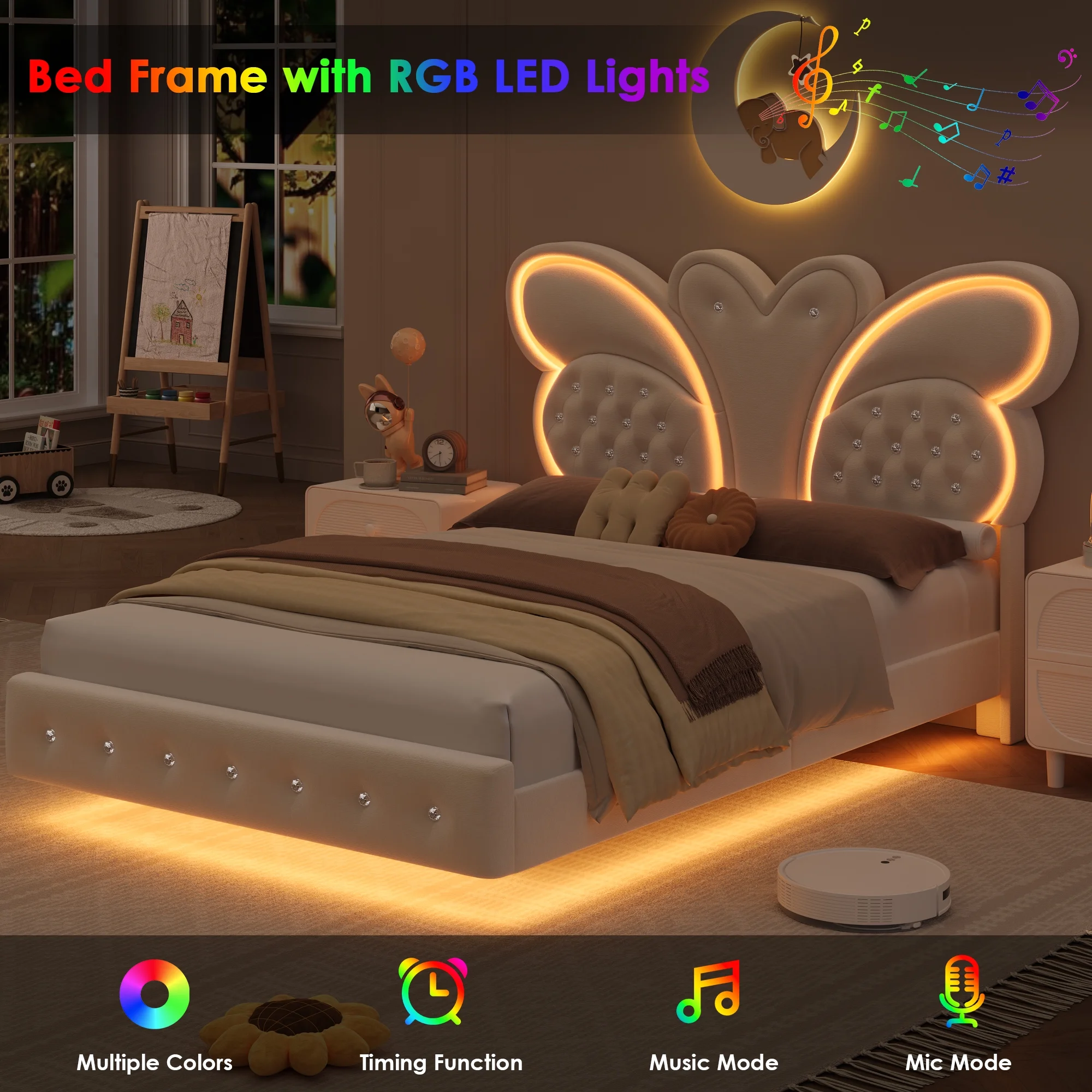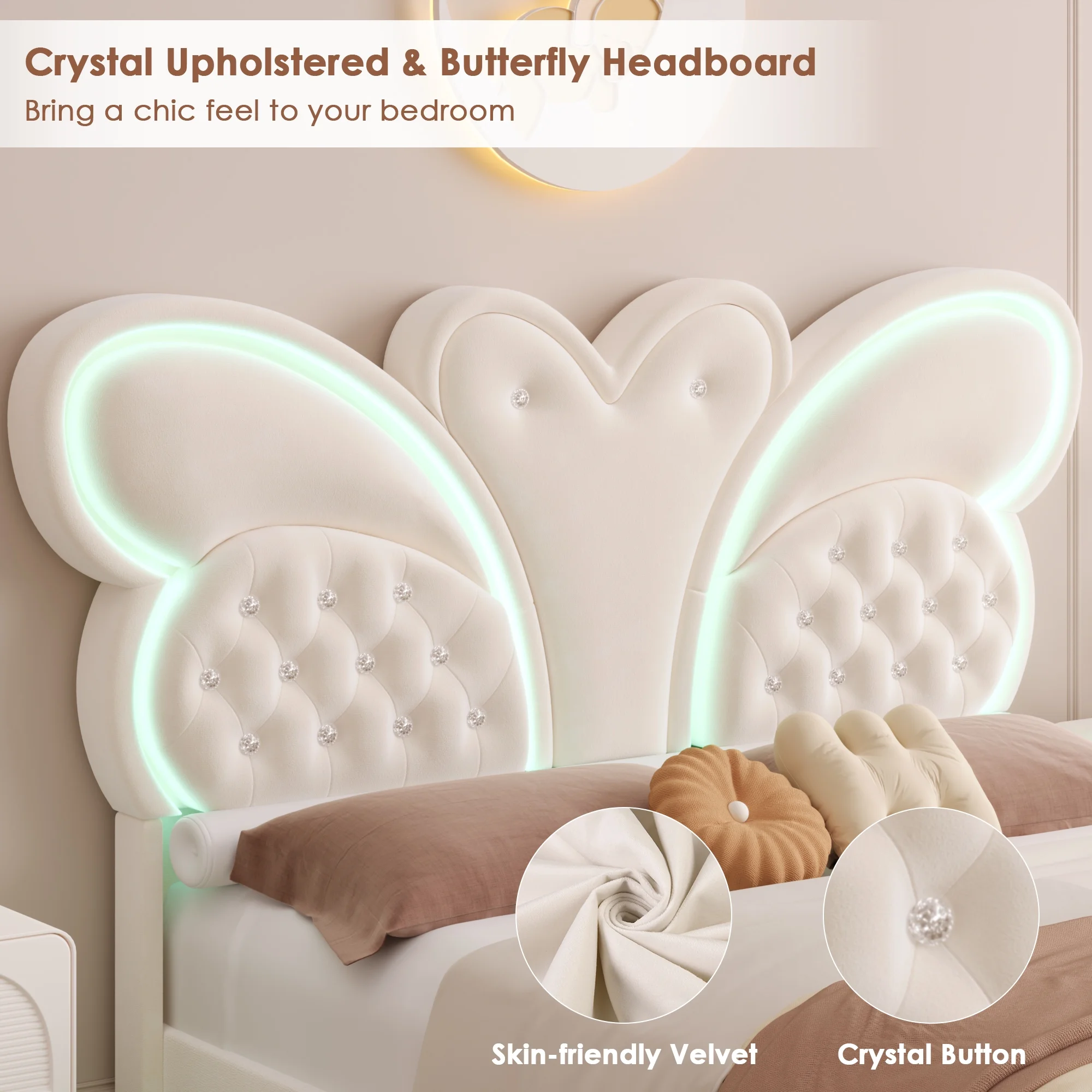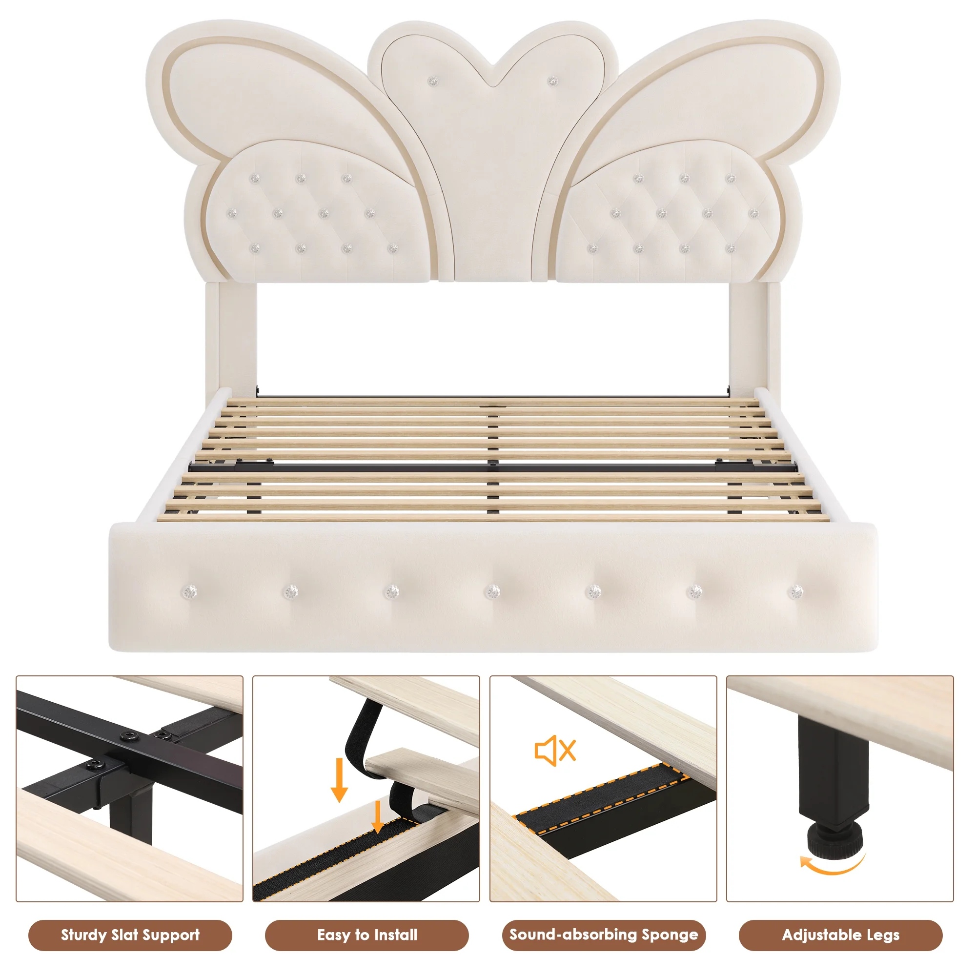 Butterfly Headboard: This floating bed frame features a stunning butterfly headboard with a velvet button-tufted upholstered platform, elevating your bedroom.