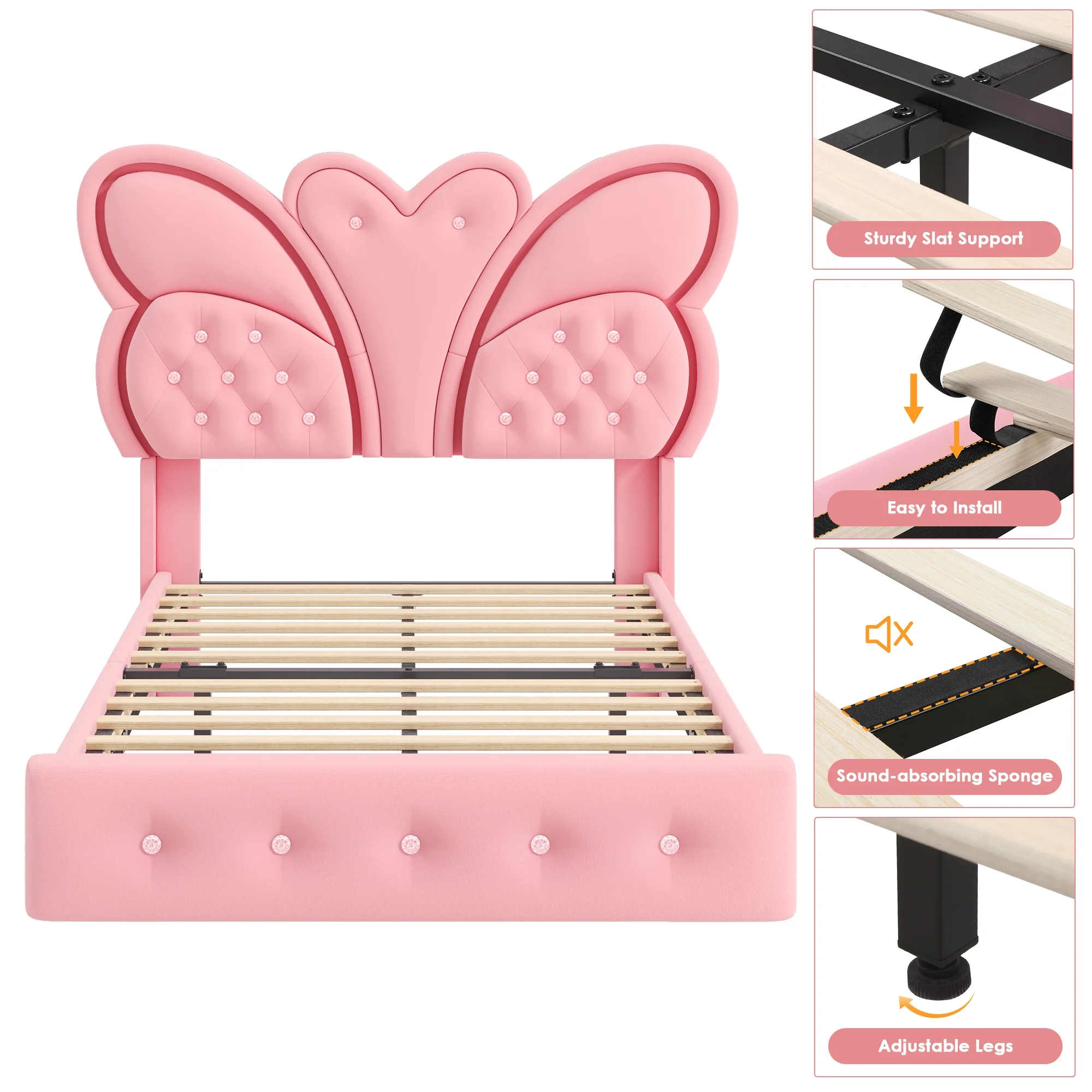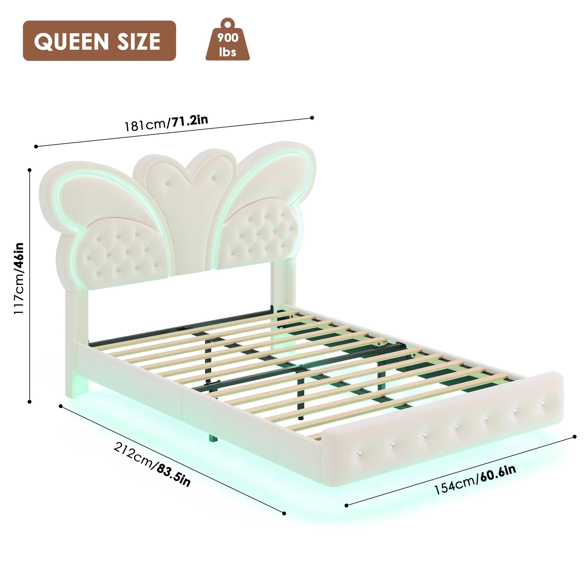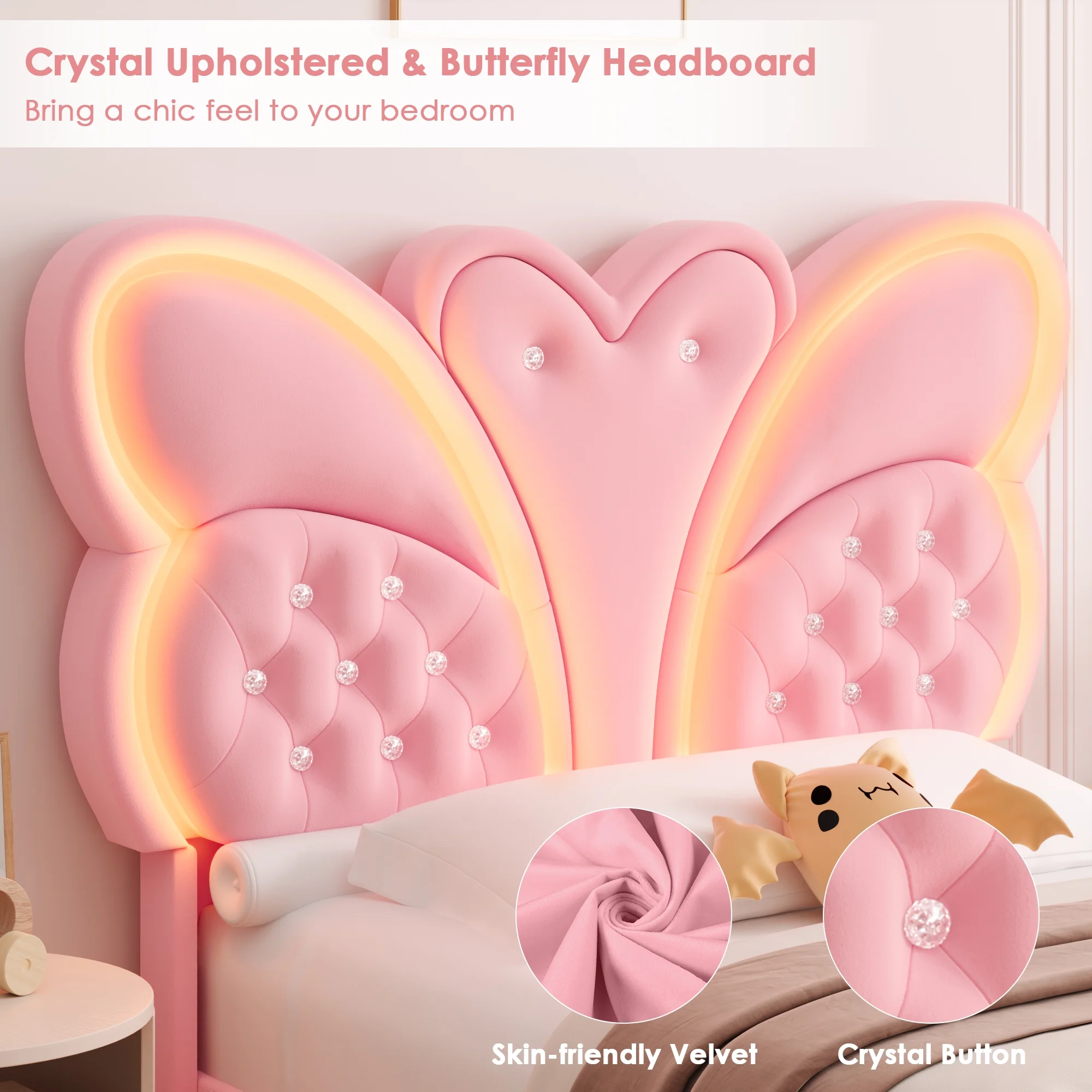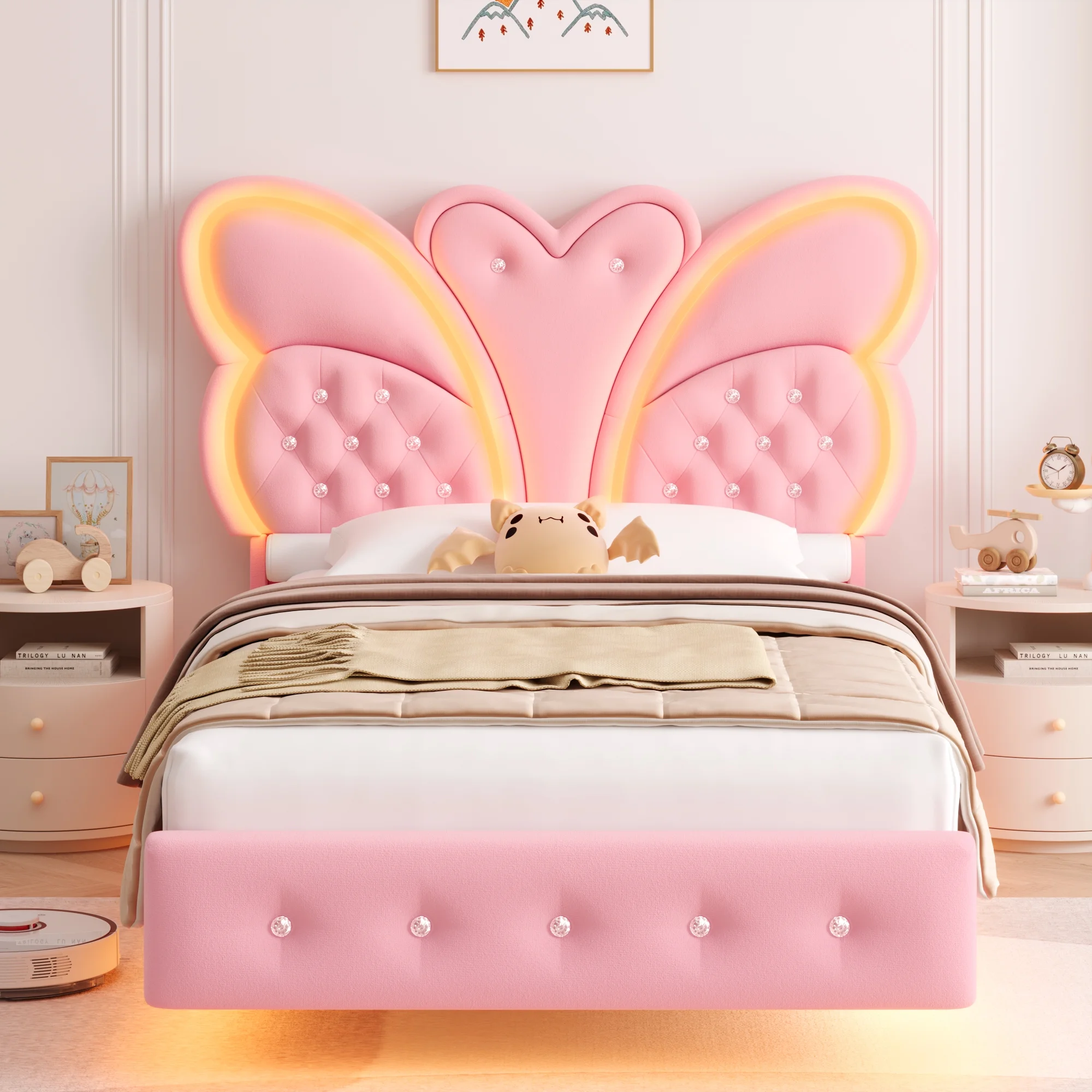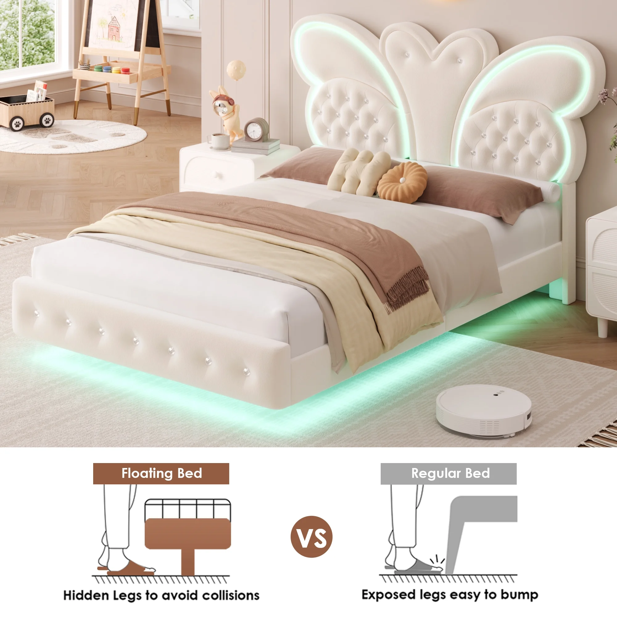 Butterfly Headboard: This floating bed frame features a stunning butterfly headboard with a velvet button-tufted upholstered platform, elevating your bedroom.
