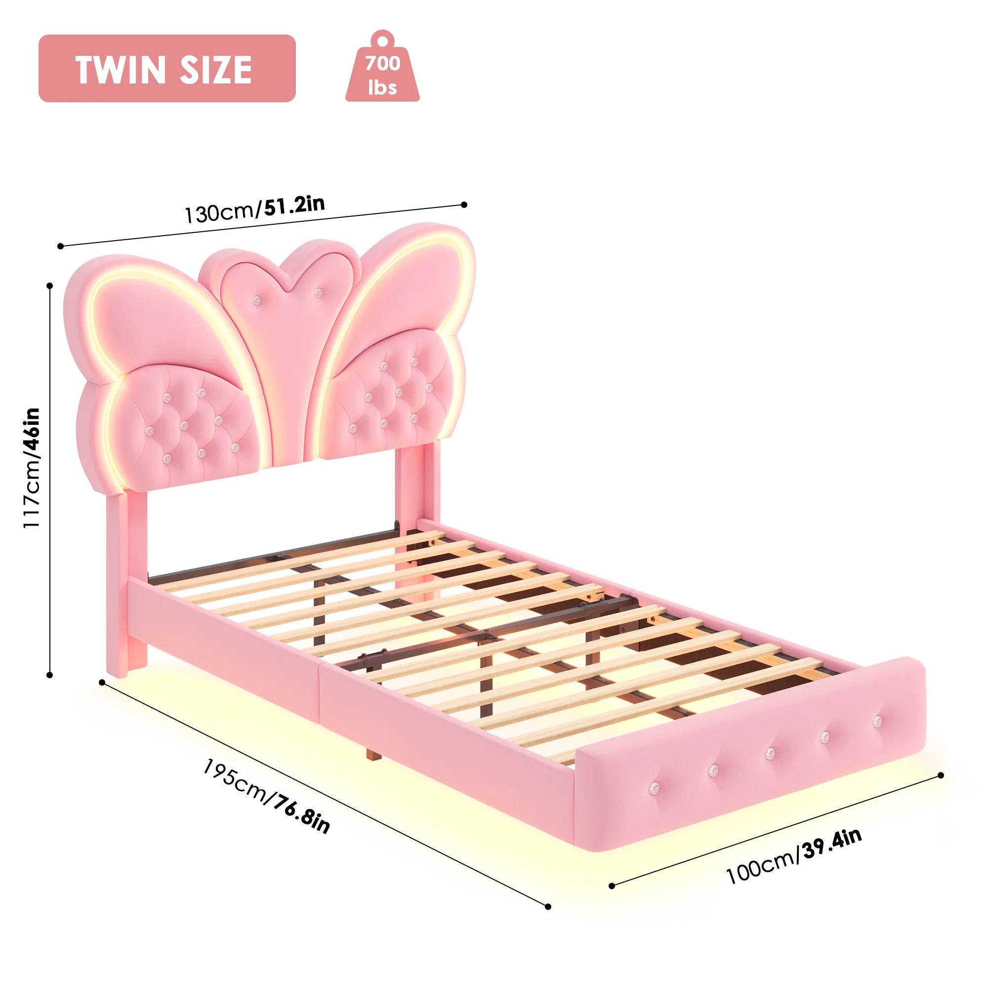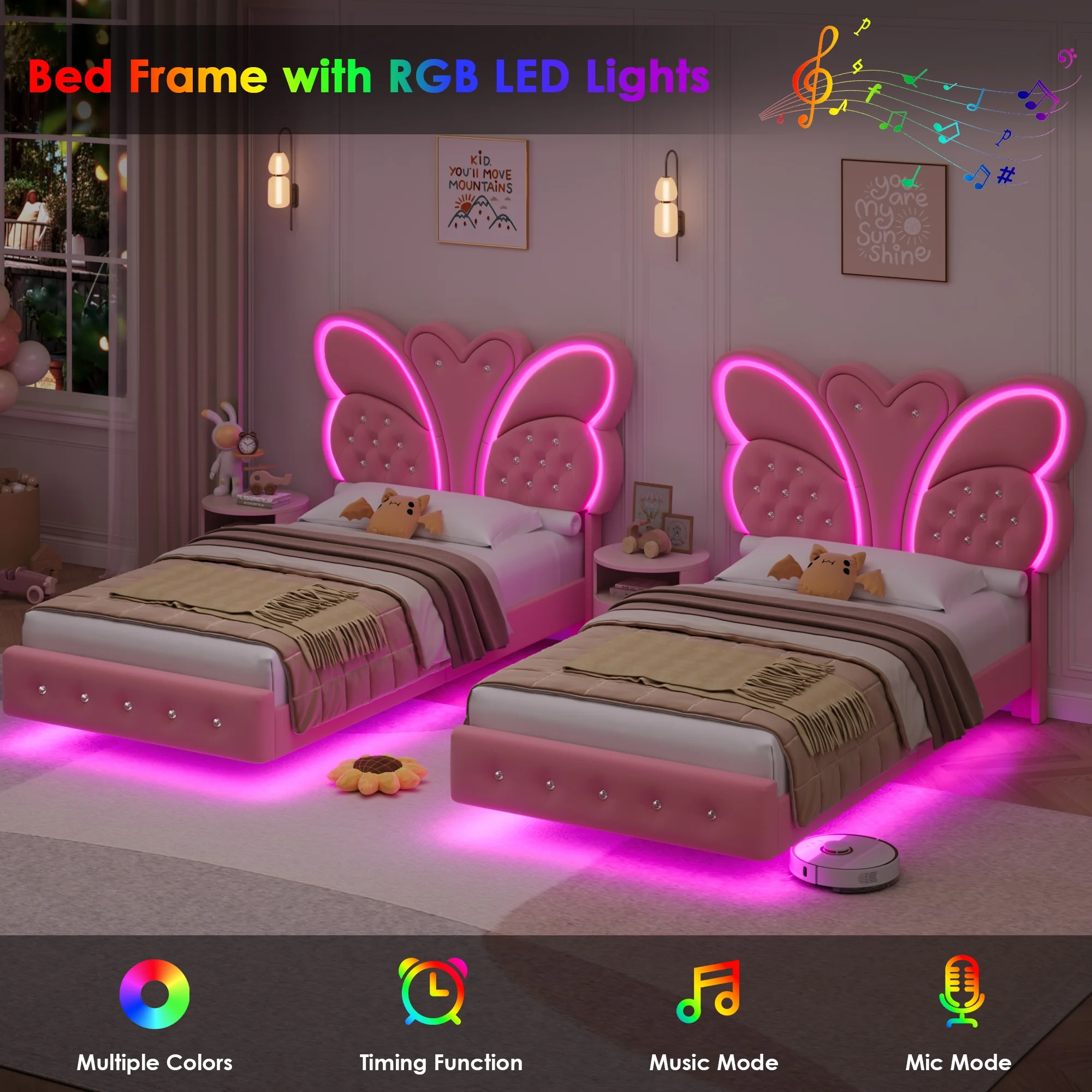 Elevate your bedroom with the Homfa Twin Size Floating LED Bed Frame. This stunning platform bed features a velvet button-tufted headboard with a butterfly design, creating a luxurious and contemporary look. The floating frame features an innovative design that looks and feels like it's floating in the air, giving it a lightweight feel. The floating bed frame features LED lights with DIY colors, music modes, timer settings, and adjustable brightness, controllable via remote or app, to create a unique atmosphere. Crafted with quality materials, this bed frame offers ample support and a maximum load weight of 700 pounds. The included assembly kit and instructions make it easy to set up, transforming your space into a cozy and stylish retreat.