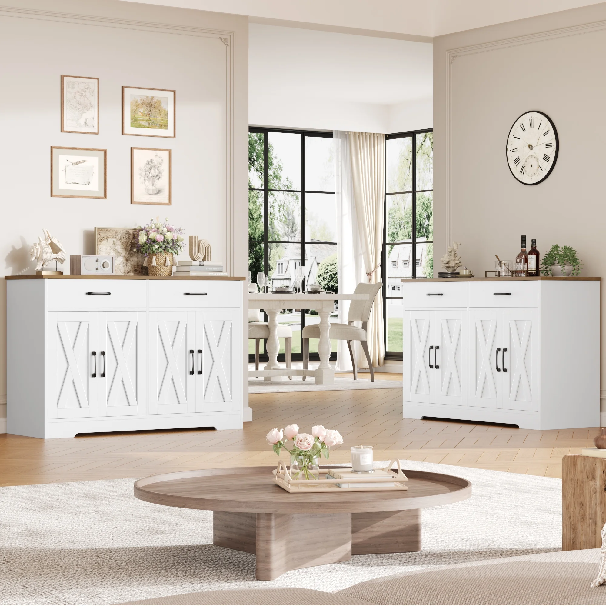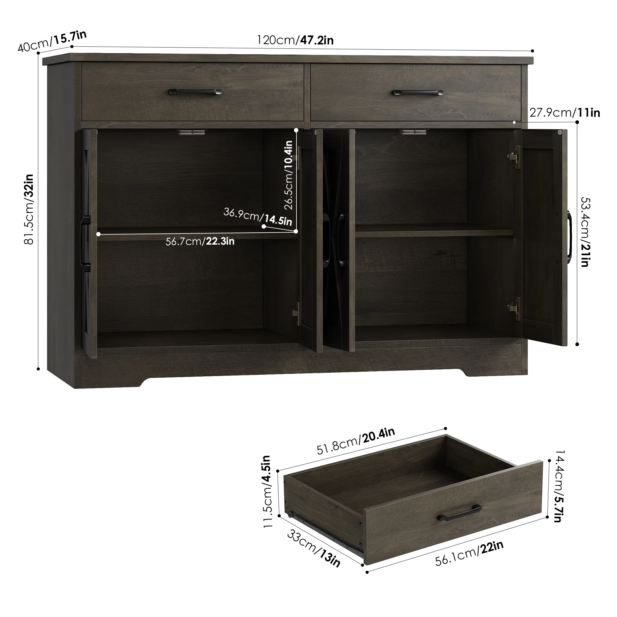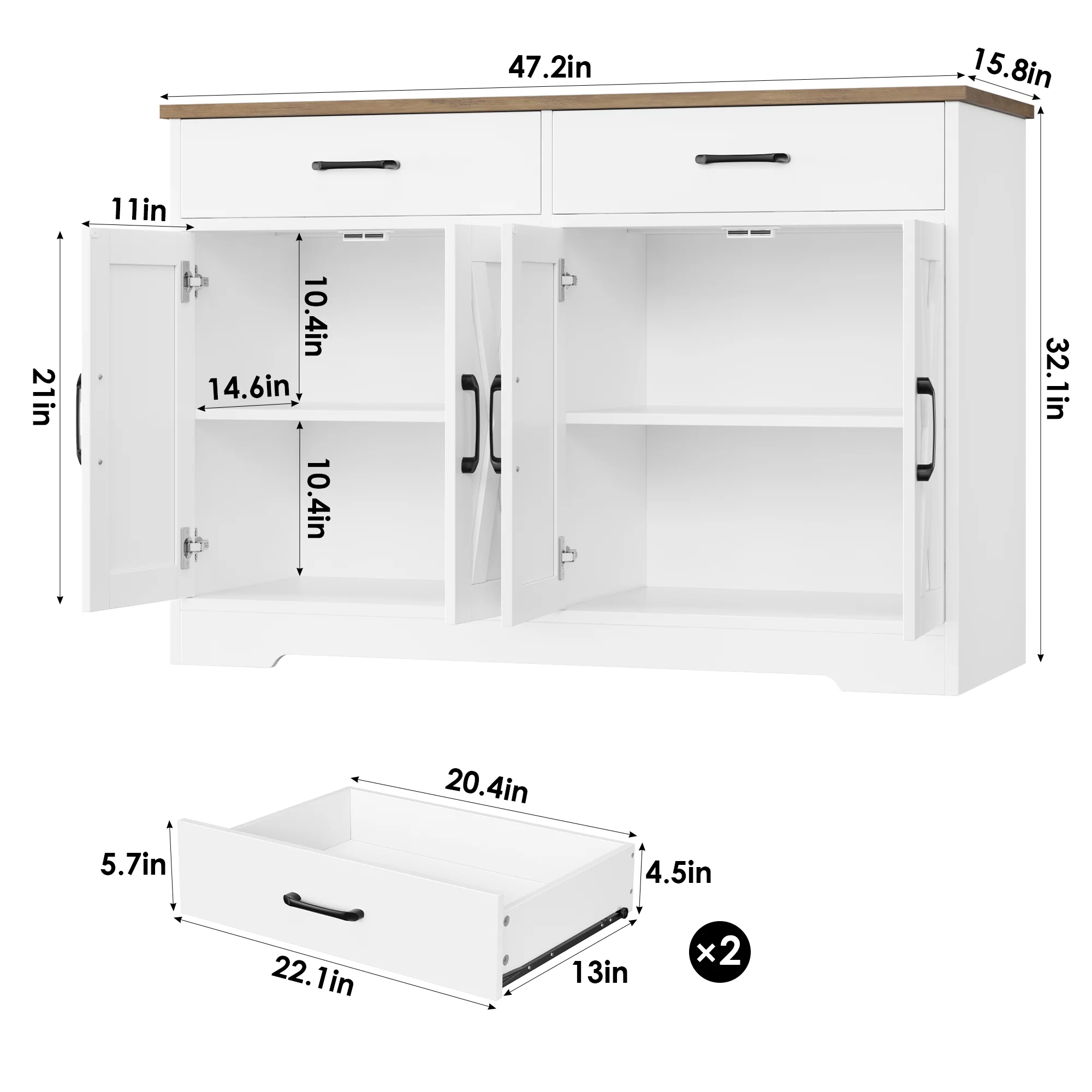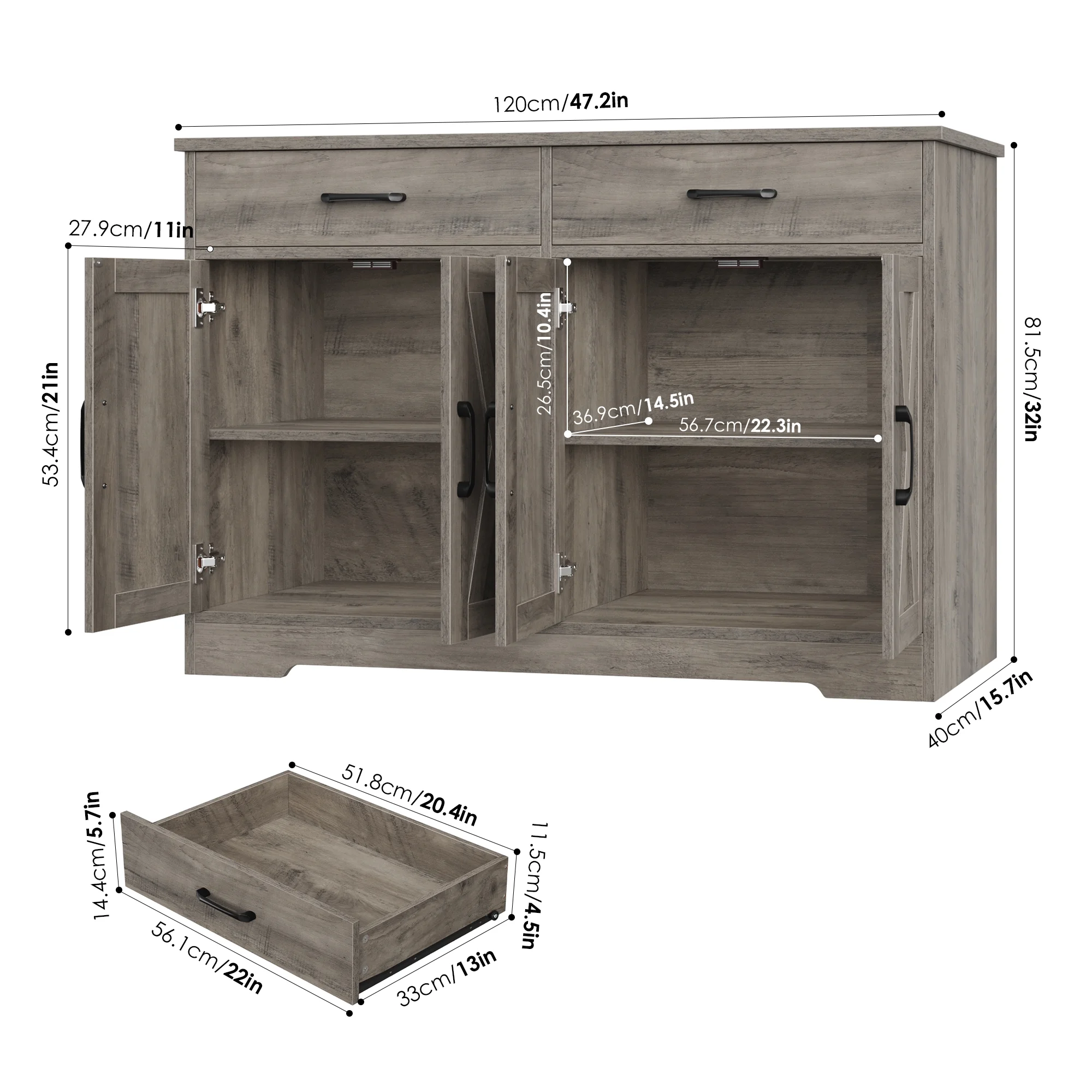 Ample Storage Space: Farmhouse buffet cabinets of 47" inches wide tabletop for beautiful decorations, souvenirs, china and so on. 2 large drawers for knives, forks, cutlery, etc. 4 doors with storage shelves inside, protect your personal items. The living room storage cabinet incorporates both open and closed storage space to meet your different needs.