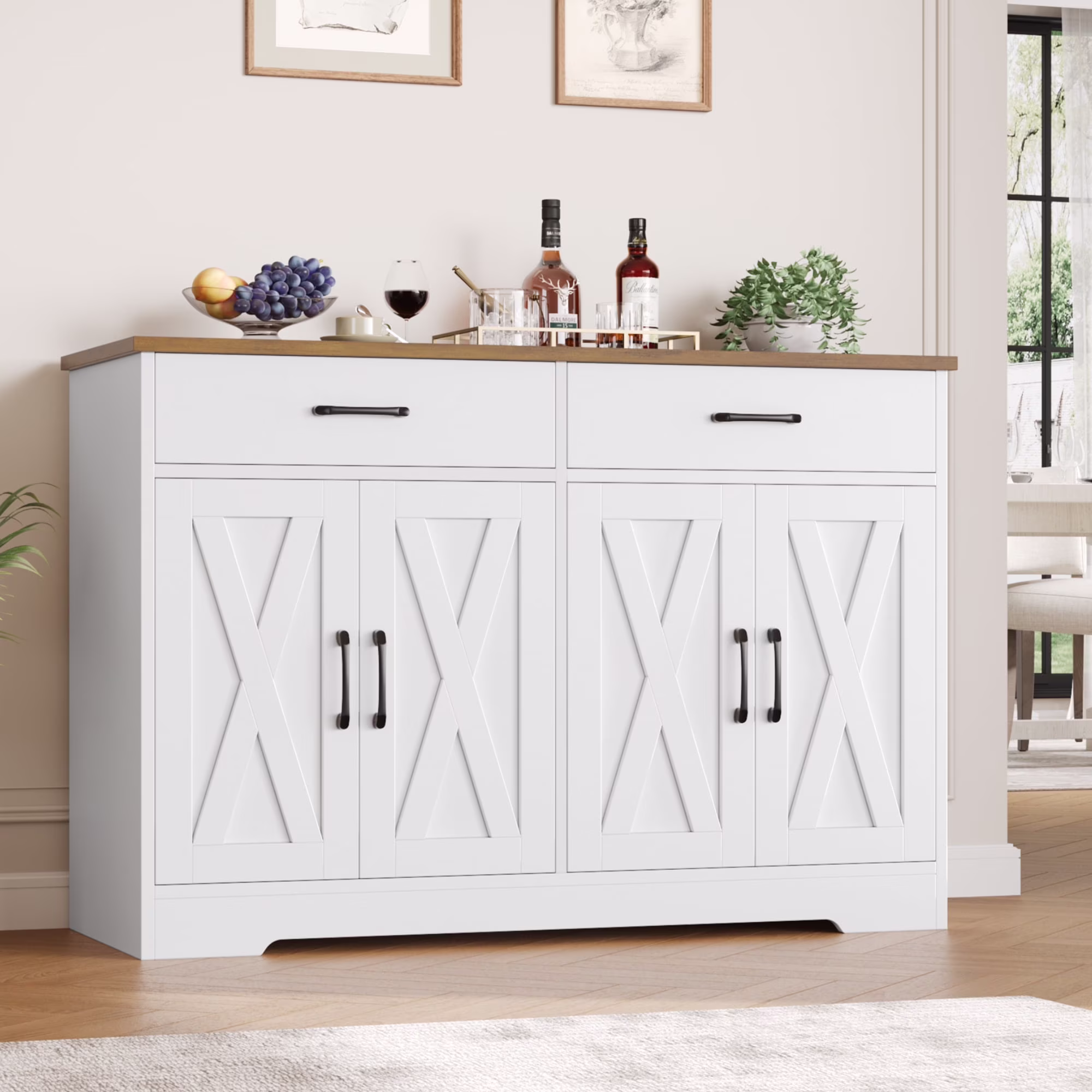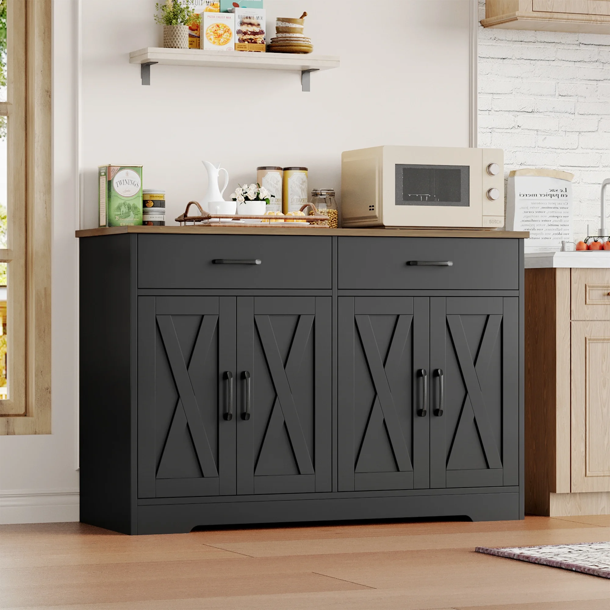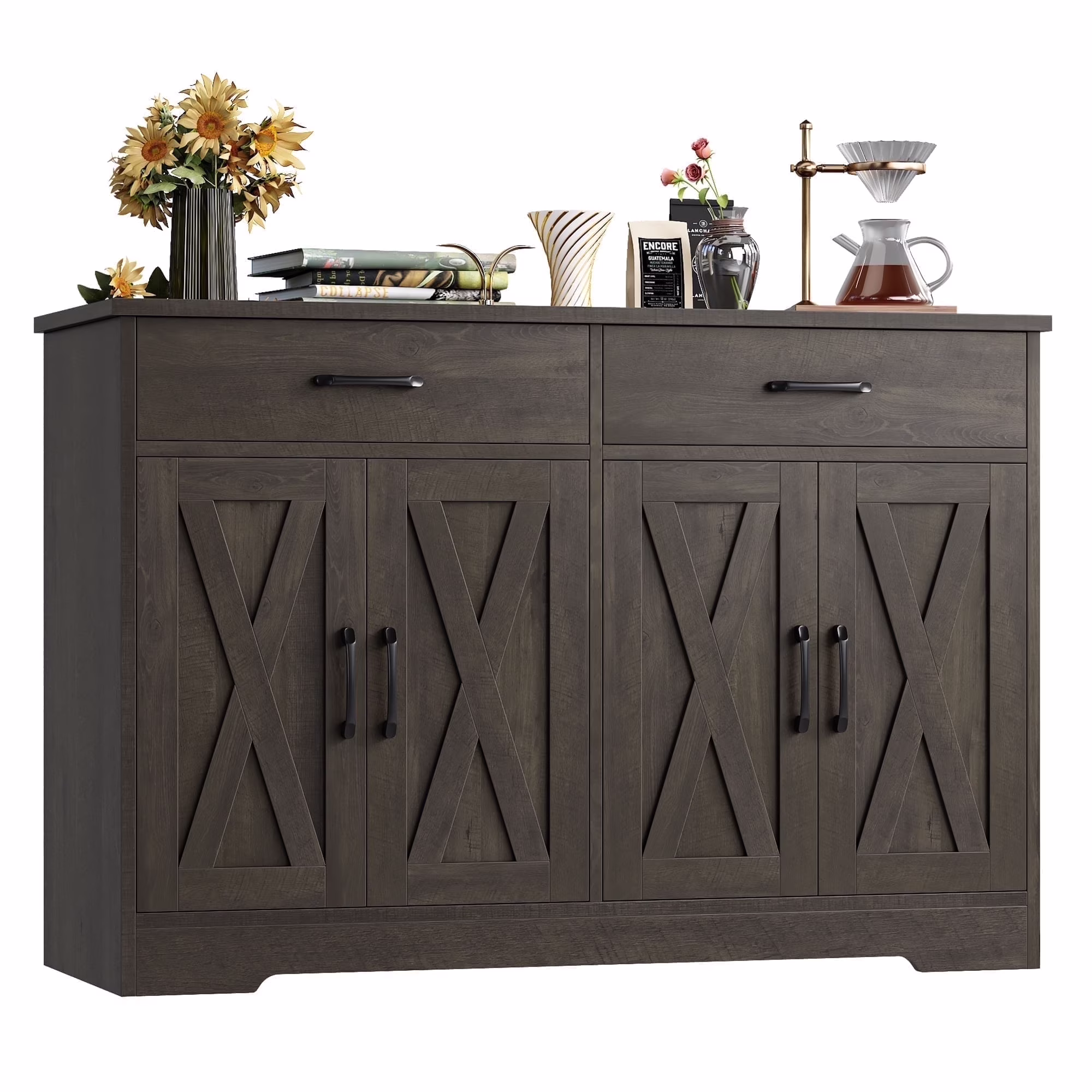 Ample Storage Space: Farmhouse buffet cabinets of 47" inches wide tabletop for beautiful decorations, souvenirs, china and so on. 2 large drawers for knives, forks, cutlery, etc. 4 doors with storage shelves inside, protect your personal items. The living room storage cabinet incorporates both open and closed storage space to meet your different needs.