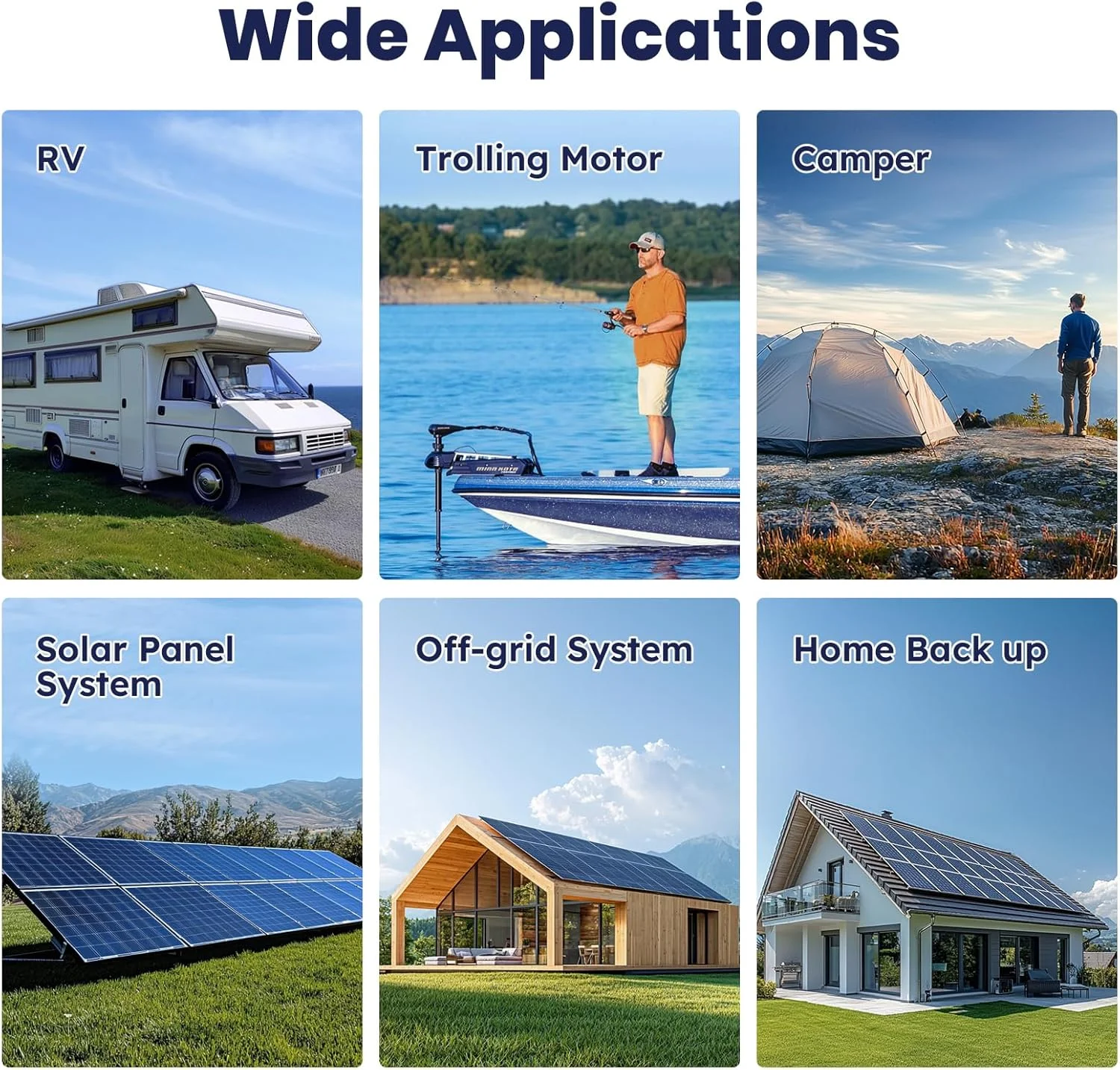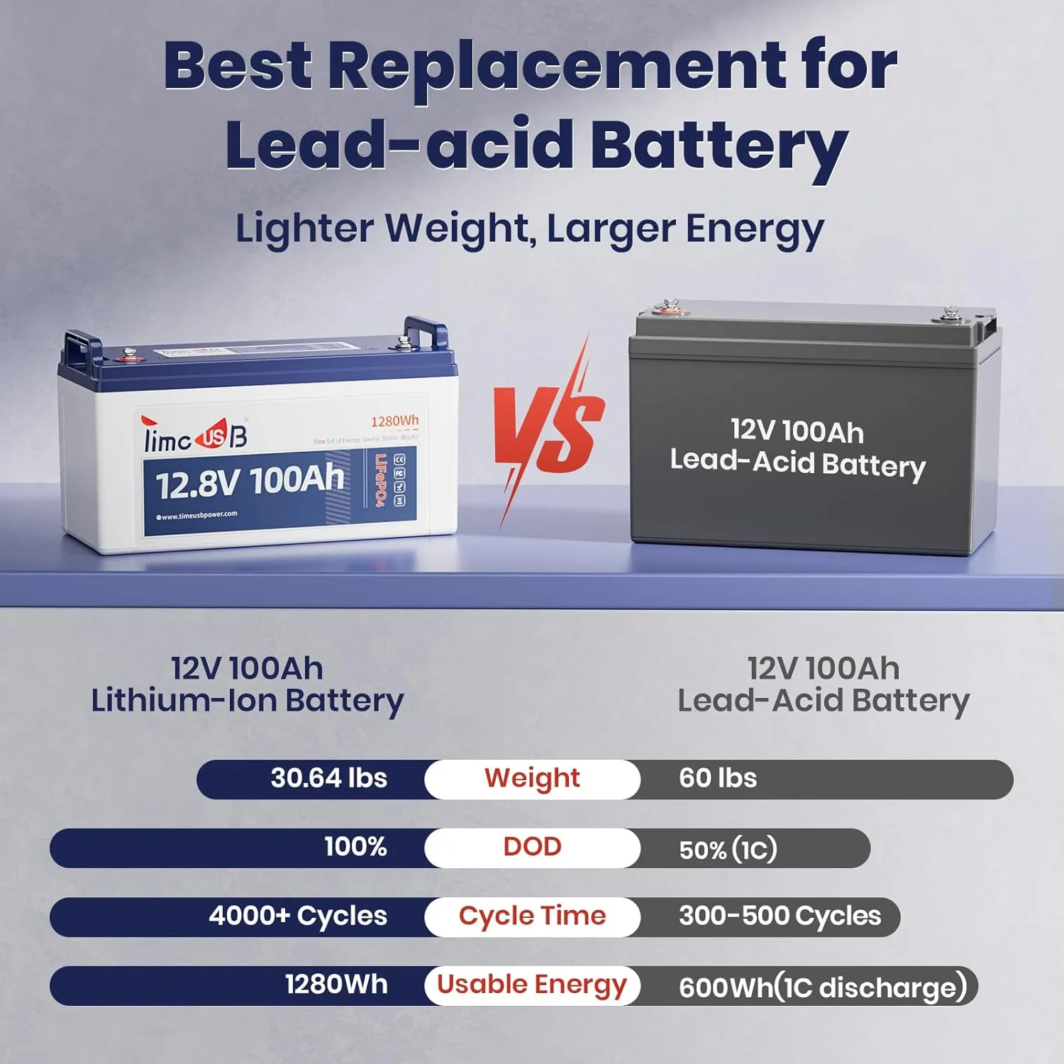 - �?Lightweight & High Energy Density: Say goodbye to bulky lead-acid batteries! Our 12V 100Ah lithium battery is lightweight yet delivers a powerful 1280Wh of usable energy. Perfect for marine, RV, and off-grid systems, it offers superior performance and efficiency in a compact design.