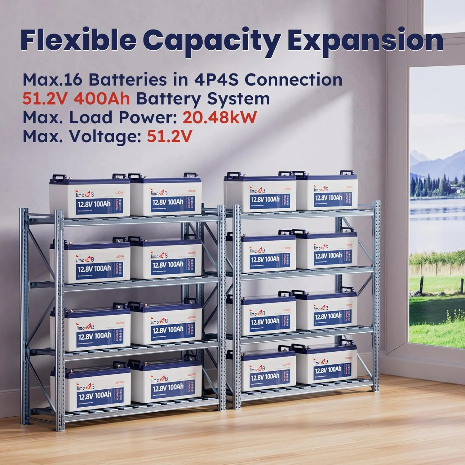 - �?Expandable Capacity for Versatile Use: Need more power? Connect up to 16 batteries in a 4P4S configuration to create a massive 51.2V 400Ah system. Ideal for large solar setups, off-grid living, and high-demand applications, this battery grows with your needs.