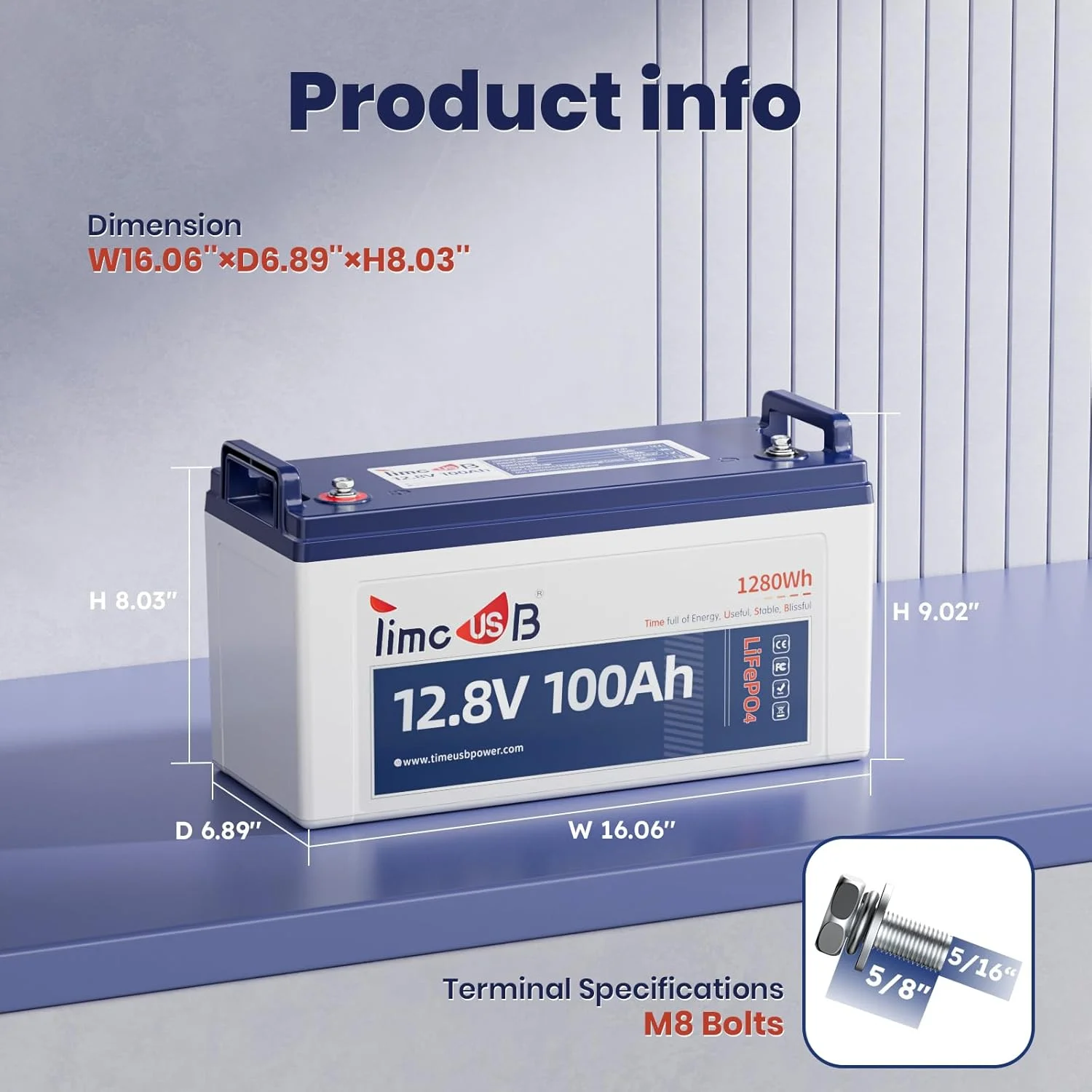 - ✅ Built-in 100A BMS for Ultimate Protection:The Timeusb 12.8V 100Ah LiFePO4 battery features an advanced 100A Battery Management System (BMS) that safeguards against overcharging, over-discharging, overcurrent, overheating, and short circuits. Enjoy peace of mind with enhanced safety and extended battery life for all your power needs.