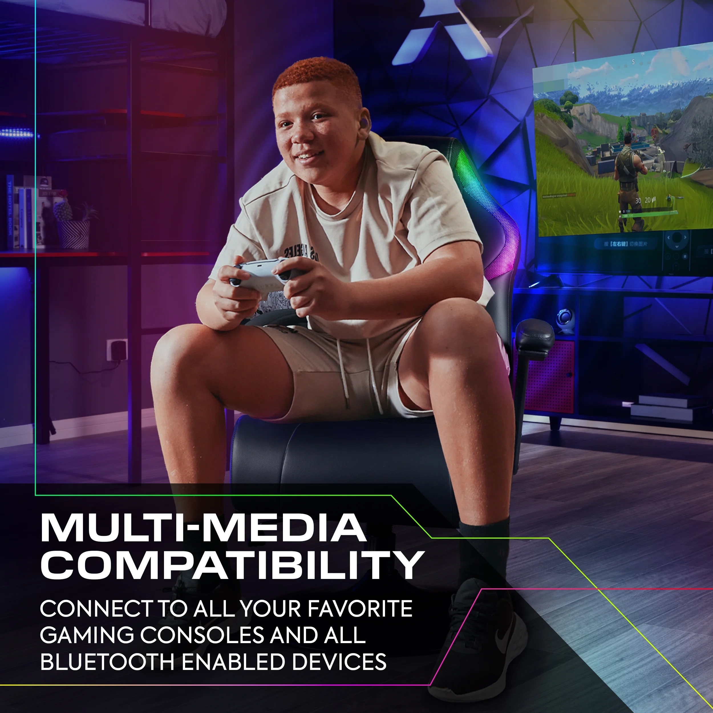 - HIGH TECH GAMING CHAIR: Integrated 2.1 Bluetooth Audio System with headrest mounted speakers and a subwoofer in the backrest provides high quality audio for added immersion in video games and movies