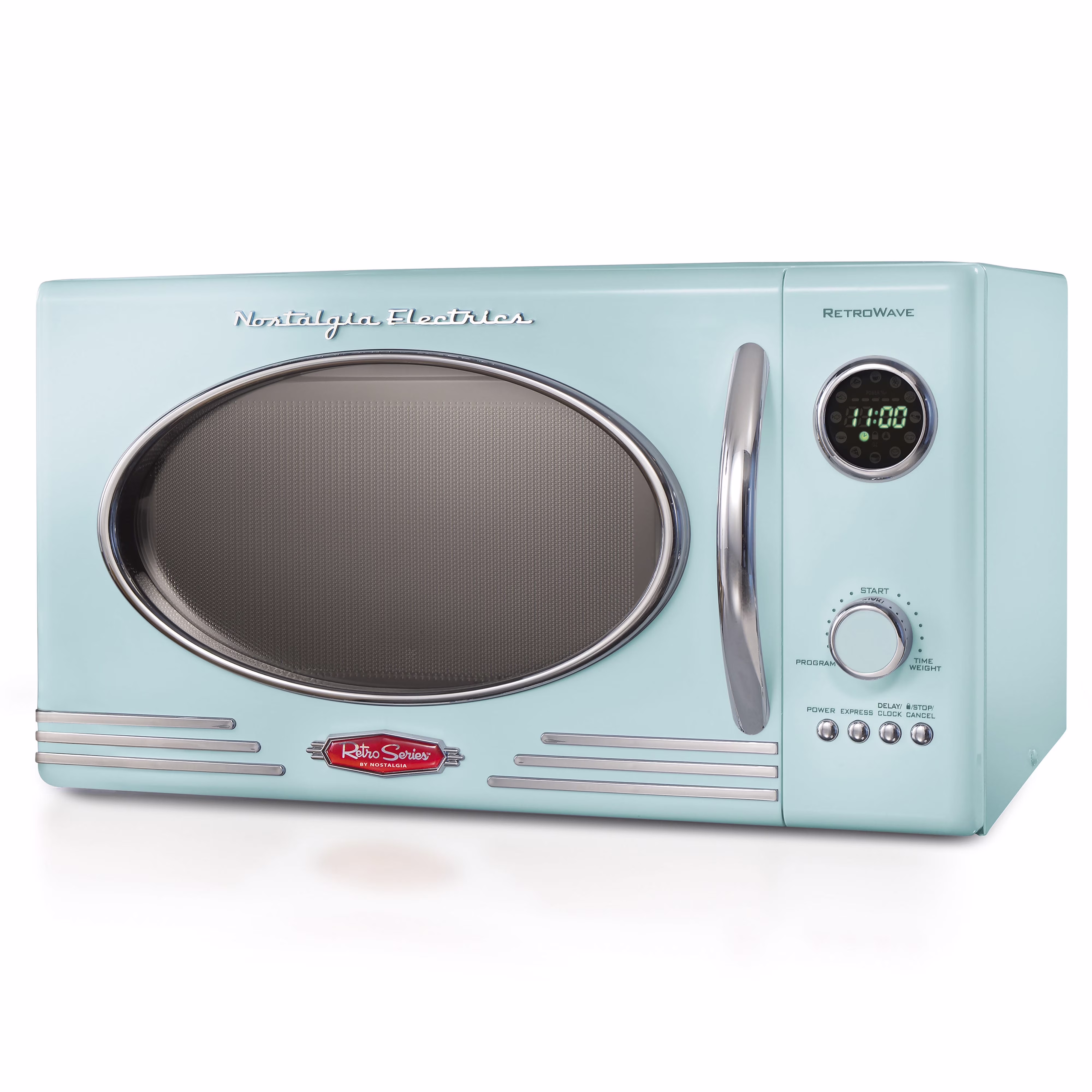 - VINTAGE ACCENTS: Boost your kitchen with a classic look. This large microwave has a sleek chrome door handle, control panel, and accents that add fun and flair to this unique retro-styled appliance.