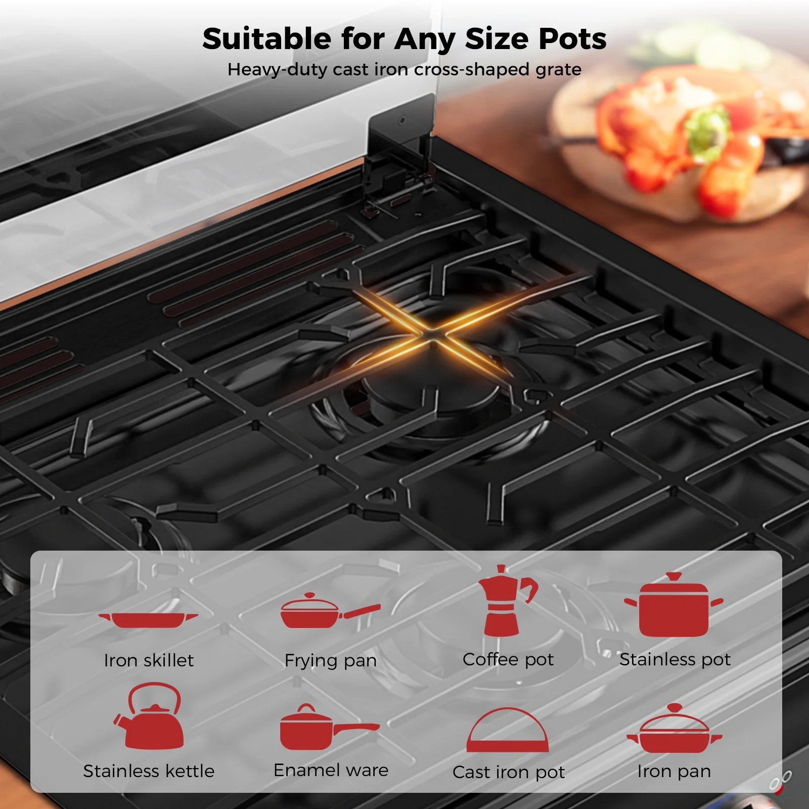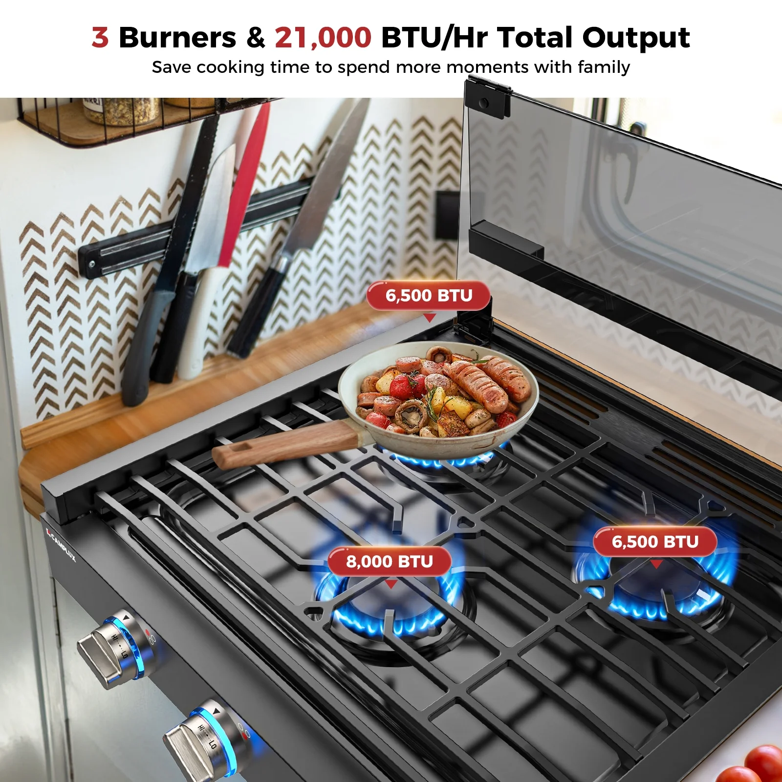 - 3 Powerful Burners: High-efficiency sealed burners with a center 8,000 BTU high-output burner for boiling, searing, and frying, and two 6,500 BTU simmering burners for consistent, precise low heat for delicate cuisine.