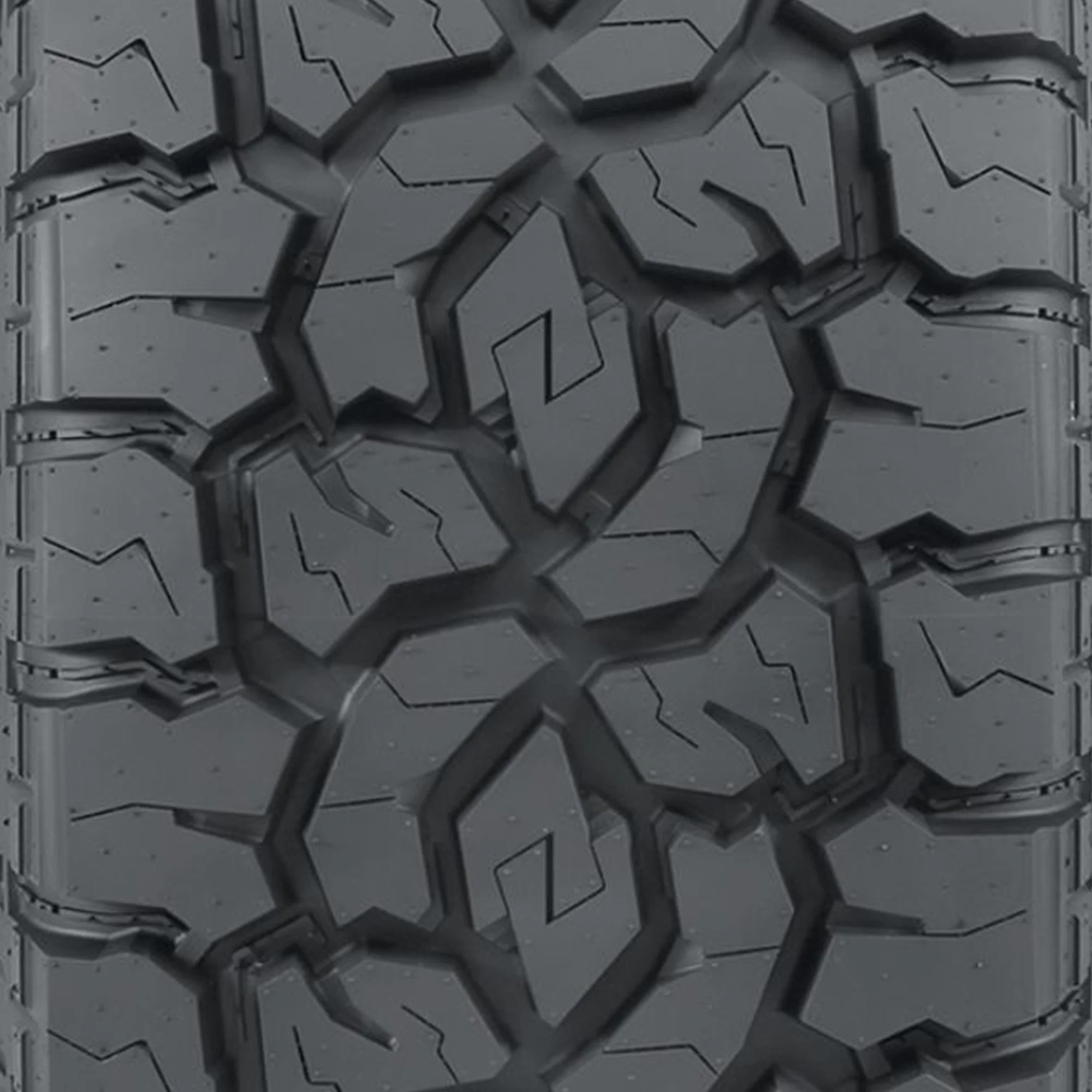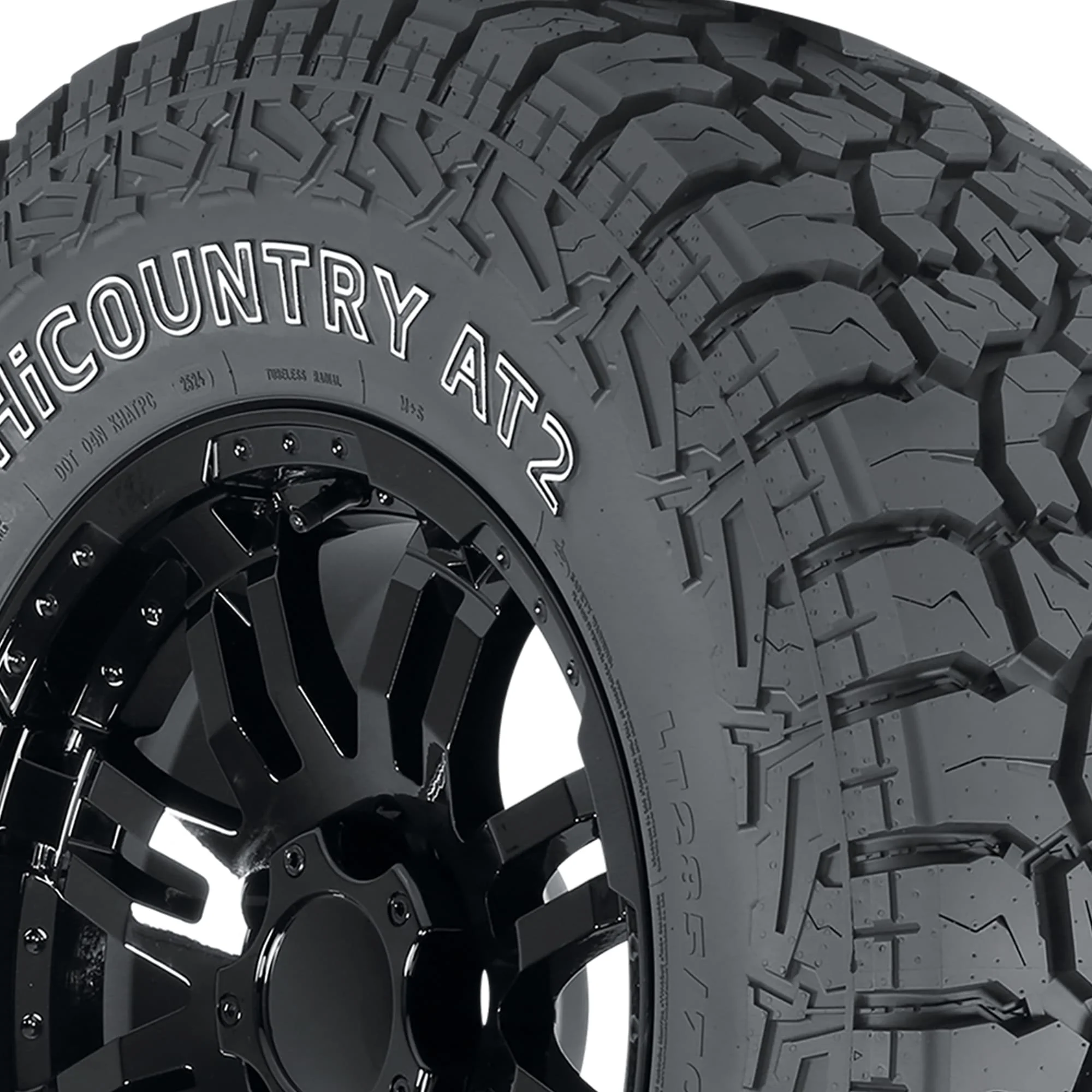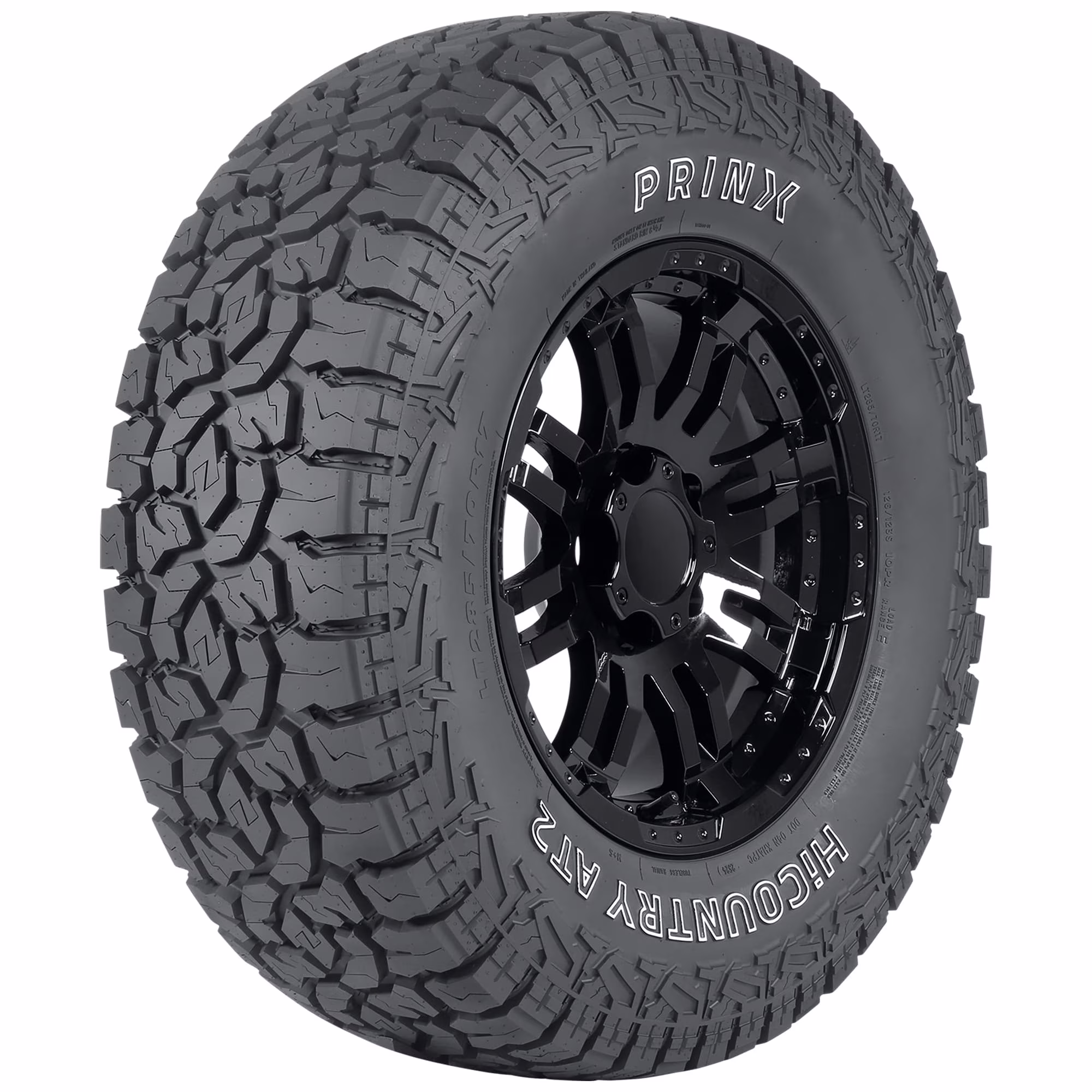 The Prinx HiCountry A/T2 is an all-terrain tire built for SUVs, Jeeps, and light trucks, providing strong on- and off-road traction year-round. You'll experience stable rides, enhanced durability, and superior damage resistance, all backed by a 50,000-mile limited manufacturer tread life warranty. This tire features Pattern Noise Simulation (PNS) for noticeably quieter and more comfortable rides, even with its aggressive capabilities. Its aggressive tread design boosts both stability and traction, whether you're on the highway or hitting the trails. Plus, the robust sidewall construction helps prevent punctures and ensures long-lasting durability in demanding conditions.