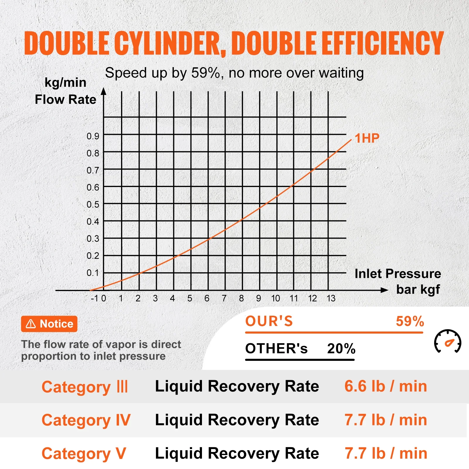 - Twin Cylinder Configuration: The 1 HP twin-cylinder brushed motor refrigerant recovery machine has a maximum liquid recovery rate of 7 7 lb/min, which is 59% faster than the single-cylinder model It can quickly recover steam and liquid refrigerants Equipped with a fan and condenser for rapid condensation and heat dissipation, ensuring stable and robust performance for long-term use