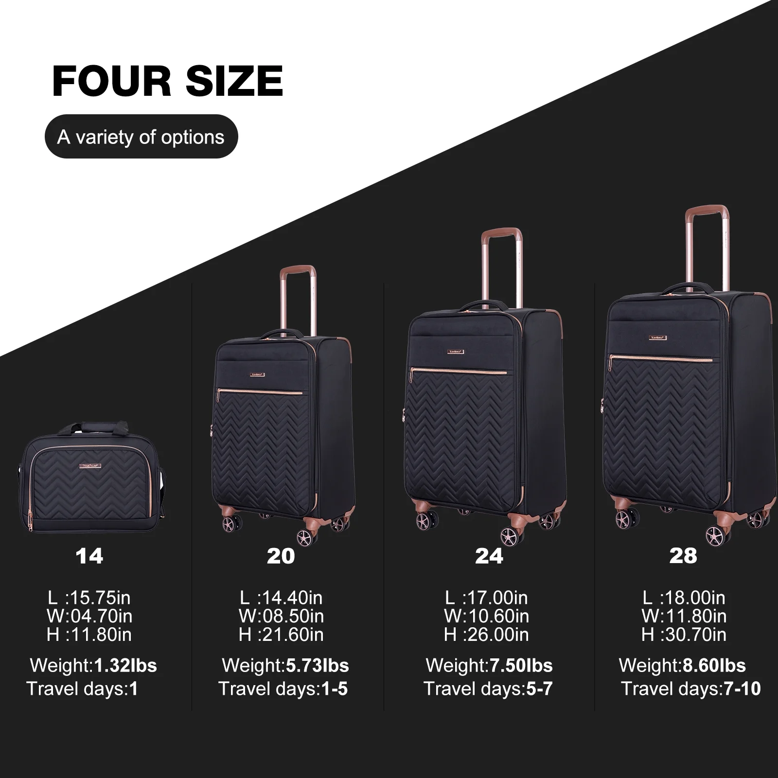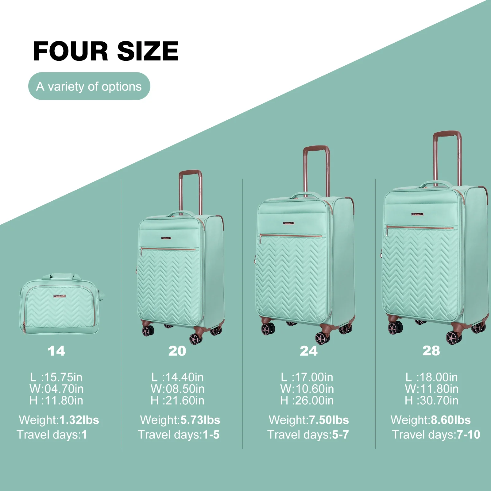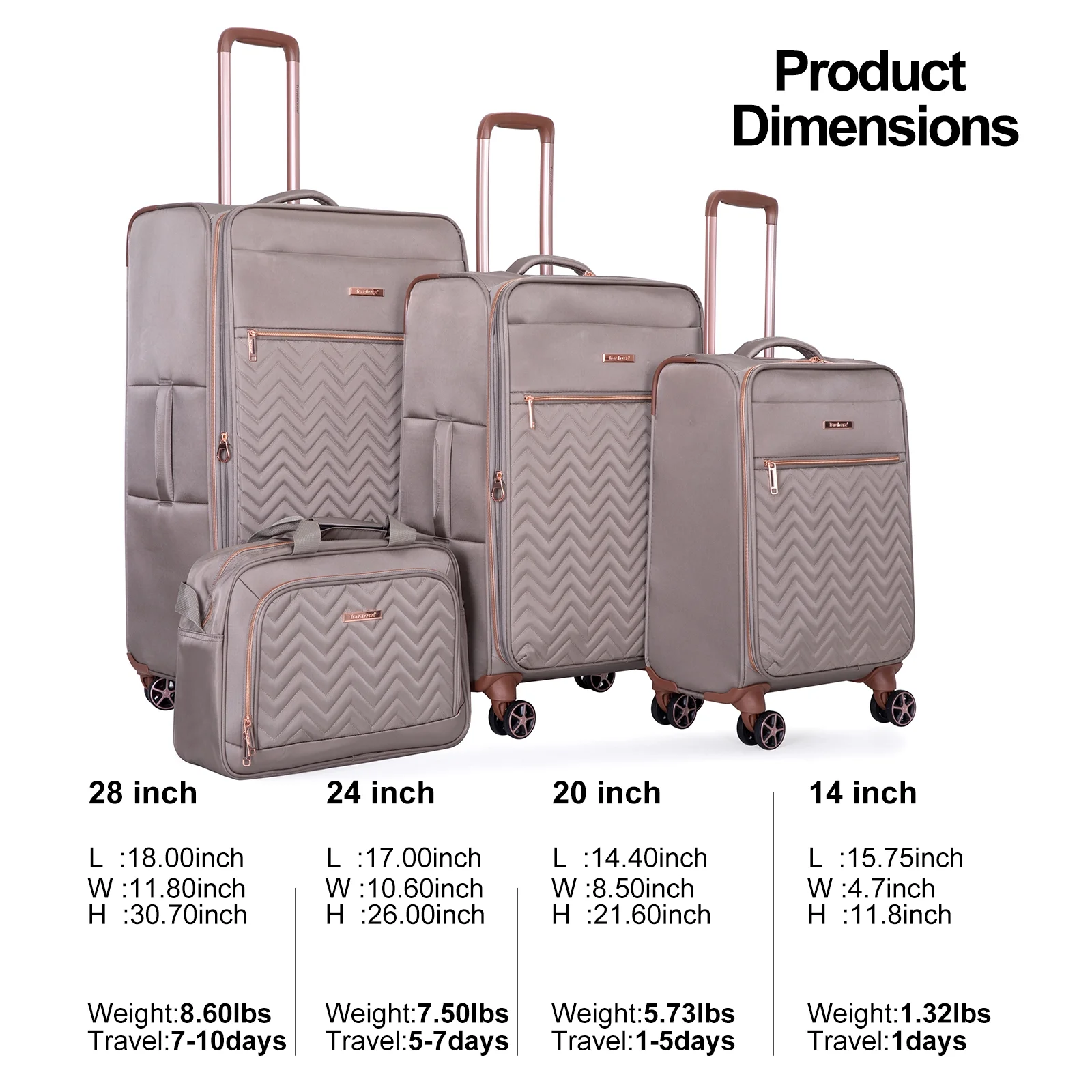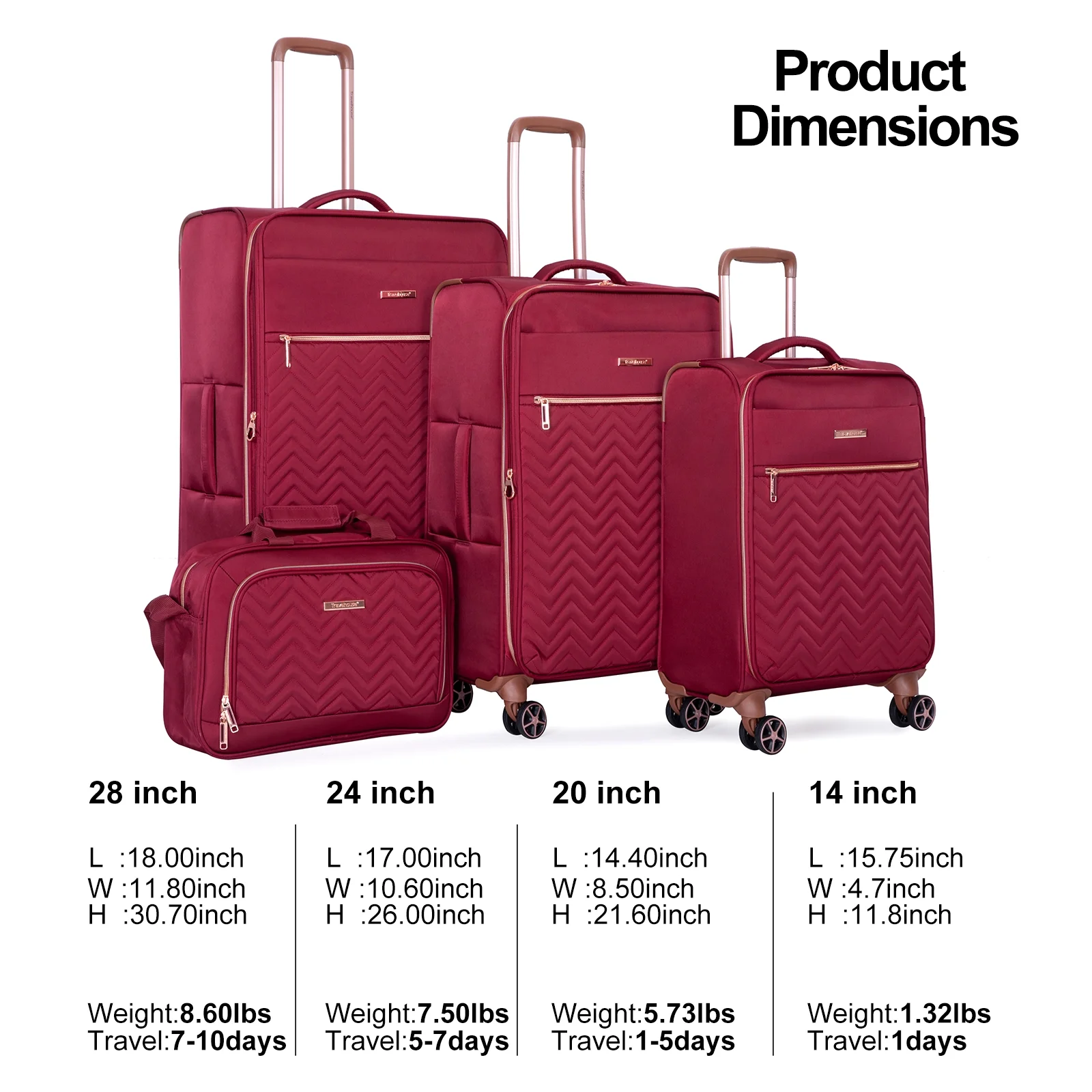 - Warranty��Two Years Warranty. Product incloud: 20in(Comply with carry-on size restrictions for domestic travel); 24&28inch suitcase (provide more space); 15 inch tote bag.