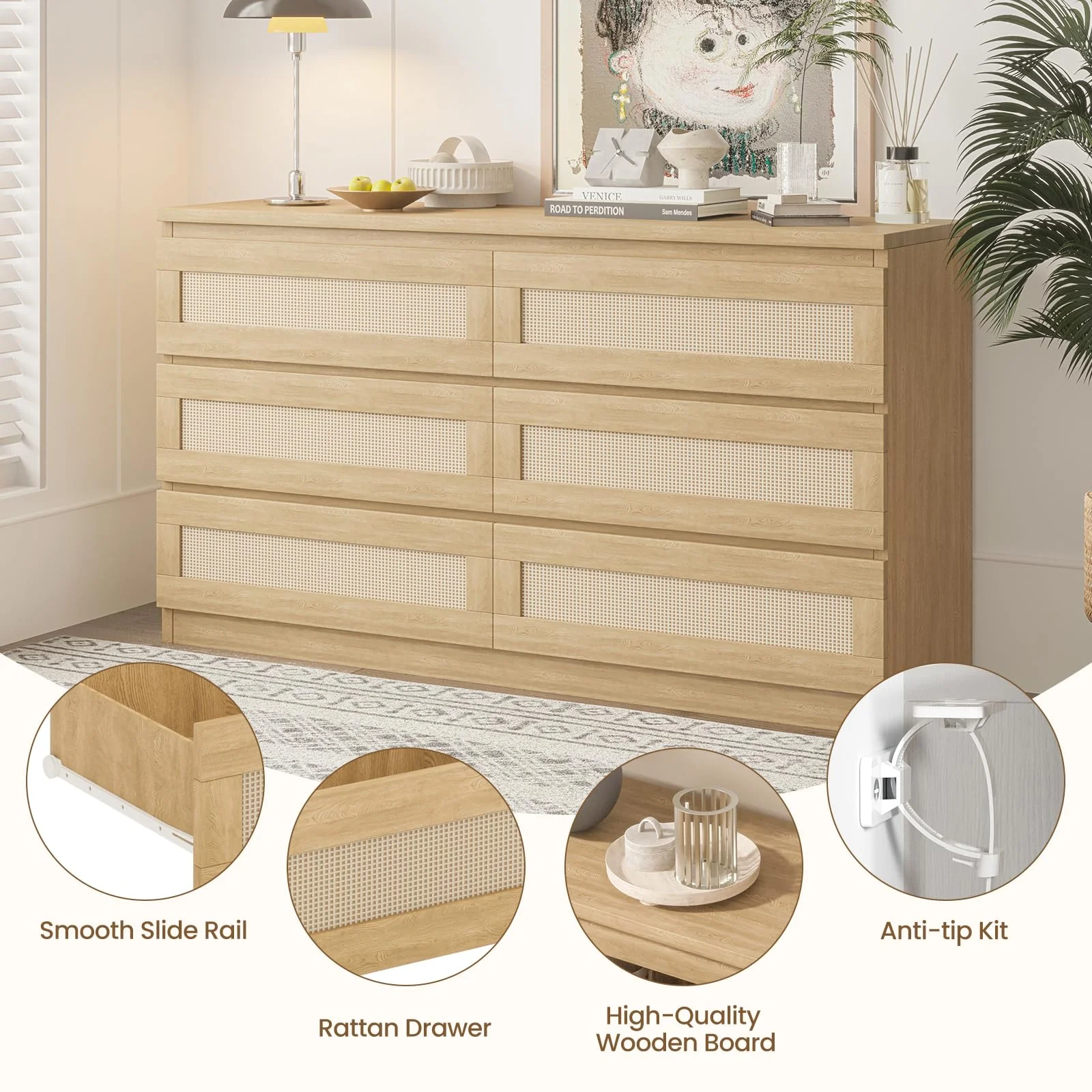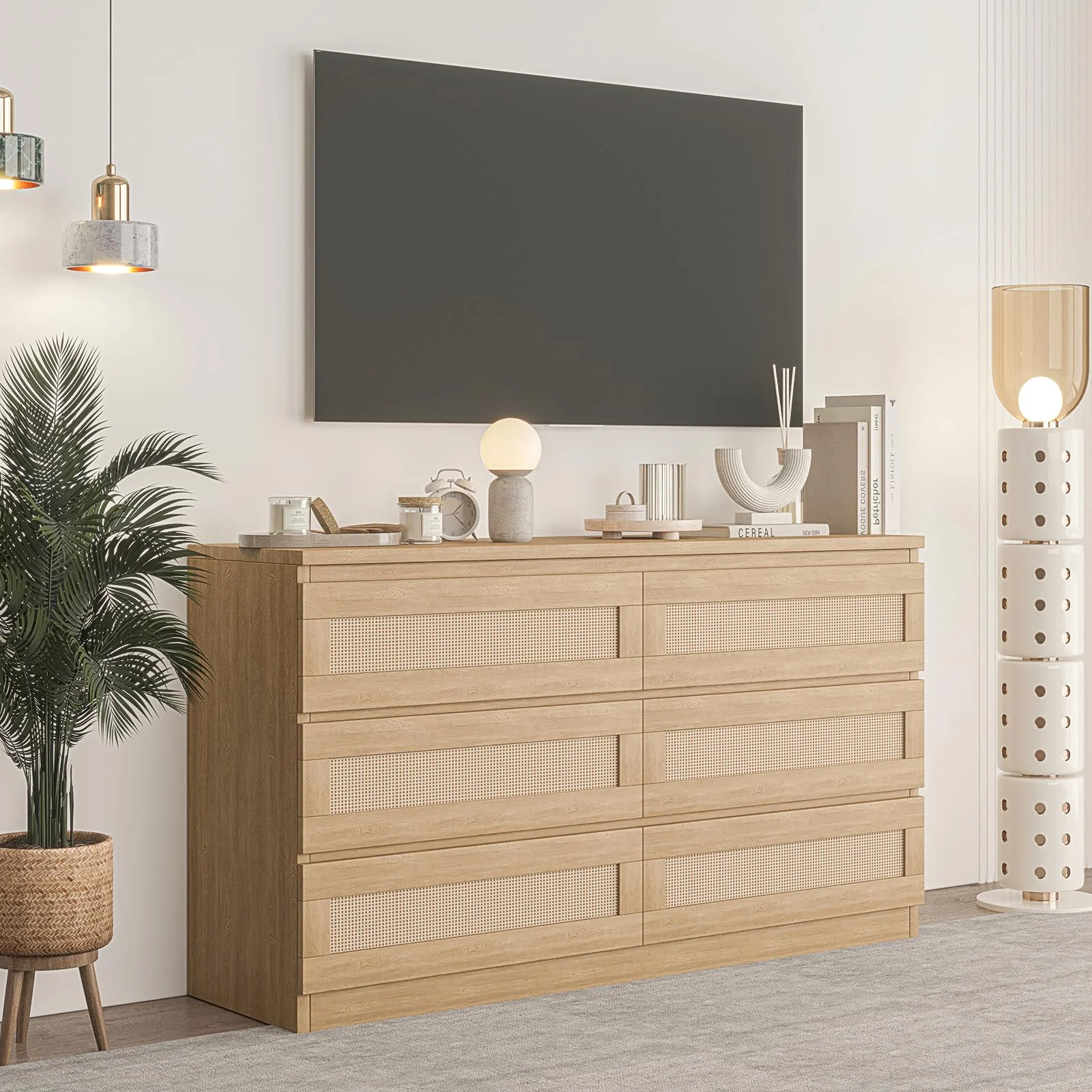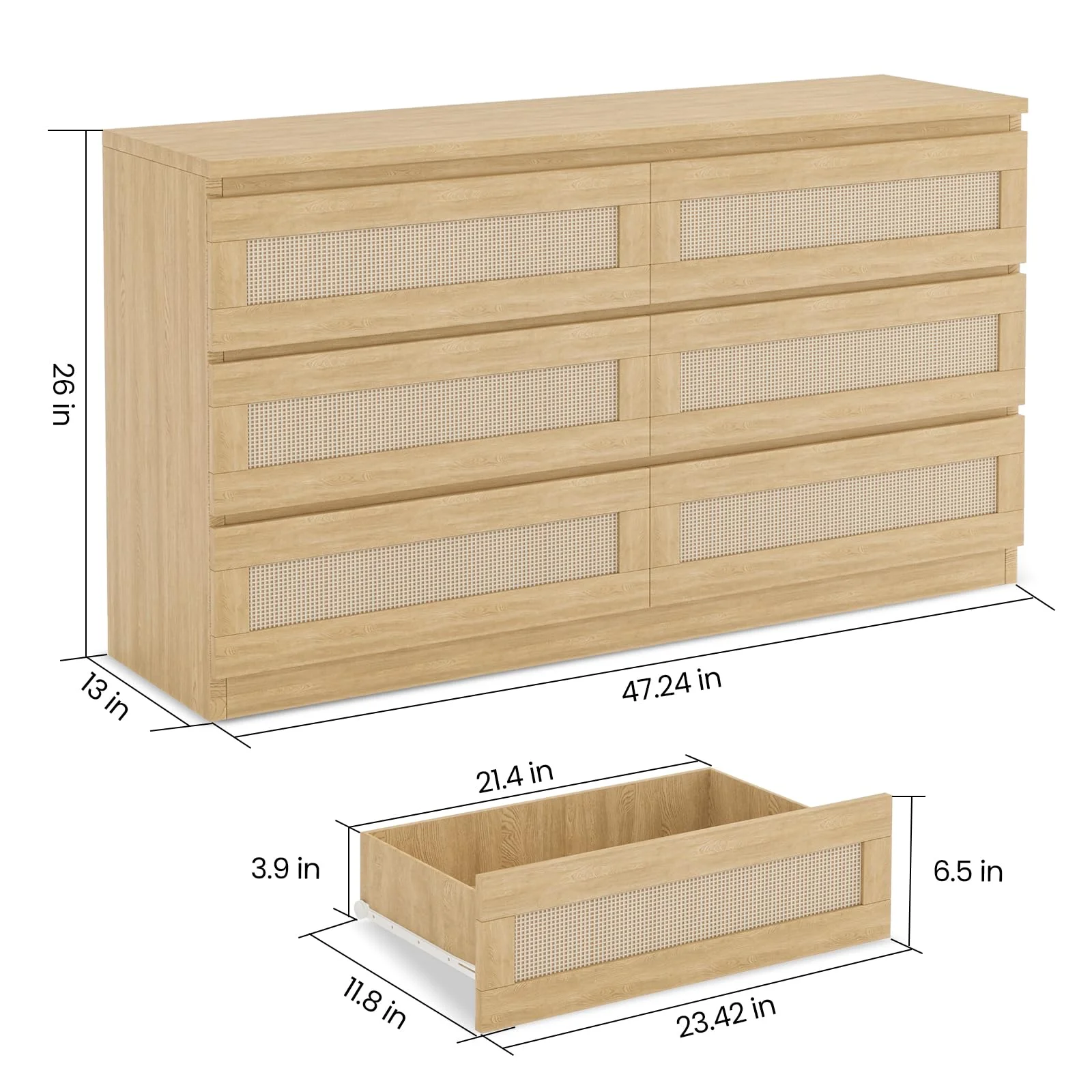 - Practical Bedroom Dresser: 6 widened and enlarged drawers provide spacious storage for your trivial clutter, and the wide tabletop can hold decorative items such as paintings, lamps, or flowers. Rattan chest of drawers not only help you organize your room, but also can be used as a decoration. Smooth metal Rails allow drawers to be pulled out and closed Smoothly and silently.