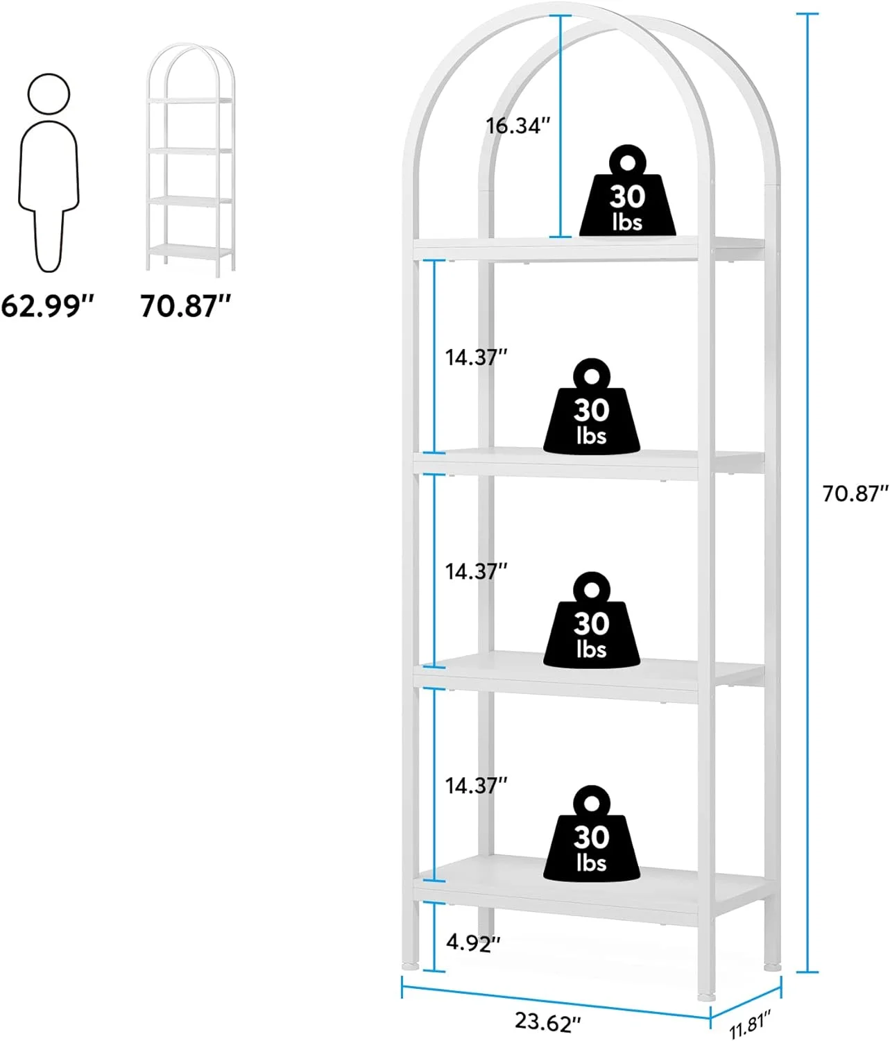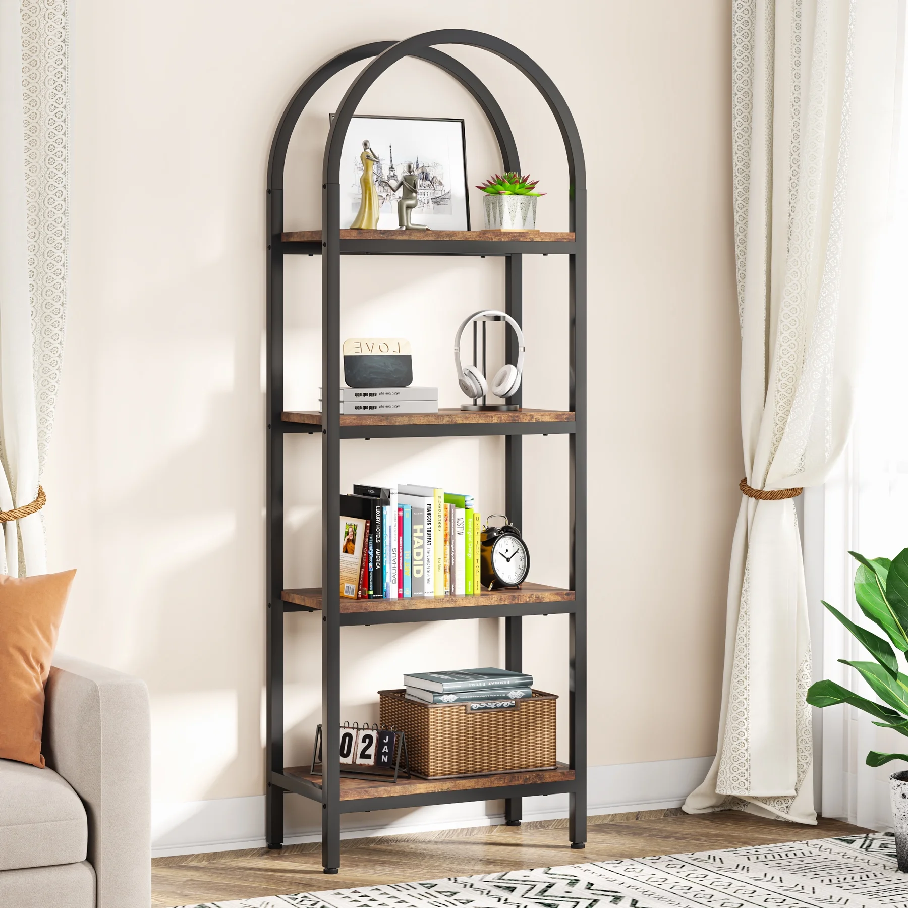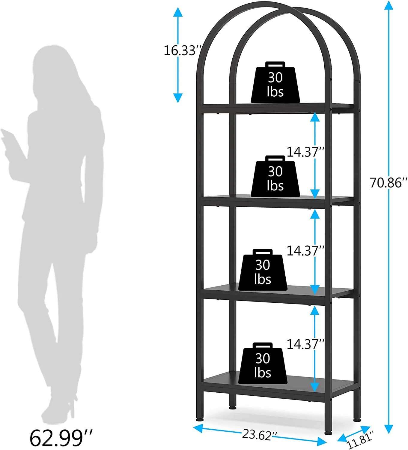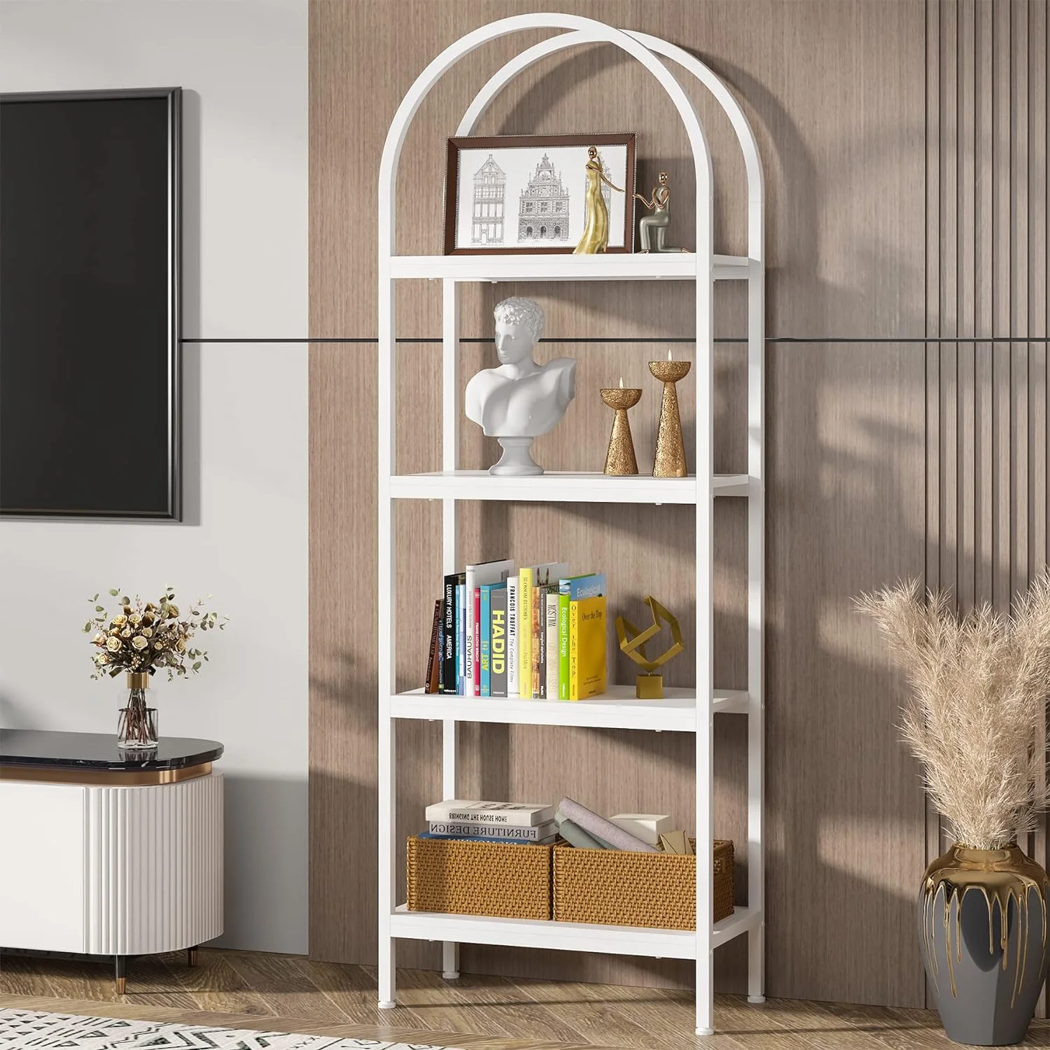 - Spacious Storage: The 4-tier arched bookcase offers a vast amount of storage space suited for a variety of items including books, photos, potted plants, or decorative pieces. Its space-enhancing nature also makes it perfect for showcasing awards and cherished keepsakes. Dimensions: dimensions 11.81" D x 23.62" W x 70.86" H