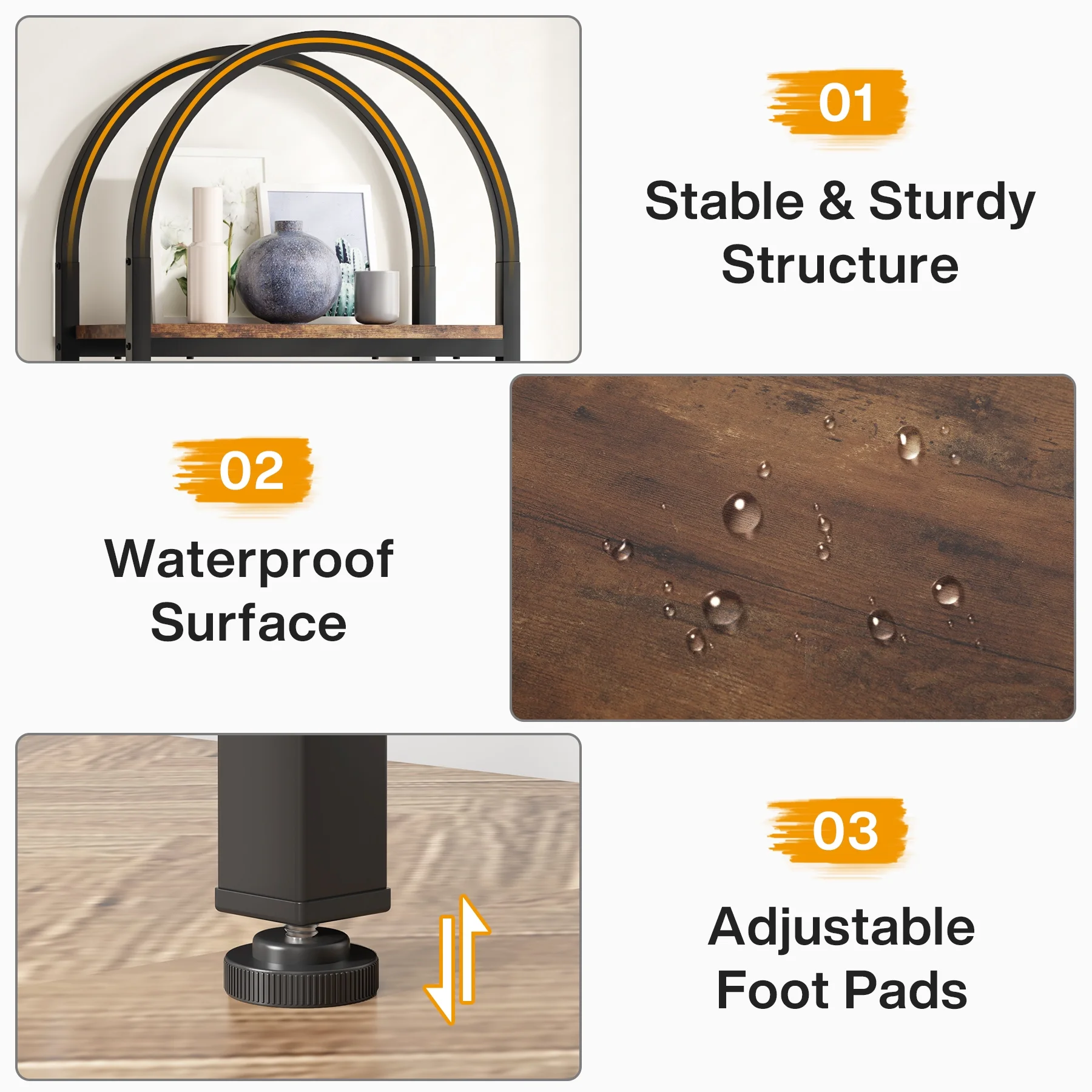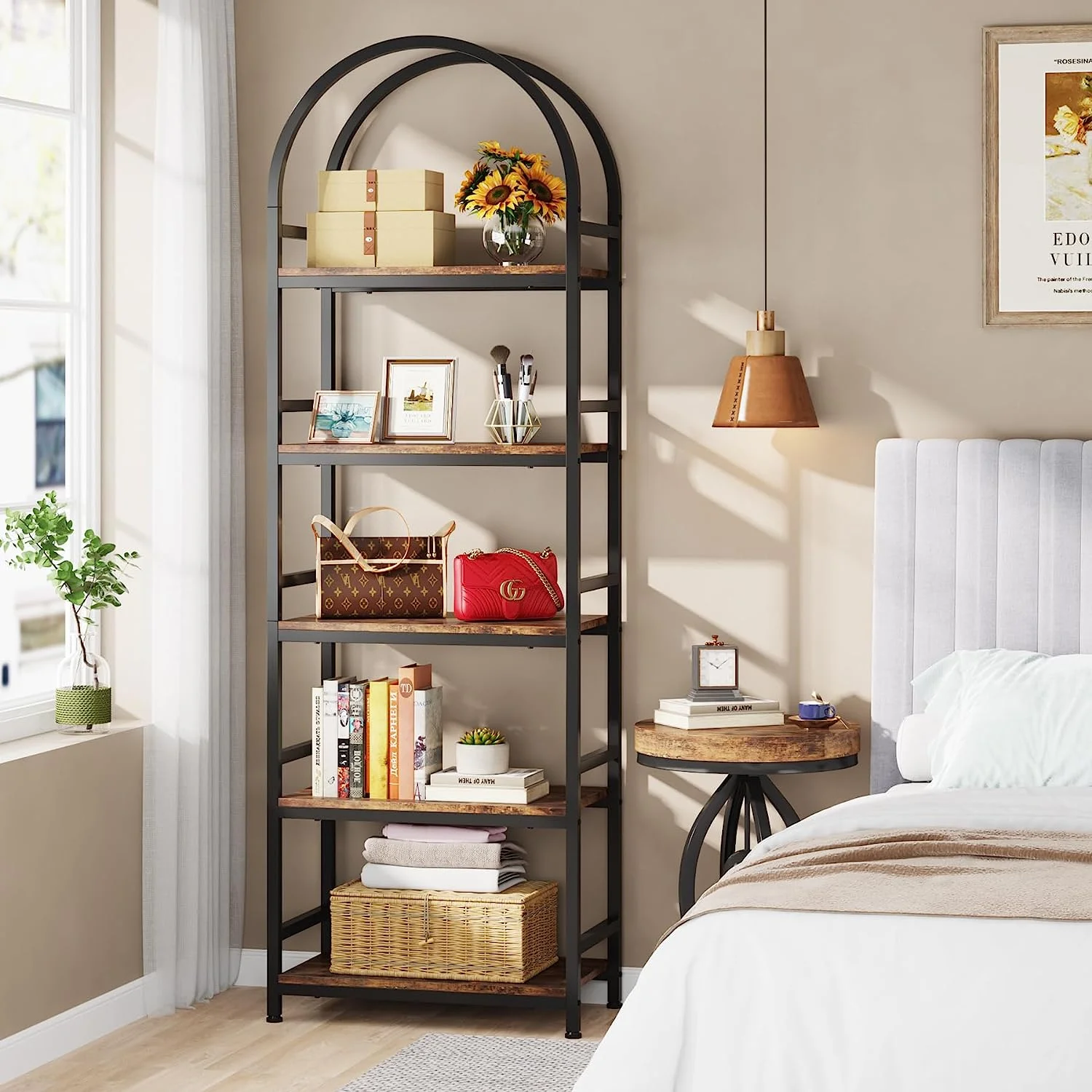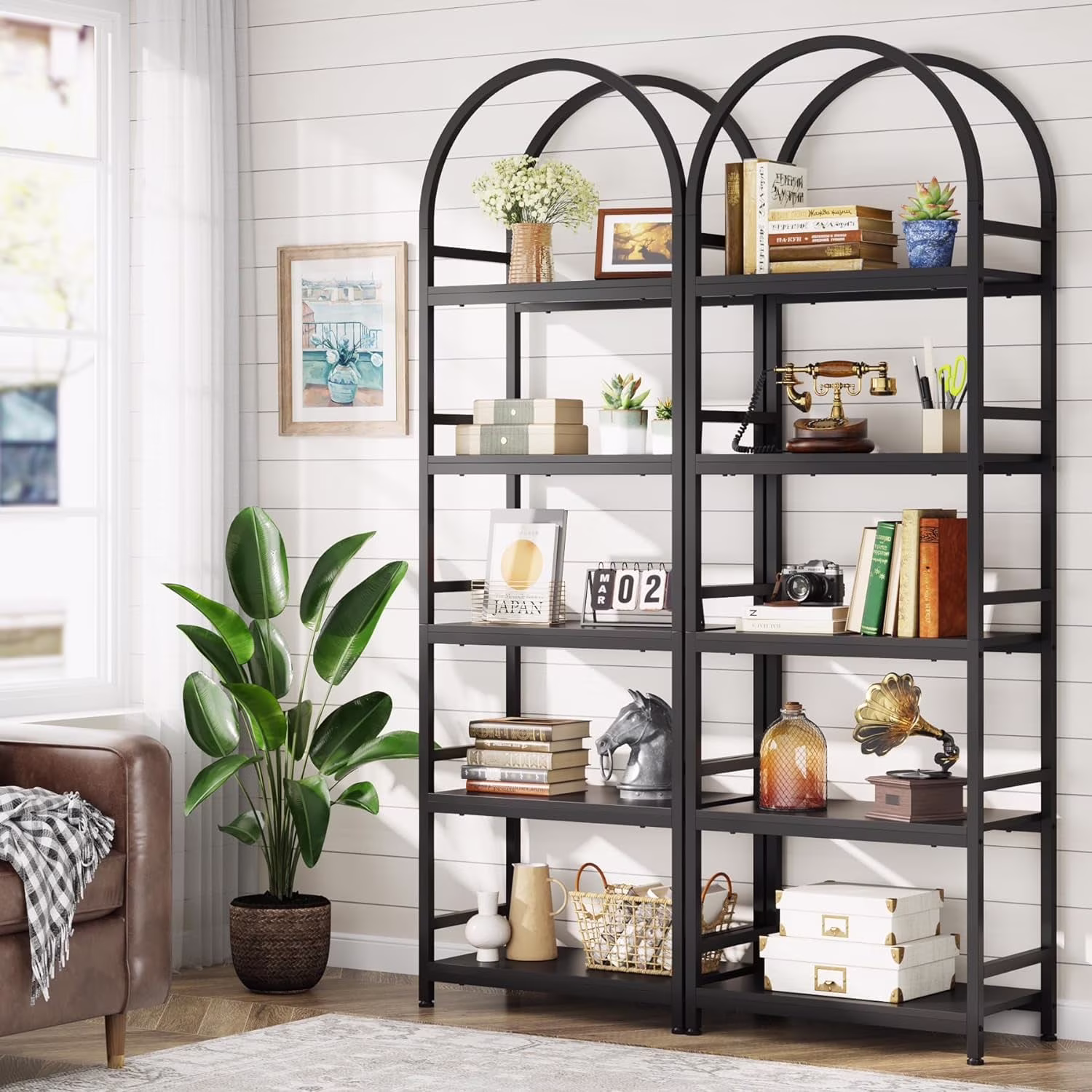 - Farmhouse Flair: Showcasing an elegant arched design characteristic of farmhouse style, this brown bookshelf skilfully combines rustic charm with modern aesthetics. It is versatile enough to complement almost all existing furniture and home decor.