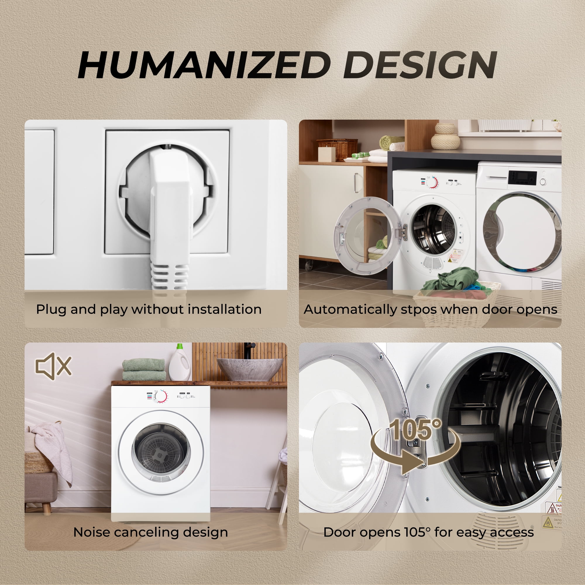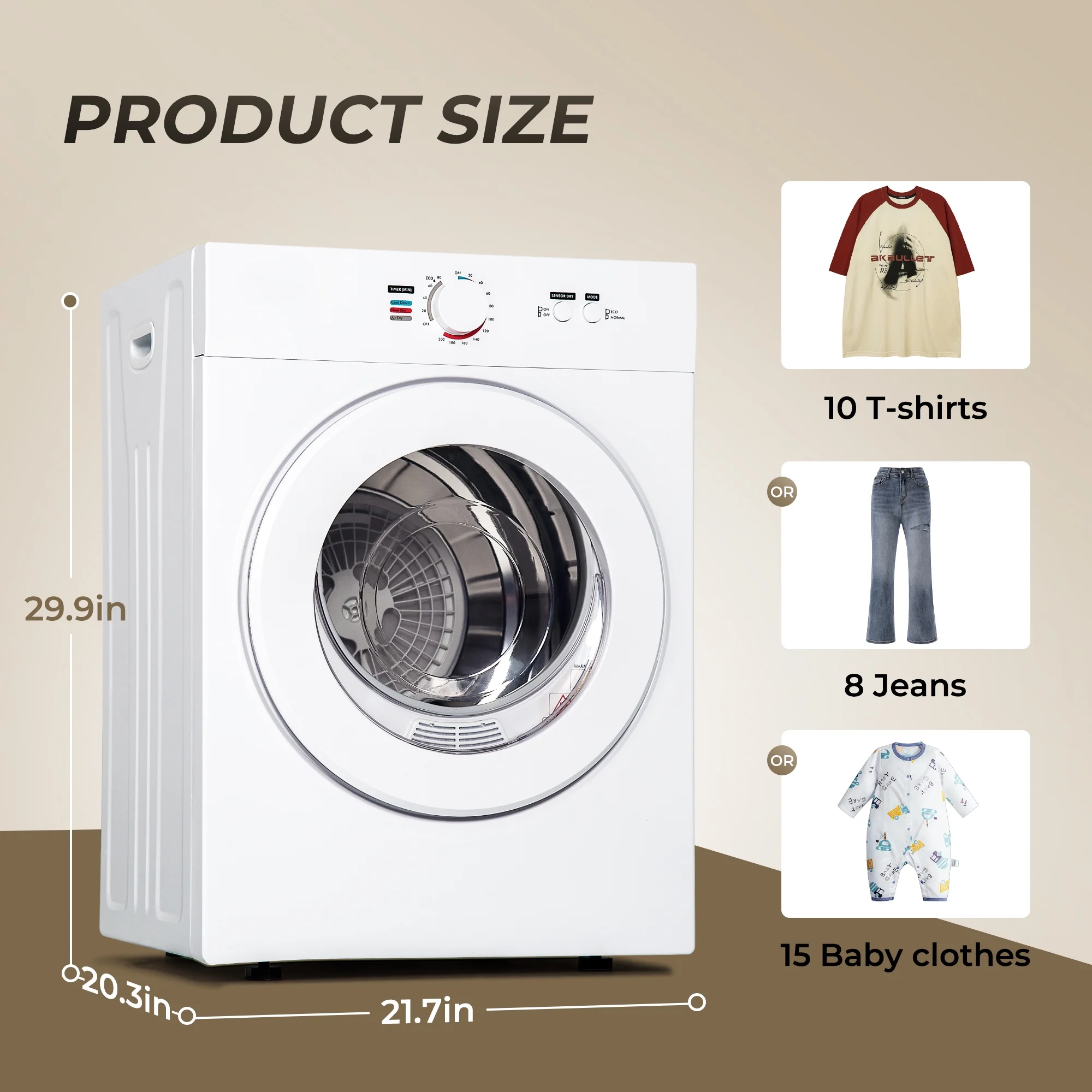 - 1-Year Warranty: Enjoy hassle-free laundry with our mini dryer, which includes user-friendly controls and essential accessories. Safety certifications provide added peace of mind, and a 1-year warranty is included for your convenience.