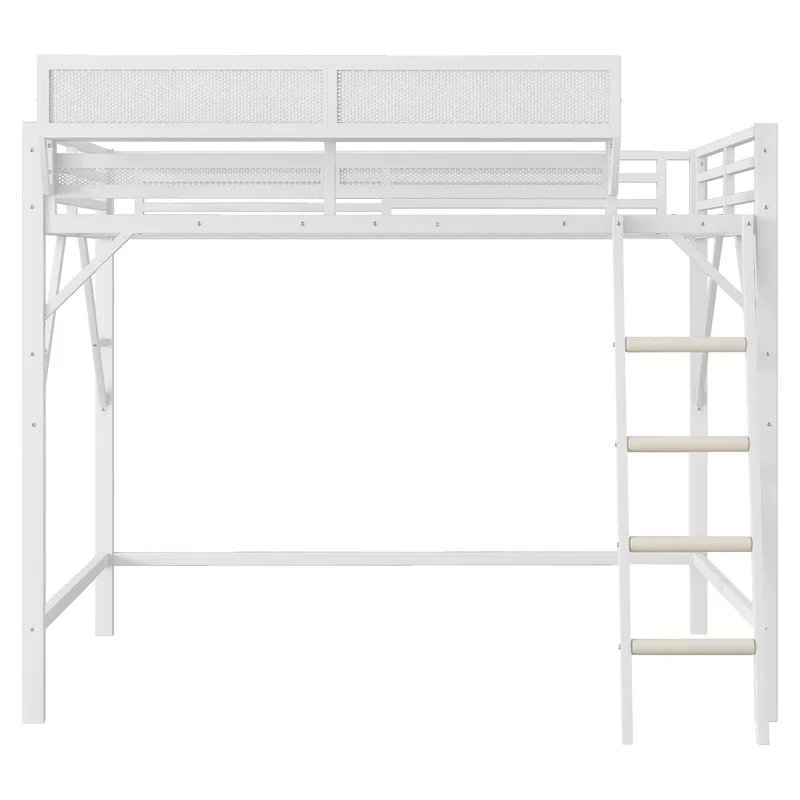 This queen-size steel loft bed includes integrated extended shelves on the upper level, offering convenient storage for books, accessories, or decor. The design maximizes vertical space while reducing clutter, making it ideal for organized living. Its heavy-duty construction ensures stability, supporting daily use without compromising safety or style.??Secure Climbing Ladder with MDF Steps