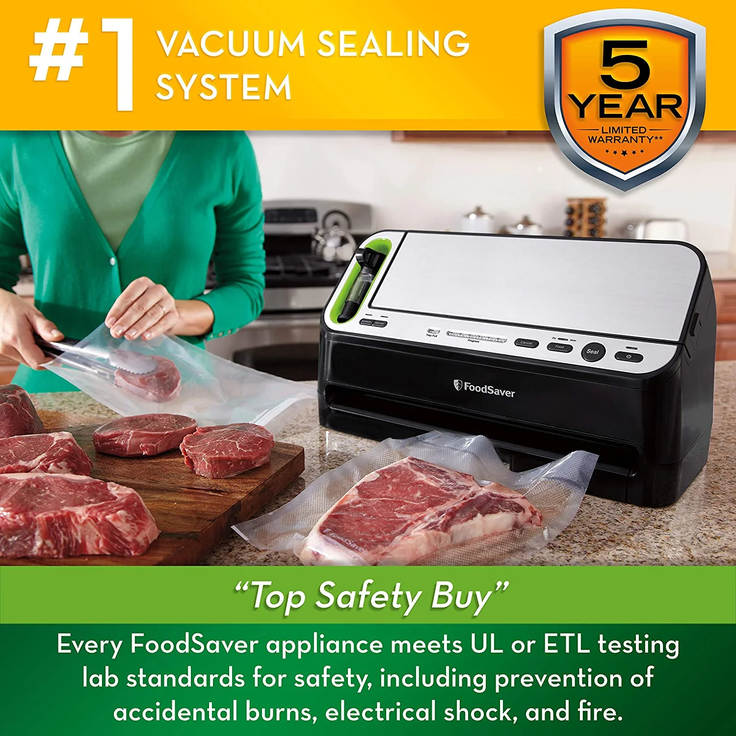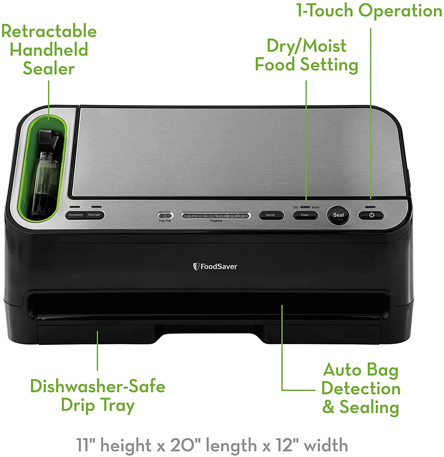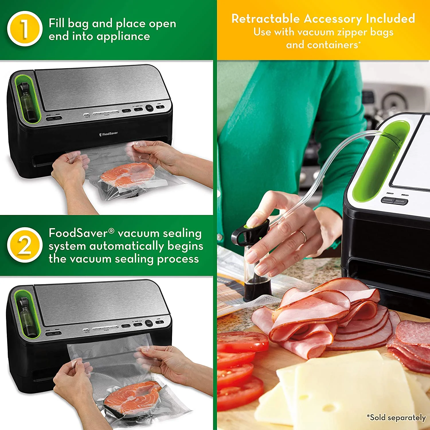 - Compatibility: Works with FoodSaver 8 inches and 11 inches vacuum seal rolls, all pre-made bag sizes, freshwater zipper bags, fresh containers, and quick Marinate; Optional accessories include FoodSaver regular and wide mouth mason jar sealers and FoodSaver bottle stoppers for wine and oil bottles